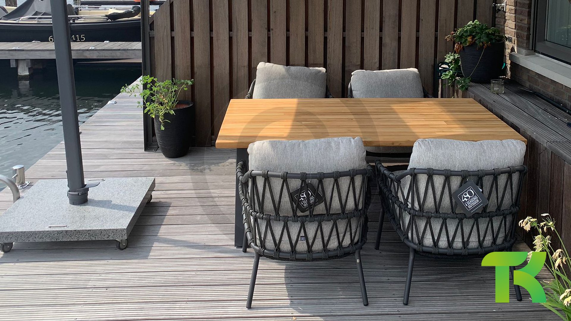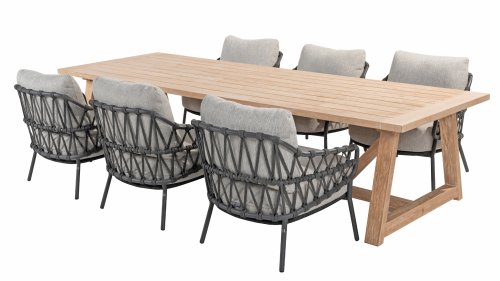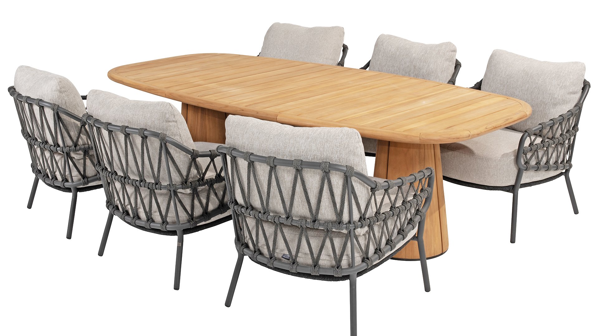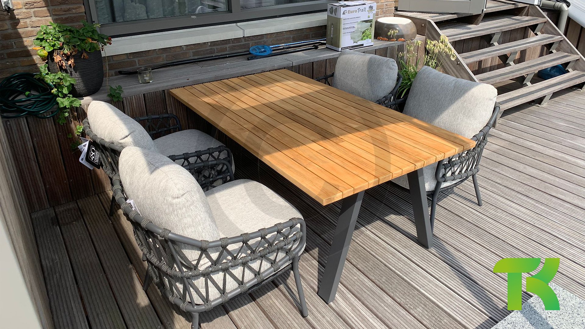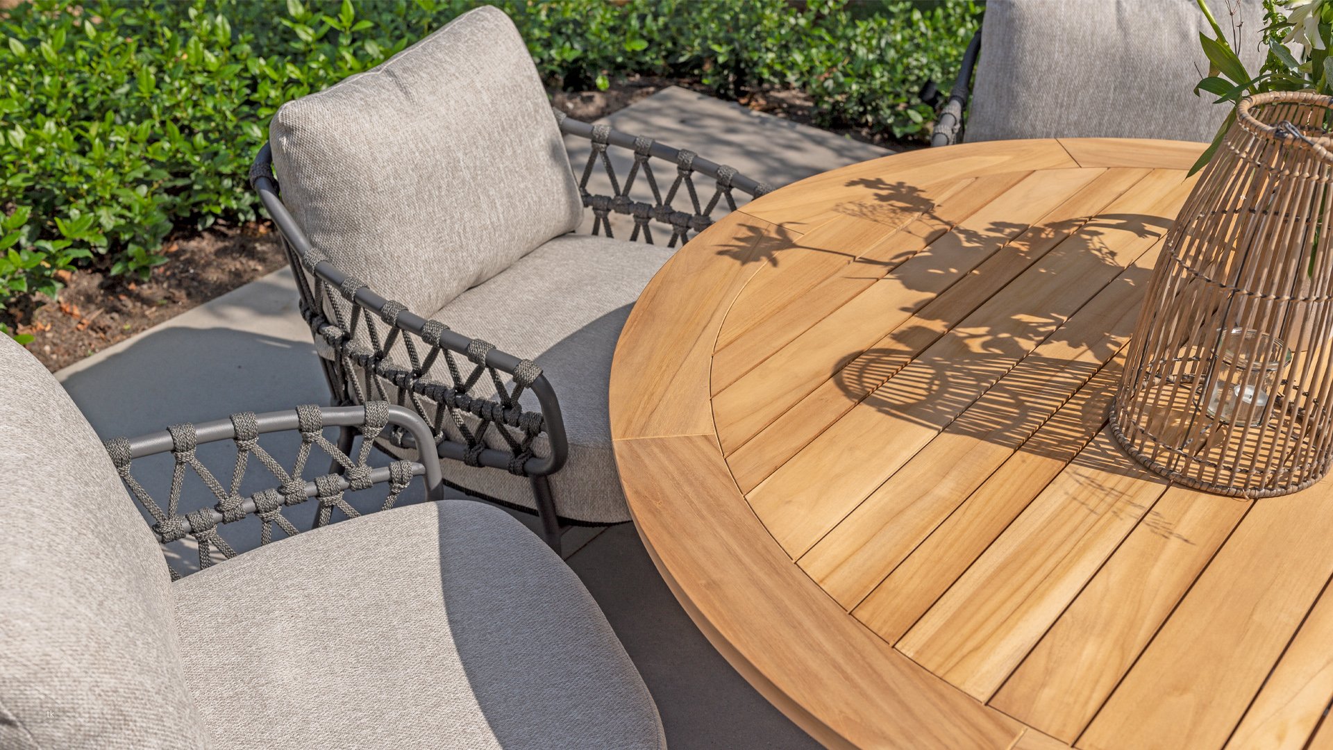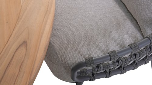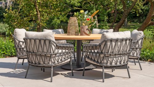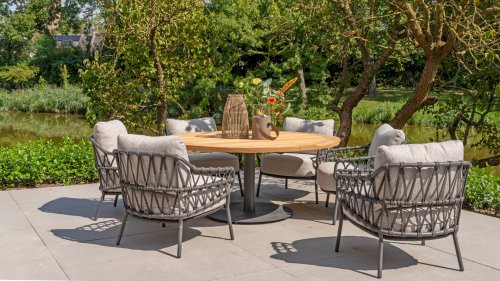 The Saba low dining table has a powder-coated stainless steel base with a teak wood tabletop. We recommend maintaining the teak wood with our maintenance products from 4 Seasons Outdoor to ensure long-lasting durability and a beautiful appearance. The Calpi chair consists of a stainless steel base with rope sections that are resistant to various weather conditions.