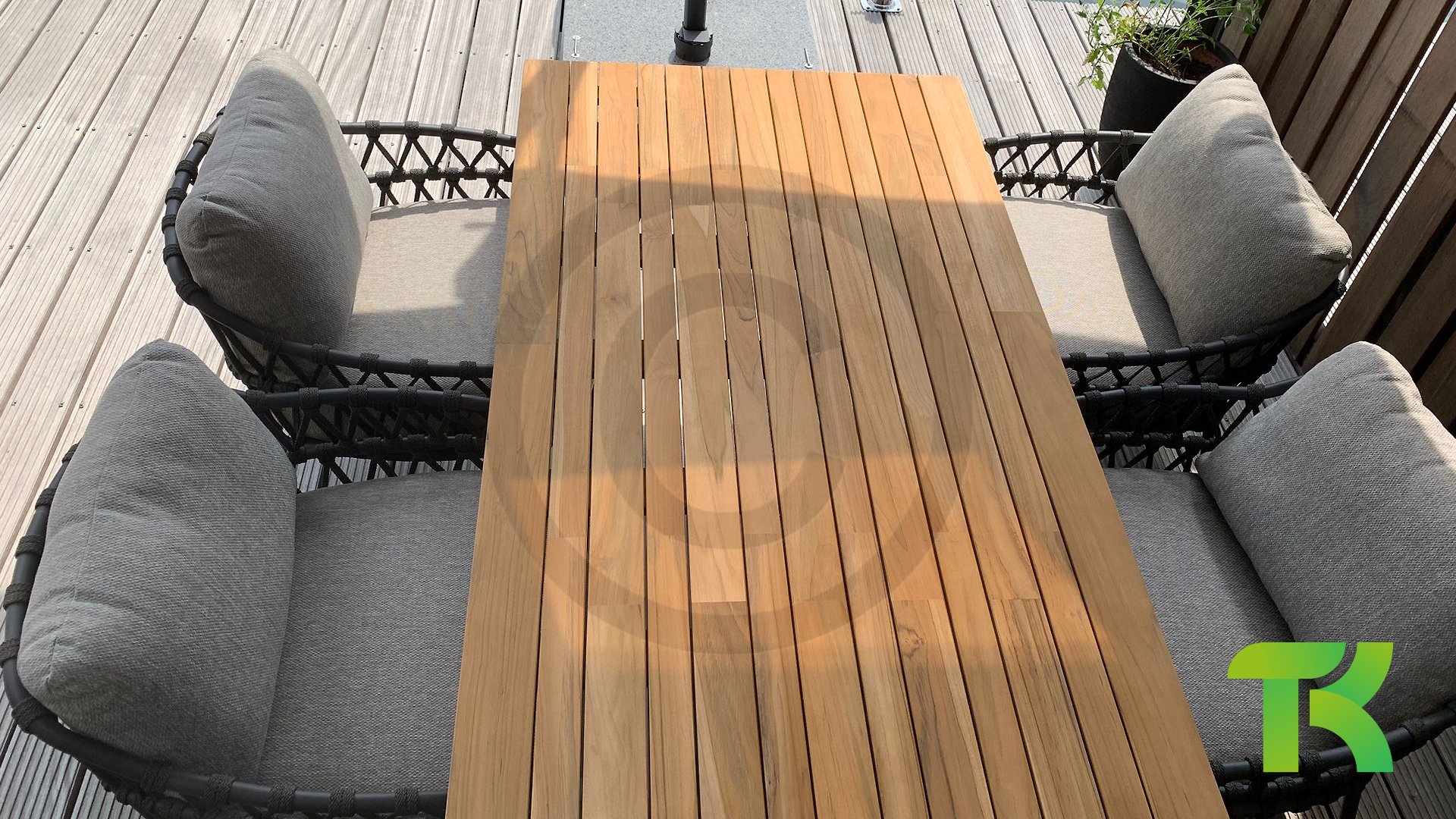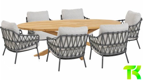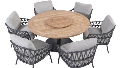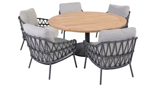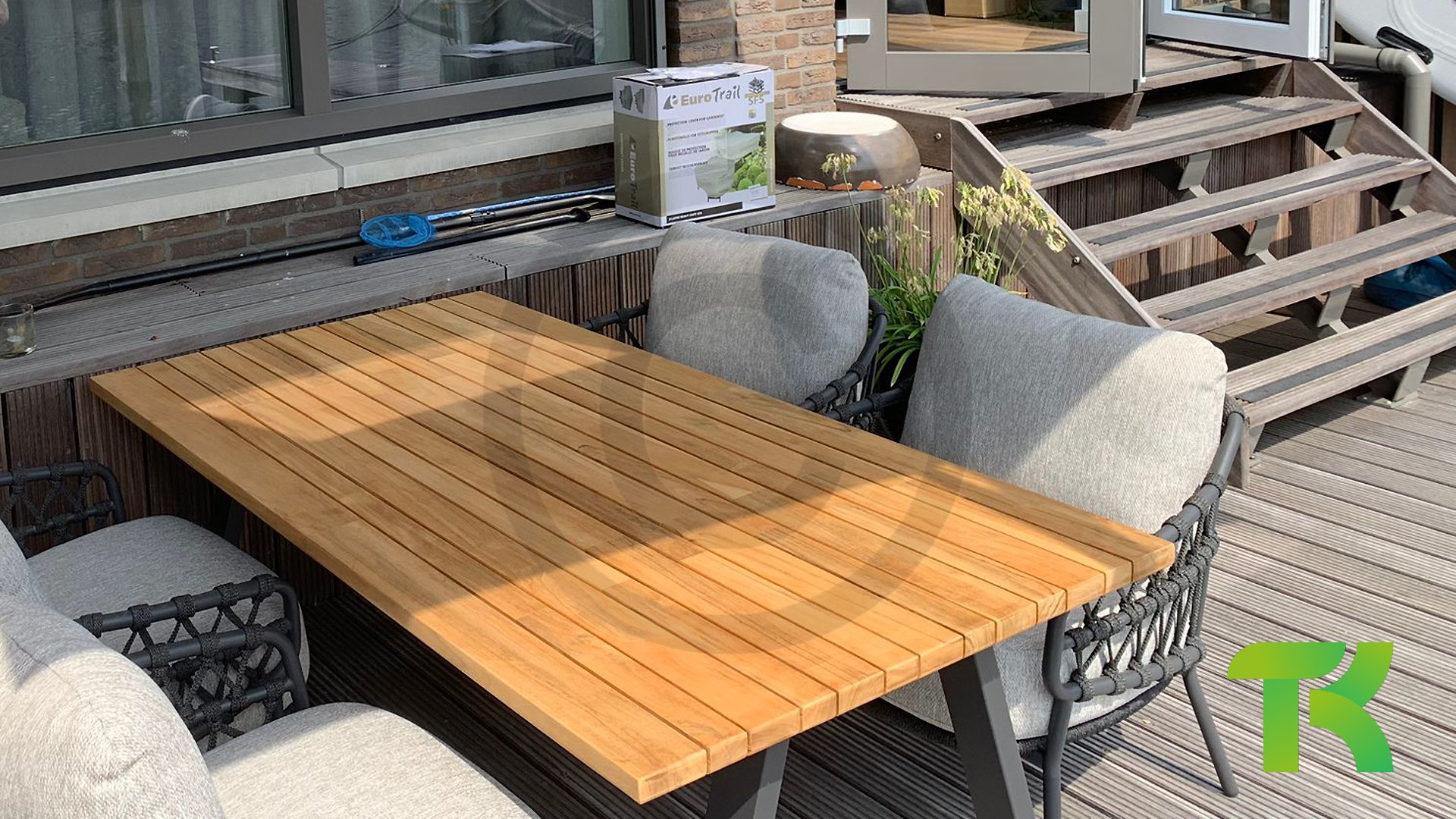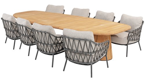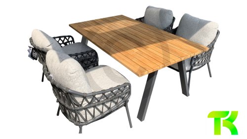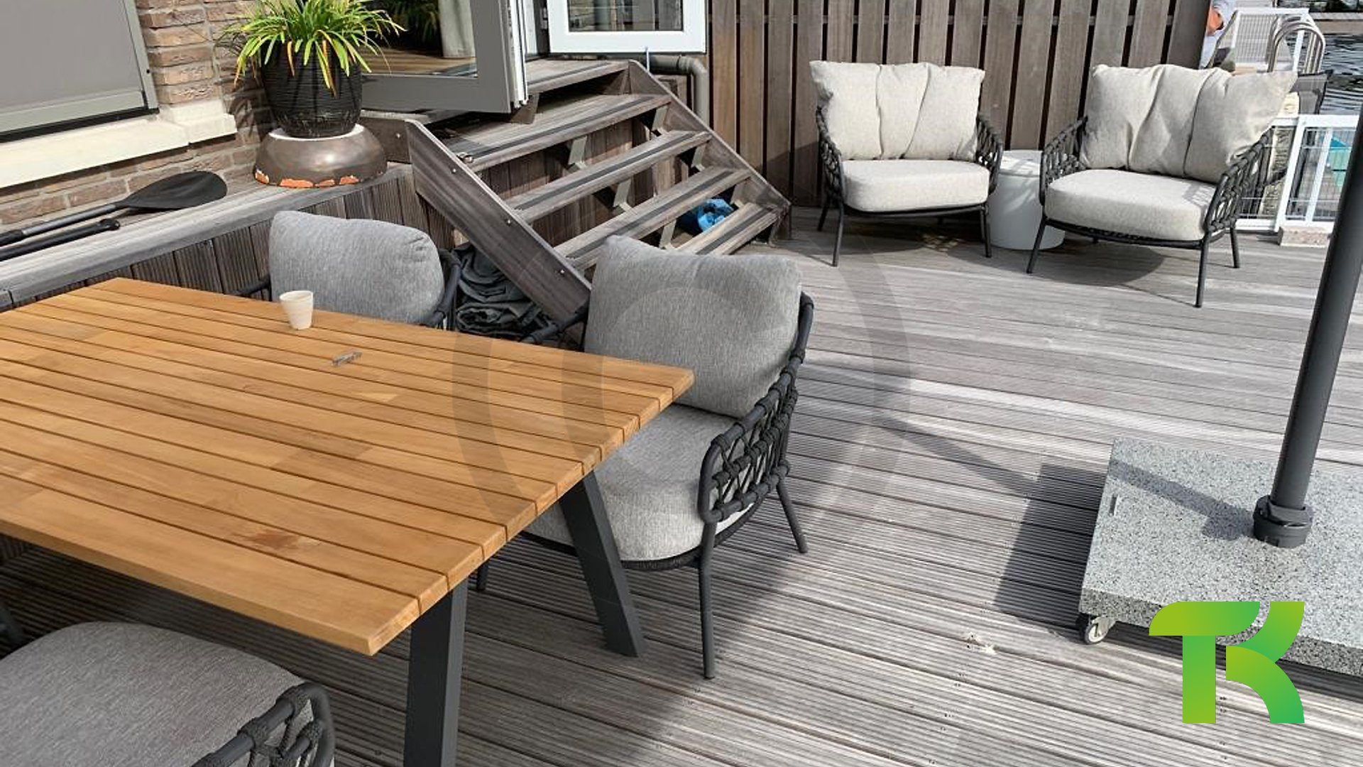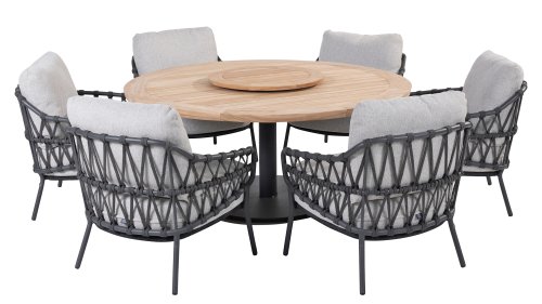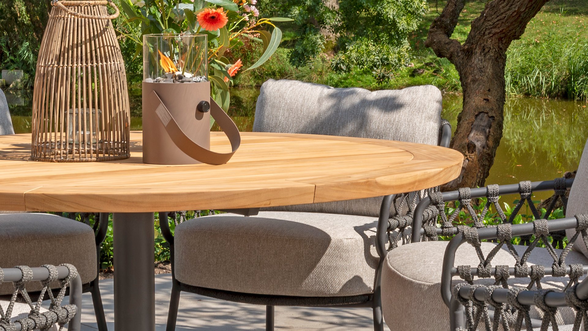 The Saba low dining table has a powder-coated stainless steel base with a teak wood tabletop. We recommend maintaining the teak wood with our maintenance products from 4 Seasons Outdoor to ensure long-lasting durability and a beautiful appearance. The Calpi chair consists of a stainless steel base with rope sections that are resistant to various weather conditions.