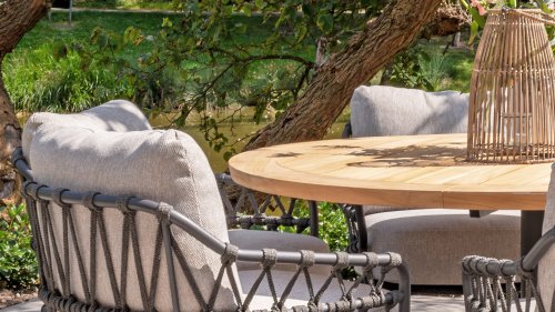 Low dining is a combination of dining and lounging, combining the best of both worlds. The low dining chairs have a slightly lower seat height than a normal dining chair. 4 Seasons Outdoor also has some tables in its collection that are compatible with this height. The Saba low dining table is shown here, but you can also take a look at the Ambassador low dining table.