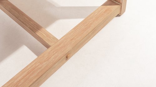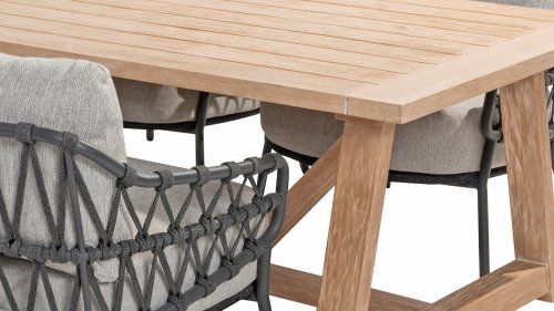 Teak is a natural product and particularly suitable for outdoor use. It is resistant to pests and fungi and can withstand sun, rain, and snow. Over time, teak develops a silver-gray patina. Teak is a robust material that requires little maintenance. If you prefer the original color of teak, you can easily prevent graying by regularly using our care products. Teak can also be cleaned with mild soap. We provide a warranty on all production and construction defects. Natural movement of the wood is not included in the warranty.