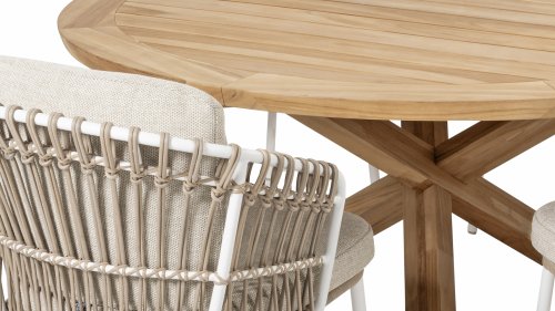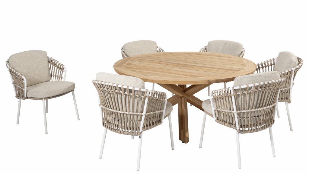White dalias at the beach Close your eyes and imagine yourself in Ibiza. The summery atmosphere that the 4 Seasons Outdoor Dalias Dining series exudes through the white frame, and the taupe braiding gives your garden an immediate sunny boost. If you love summer, you'll love Dalias.