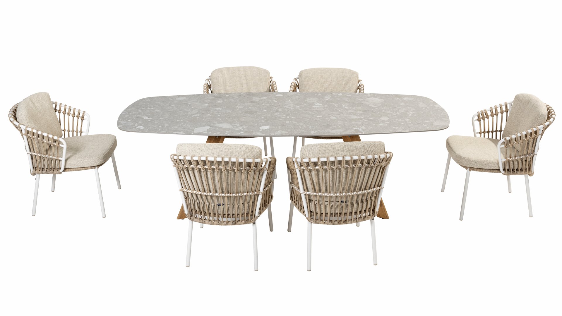 The 4Seasons Outdoor Montana is a beautiful table that immediately catches the eye. It not only looks modern, but is also incredibly practical due to the shape of the table top. The table stands out with its Danish oval table top, which creates enough space on all sides of the table. Within the Montana series, there are different options; you can combine the 240 cm terrazzo ceramic top with a stainless steel or teak base. Within the Montana series, there is also a 280 cm table with HPL top.