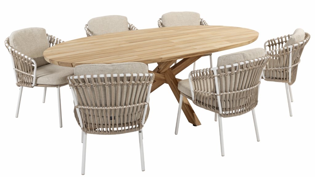 White dalias on the beach Close your eyes and imagine yourself in Ibiza. The summer atmosphere conveyed by the 4 Seasons Outdoor Dalias Dining series with its white frame and taupe wickerwork instantly gives your garden a sunny boost. If you love summer, you'll love Dalias.