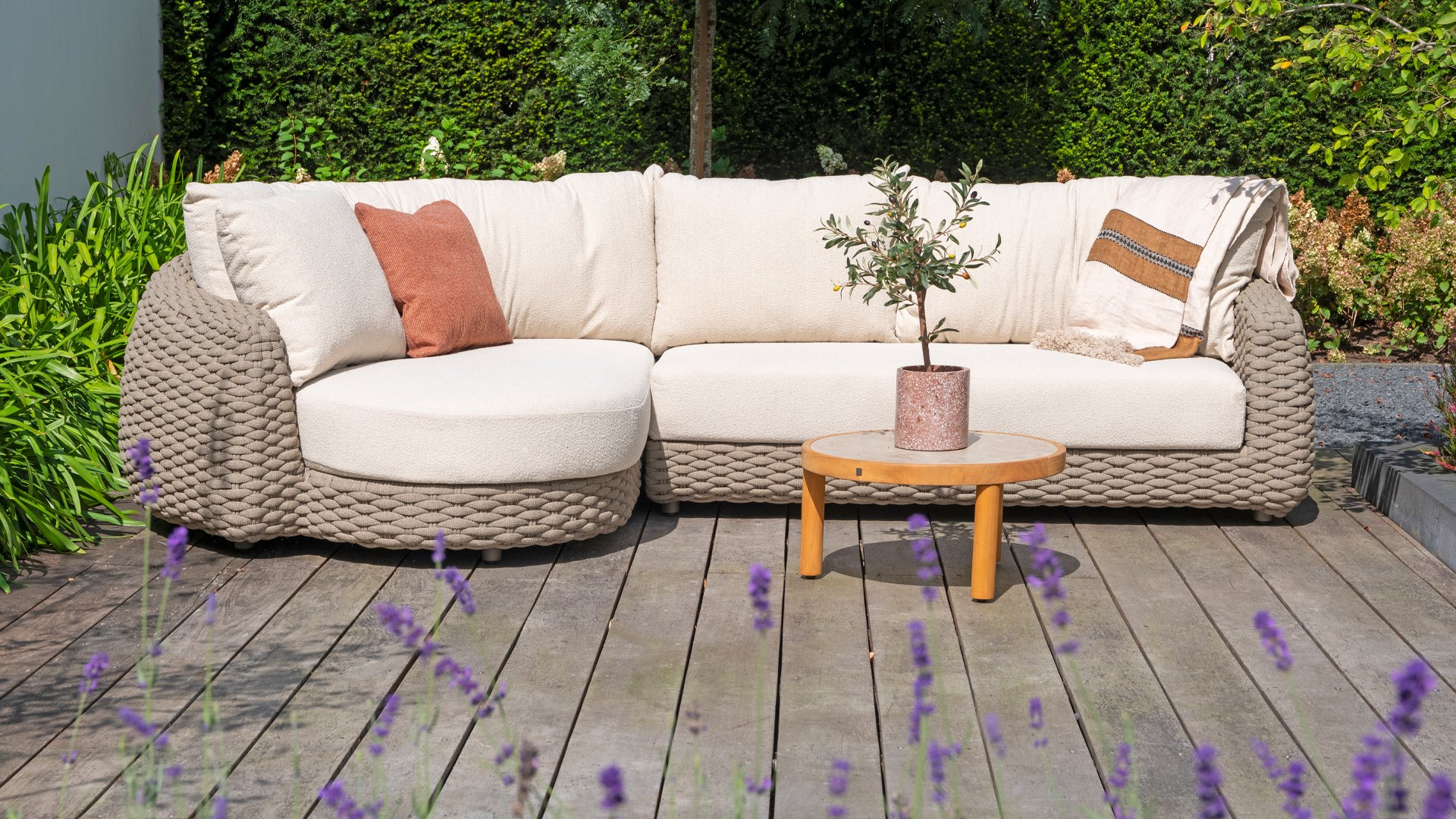 This beautiful material is perfect for outdoor use, because 4SO Rope is not just an shoelace. Our round wires have a synthetic core. This polypropylene base ensures minimal stretching of the rope and also does not absorb moisture. The covering is made of an acrylic fabric, similar to the weather-resistant fabric of our garden cushions. This covering feels soft but is highly water-repellent, UV-resistant, and colorfast. The flat rope variants have the same mix of weather-resistant materials, but the polypropylene material is interwoven with the acrylic fabric. This technique gives the flat rope the same properties but a completely different look. The stretch is minimal, and 4 Seasons Outdoor garden furniture with Rope is suitable for people weighing up to 110 kg. It's therefore an exceptionally strong material, but it's important to be careful with sharp objects. Our  Rope is weather-resistant, but a sharp object can seriously damage your garden furniture. We offer exclusive designs using hand-woven Rope patterns and techniques.