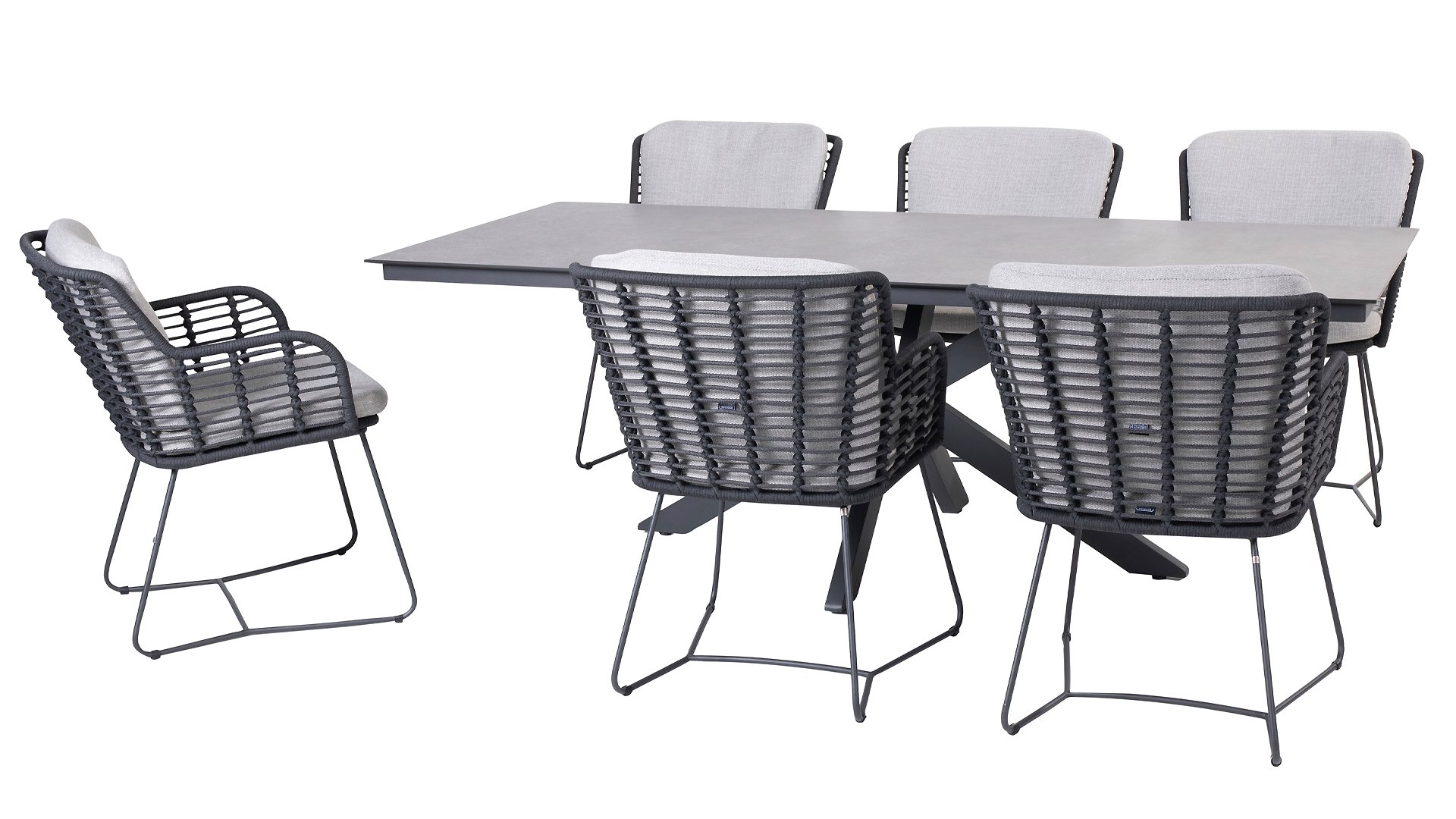 Made from the best materials, crafted with passion. This beautiful 4Seasons Fabrice dining series not only has flair but also excellent seating comfort. The chair is also available in the following colors: Anthracite, Latte and Terre. The materials used are synthetic rope, olefin & aluminum. Synthetic rope has a core that ensures color fastness and makes it mold-resistant. Olefin also makes the cushions color fast and water-resistant, and the fabric feels comfortable. The frame of the Fabrice is powder-coated aluminum to complete the sleek design! Also available in lounge: 4SO Fabrice Corner Lounge Set & 4SO Fabrice Lounge Set.