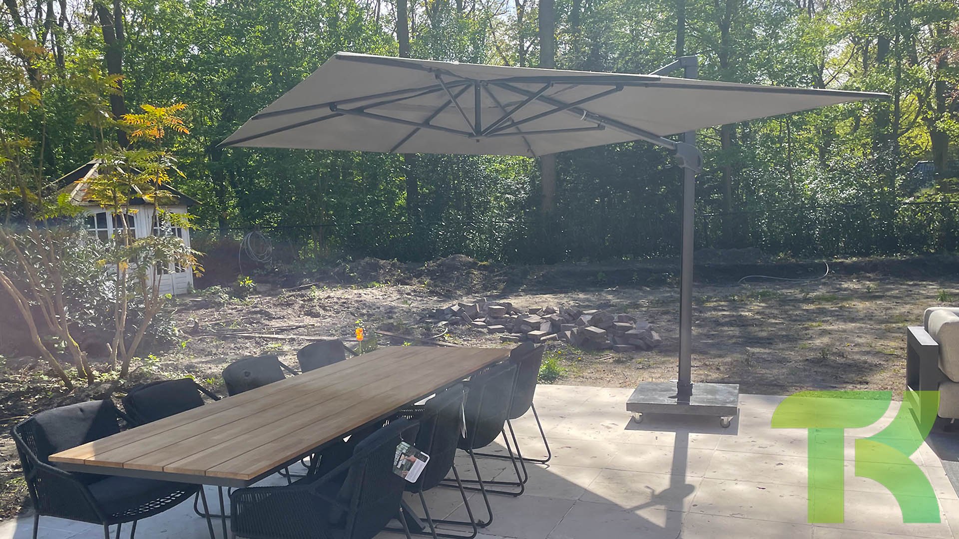 The 4Seasons hanging parasol has become a true classic. This cantilever parasol has proven its quality over time. The parasol can tilt backward to catch the low sun. It can also rotate on the base. See the video for more information. Standard 5-year warranty.