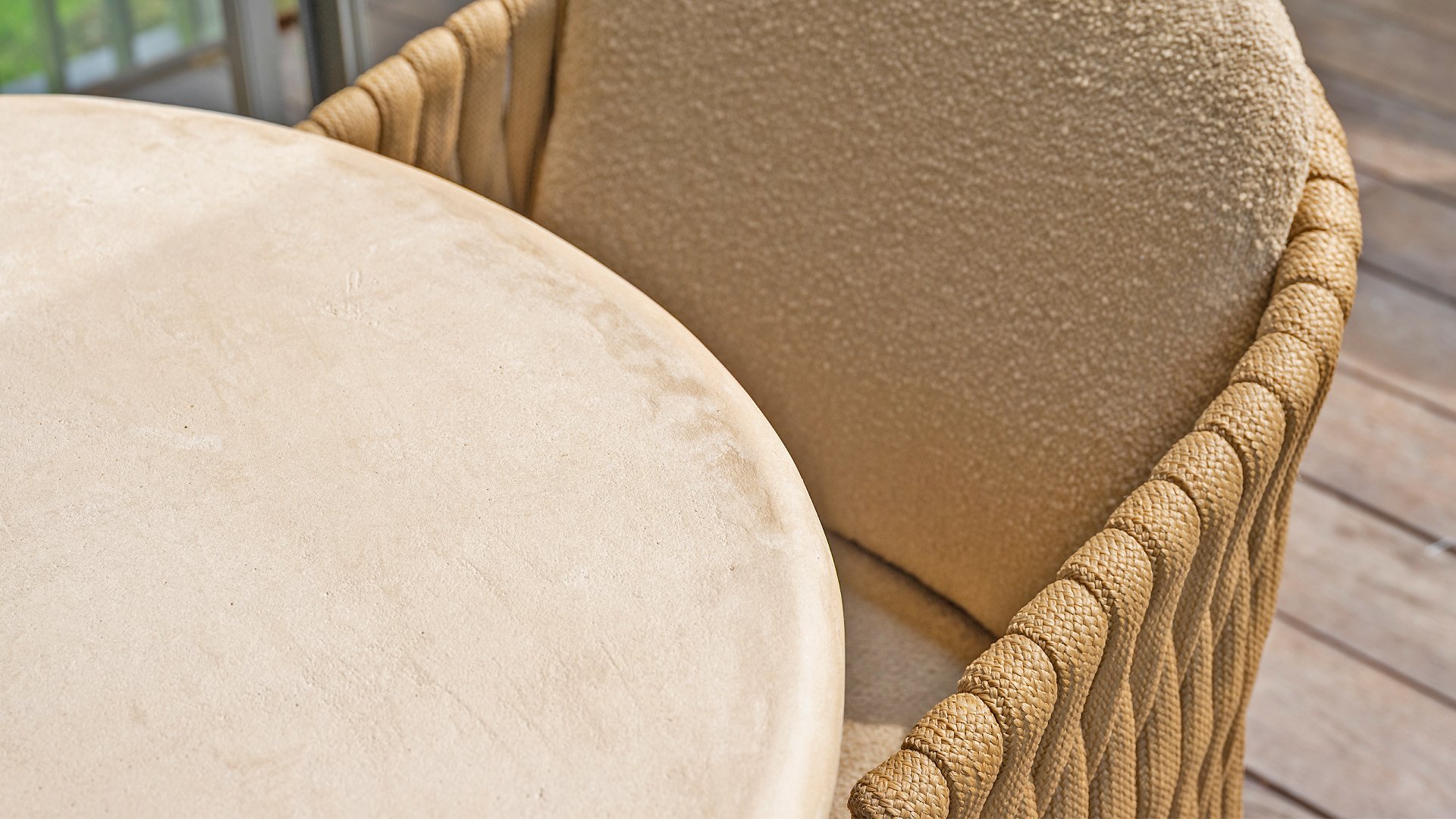 The Hampton is crafted from high-quality Mortex, a durable and waterproof material known for its natural look and exceptional weather resistance. Each tabletop is hand-finished, creating a unique, warm look that effortlessly complements both modern and Mediterranean gardens.