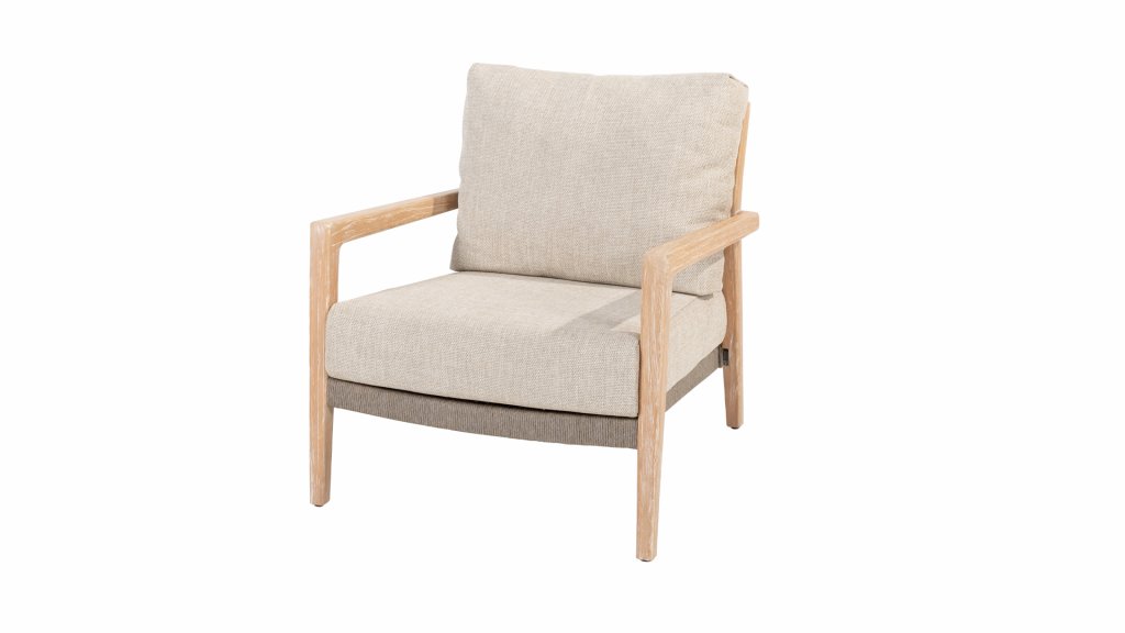Experience timeless elegance and durability with the 4 Seasons Outdoor Julia low dining chair made of brushed teak. This chair comes with cushions and features a beautiful high-quality teak frame finished with rope in the color taupe. The teak is brushed, meaning it has a rough, natural finish with light highlights in the grooves. This finish is unique and gives this outdoor furniture a distinctive look.