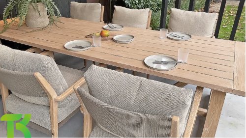 Teak is a natural product and is particularly suitable for outdoor use. It is resistant to pests and fungi and can withstand sun, rain, and snow. Over time, teak develops a silver-grey patina. Teak is a robust material that requires little maintenance. If you prefer the original color of the teak, you can easily prevent it from greying by regularly using our care product. Teak can also be cleaned with green soap. We provide a warranty on all manufacturing and construction defects. The natural movement of teak is not included in this warranty. When you choose teak, we assume that you appreciate these characteristics. Small cracks that may appear, knots in the wood, rough surfaces, or irregular discolorations over time are not covered by our warranty. These features give teak its unique character and appearance and are part of its natural properties. Be careful when placing flowerpots or vases on your teak garden table, as they may cause persistent rings or color differences. Imperfections often occur—these irregularities are characteristic of this product. Such variations can never be grounds for a claim, warranty, or complaint. They are a sign of authenticity! The teak is brushed, meaning it has a rough, natural finish with light highlights in the grooves. This finish is unique and gives the outdoor furniture a distinctive look.