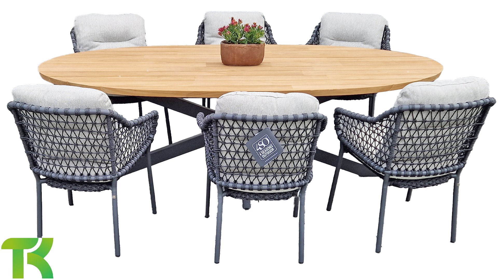 Jura's natural beauty The 4 Seasons Outdoor Jura Anthracite combines anthracite tones with the subtlety of the knotted rope. Beautiful on a teak table and you can also stack it. Take a seat and enjoy. Experience the perfect combination of comfort, natural look, and modern design with the 4SO Jura stackable dining chair Olive. This chair comes with cushions. The Jura has an attractive olive rope weaving and an elegant olive stainless steel frame. We also have the Jura available in Olive Green: 4 Seasons Outdoor Jura Olive.