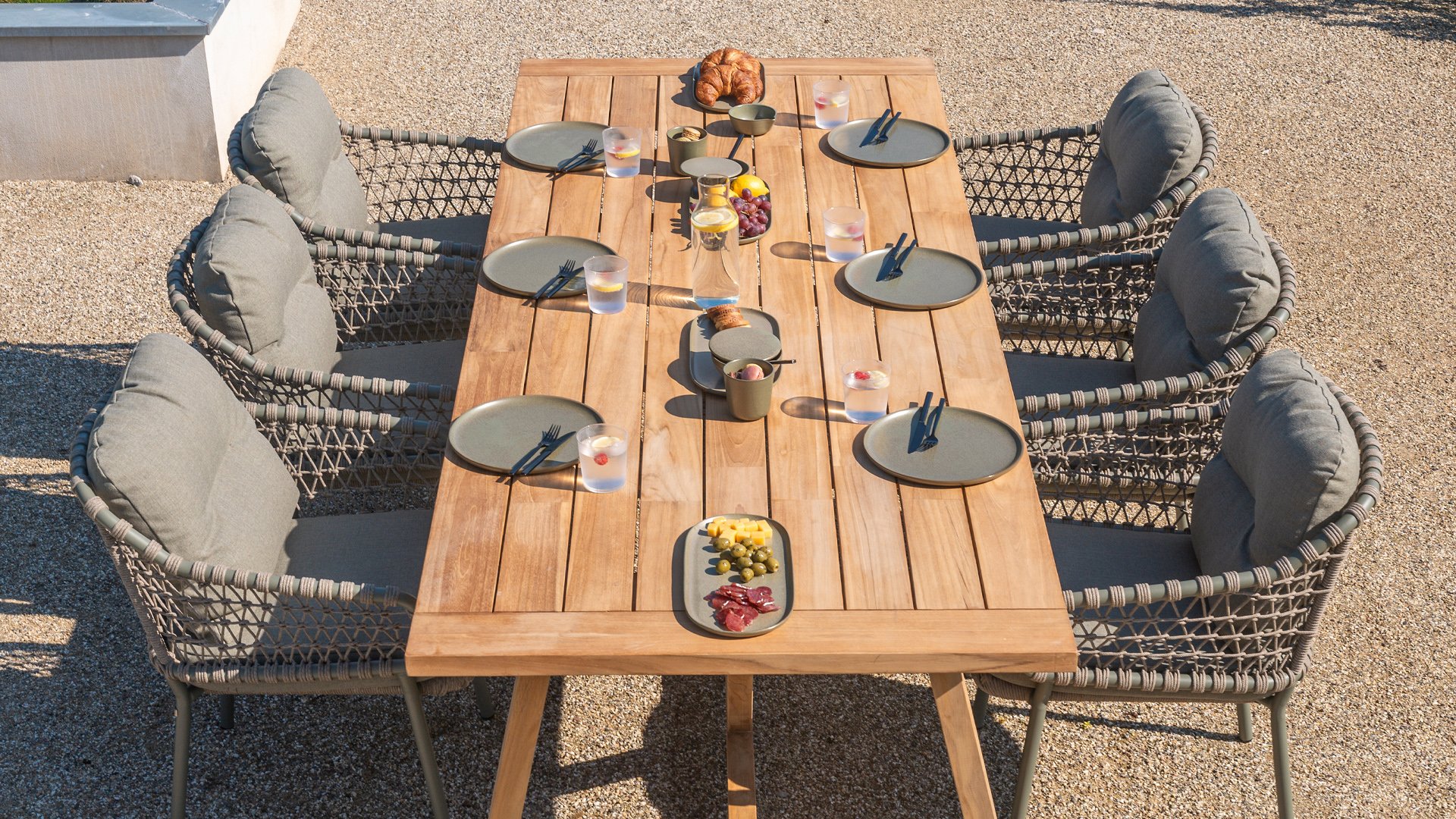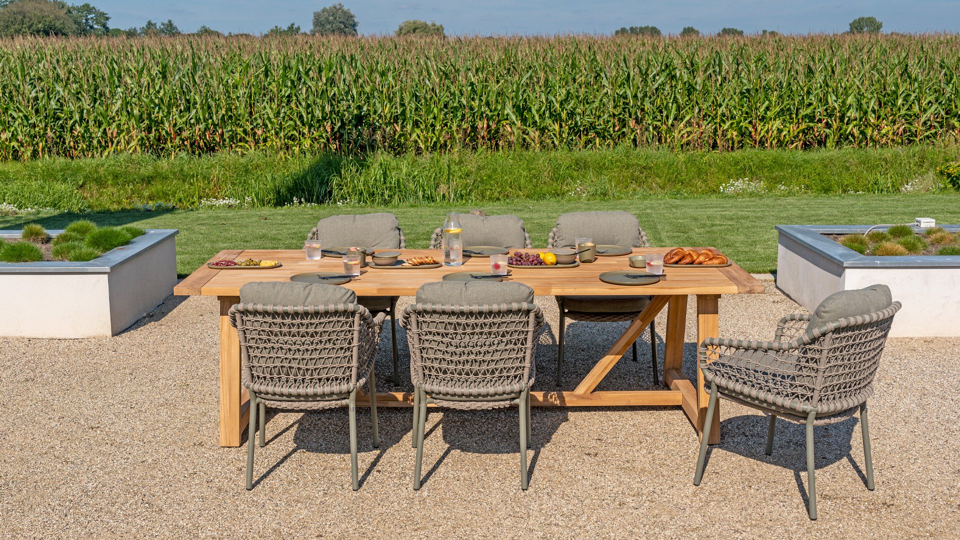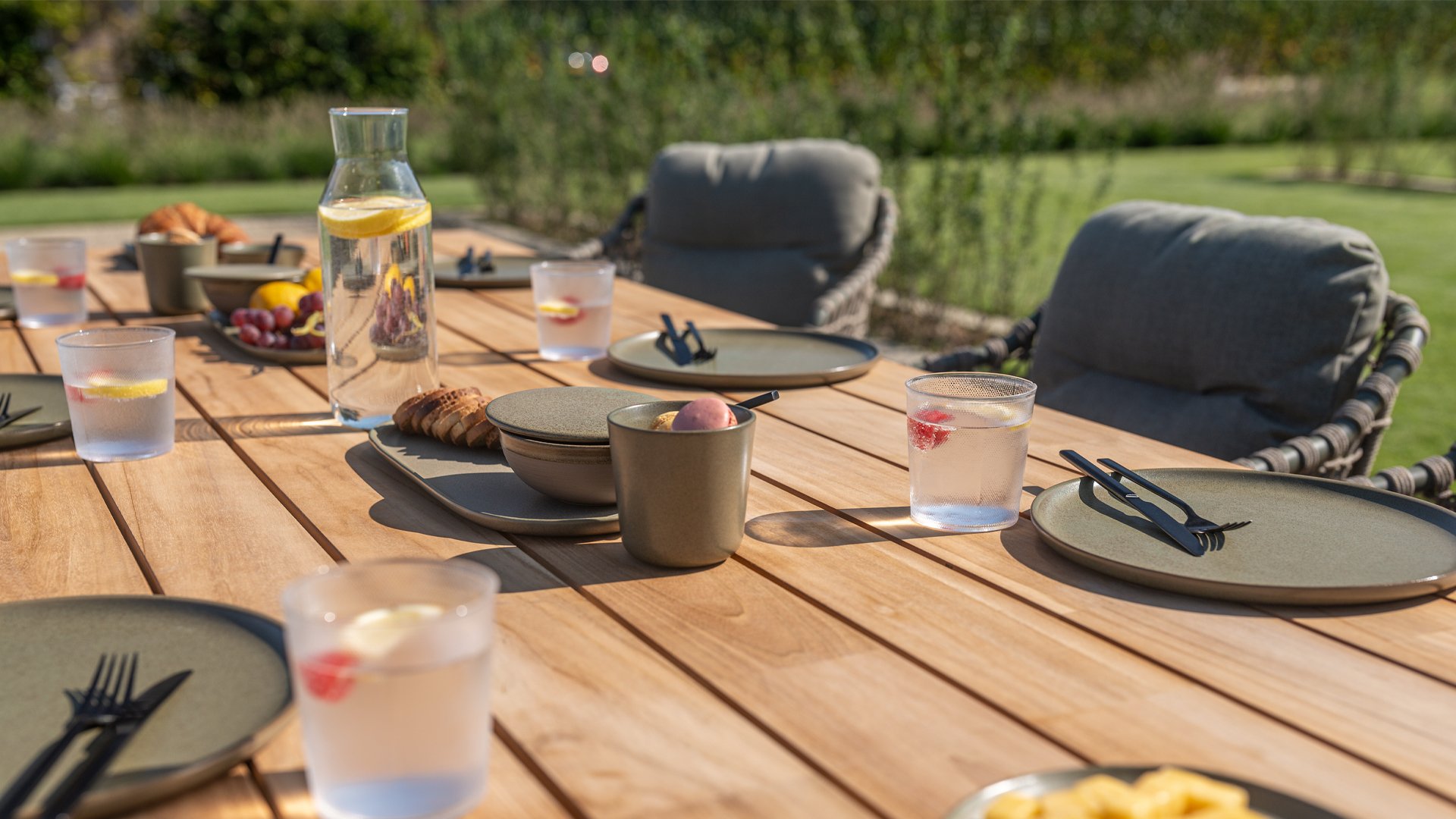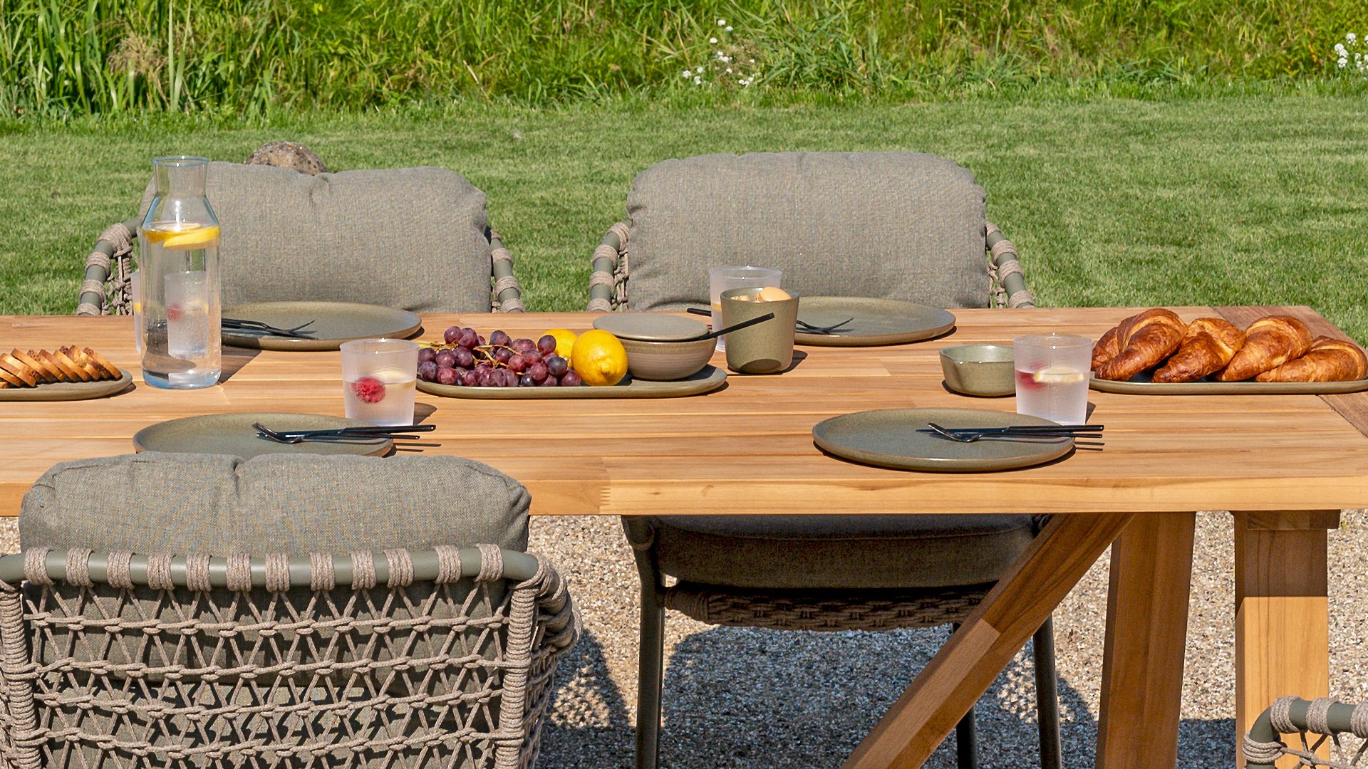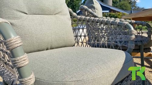 Olefin cushions feel comfortable—almost like the sofa or chairs you have indoors. This is because nearly all our cushions are covered with Olefin fabric. This fabric has a number of unique properties. The raw material used to produce Olefin is oil. The dye is added at an early stage, making it part of the fiber’s core. This makes the fabric colorfast, UV-resistant, and water-repellent. For that reason, Olefin is also used in technical sportswear and the automotive industry.