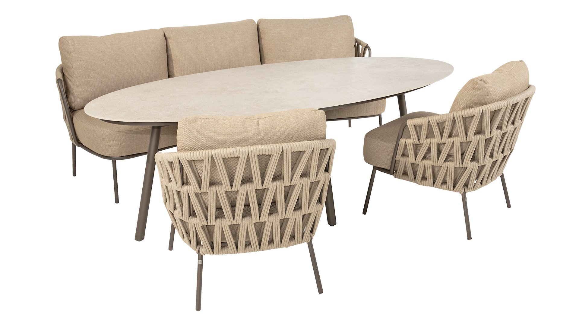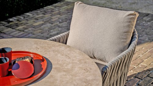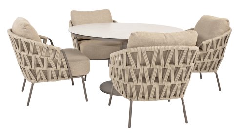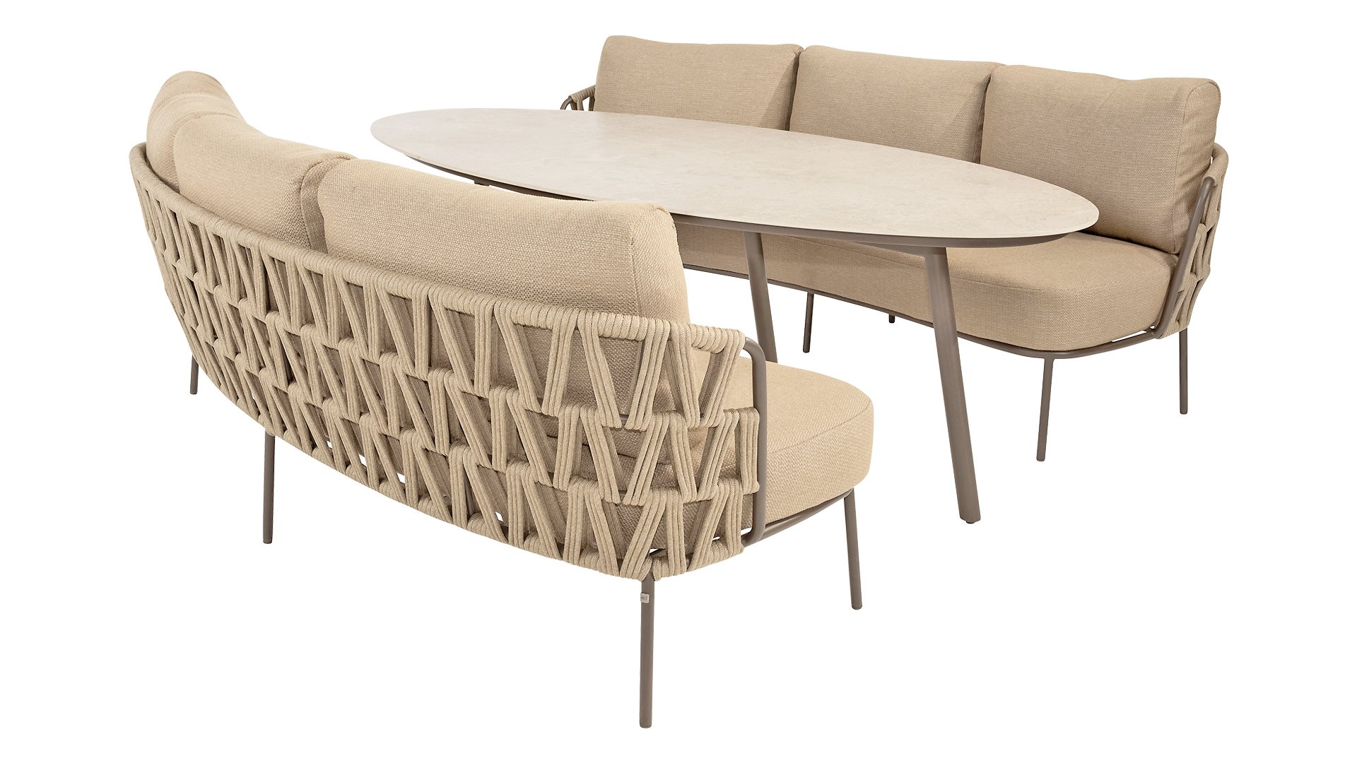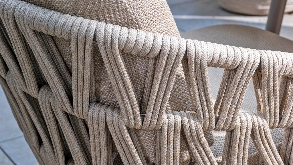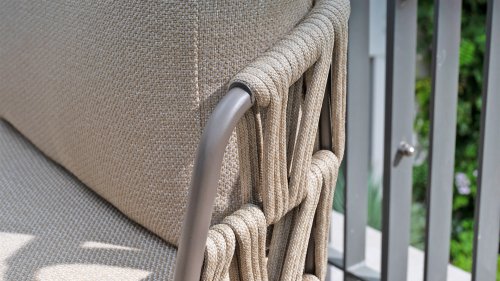 With a modern braided rope design in a natural taupe shade and generous, sleek cushions, the Mallorca series offers inviting seating comfort. The soft beige upholstery is both stylish and comfortable, and the subtly rounded shapes of the chairs and bench create a relaxed, ergonomic seating experience.