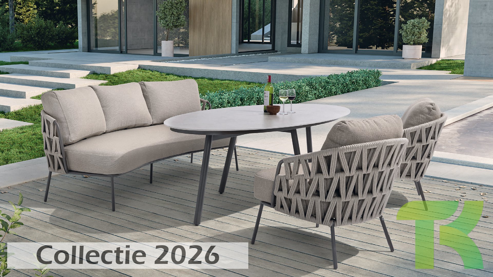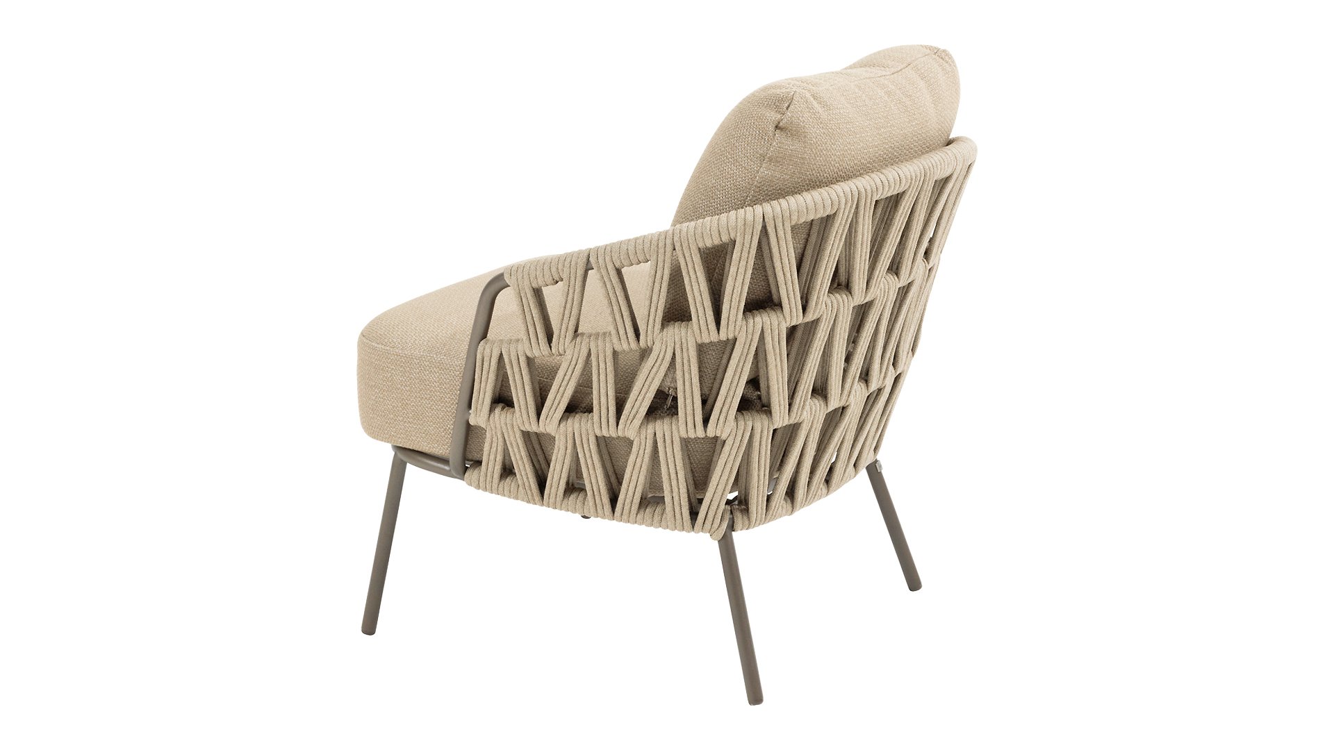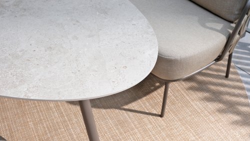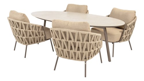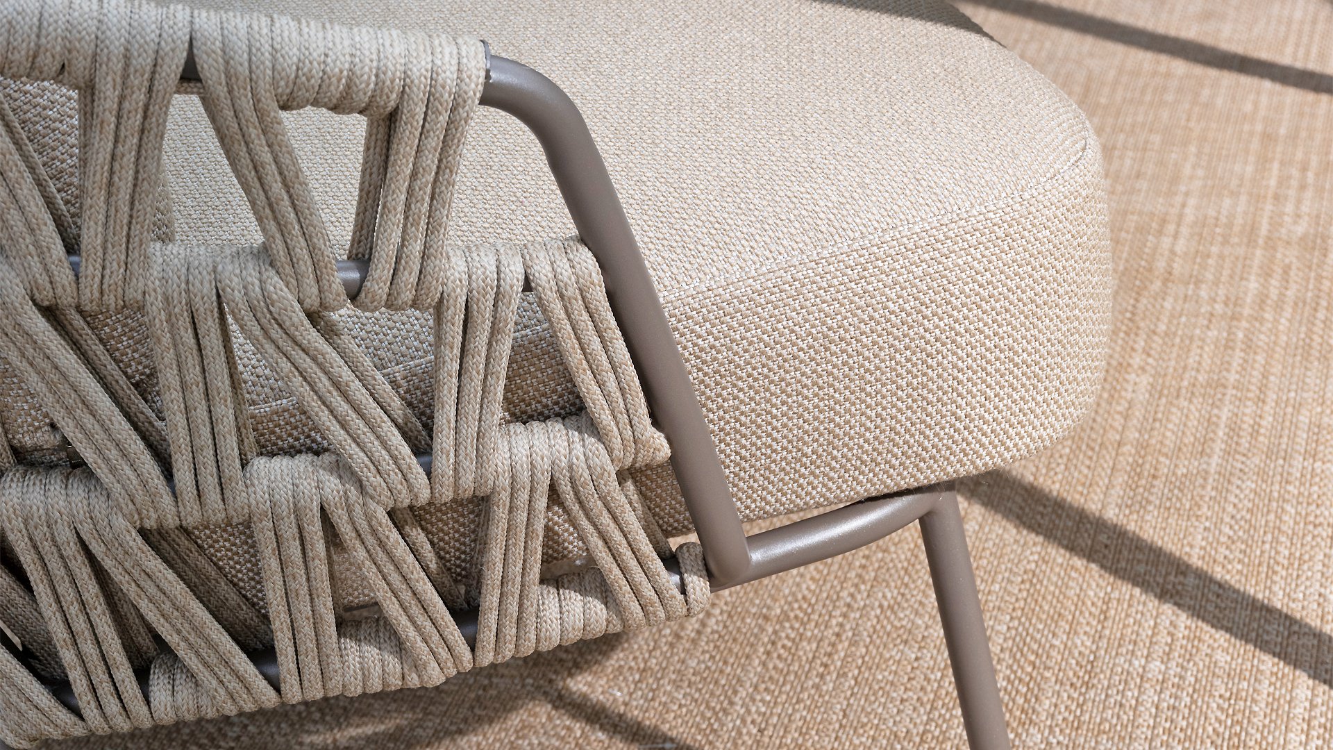 With a modern braided rope design in a natural taupe shade and generous, sleek cushions, the Mallorca series offers inviting seating comfort. The soft beige upholstery is both stylish and comfortable, and the subtly rounded shapes of the chairs and bench create a relaxed, ergonomic seating experience.