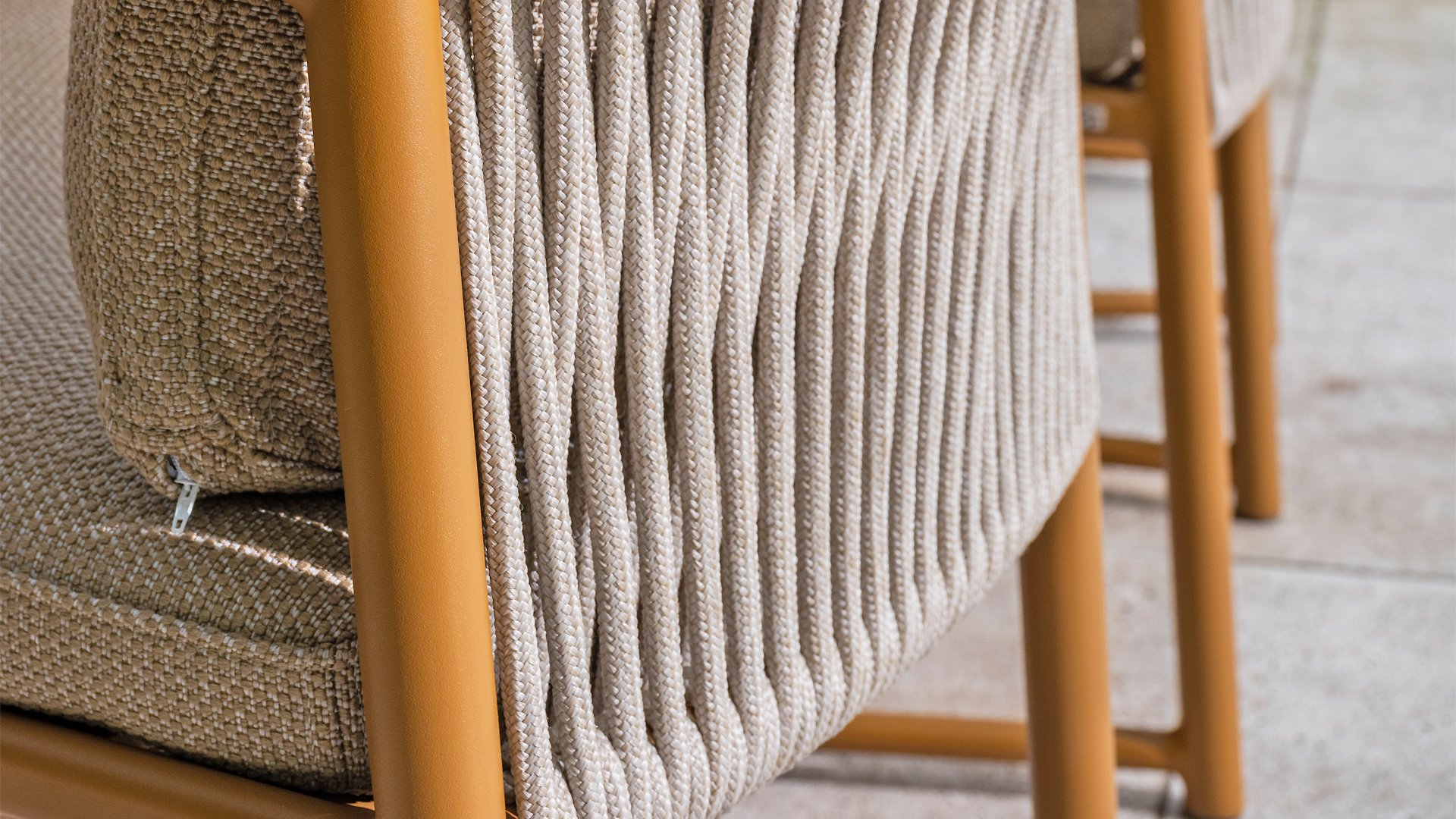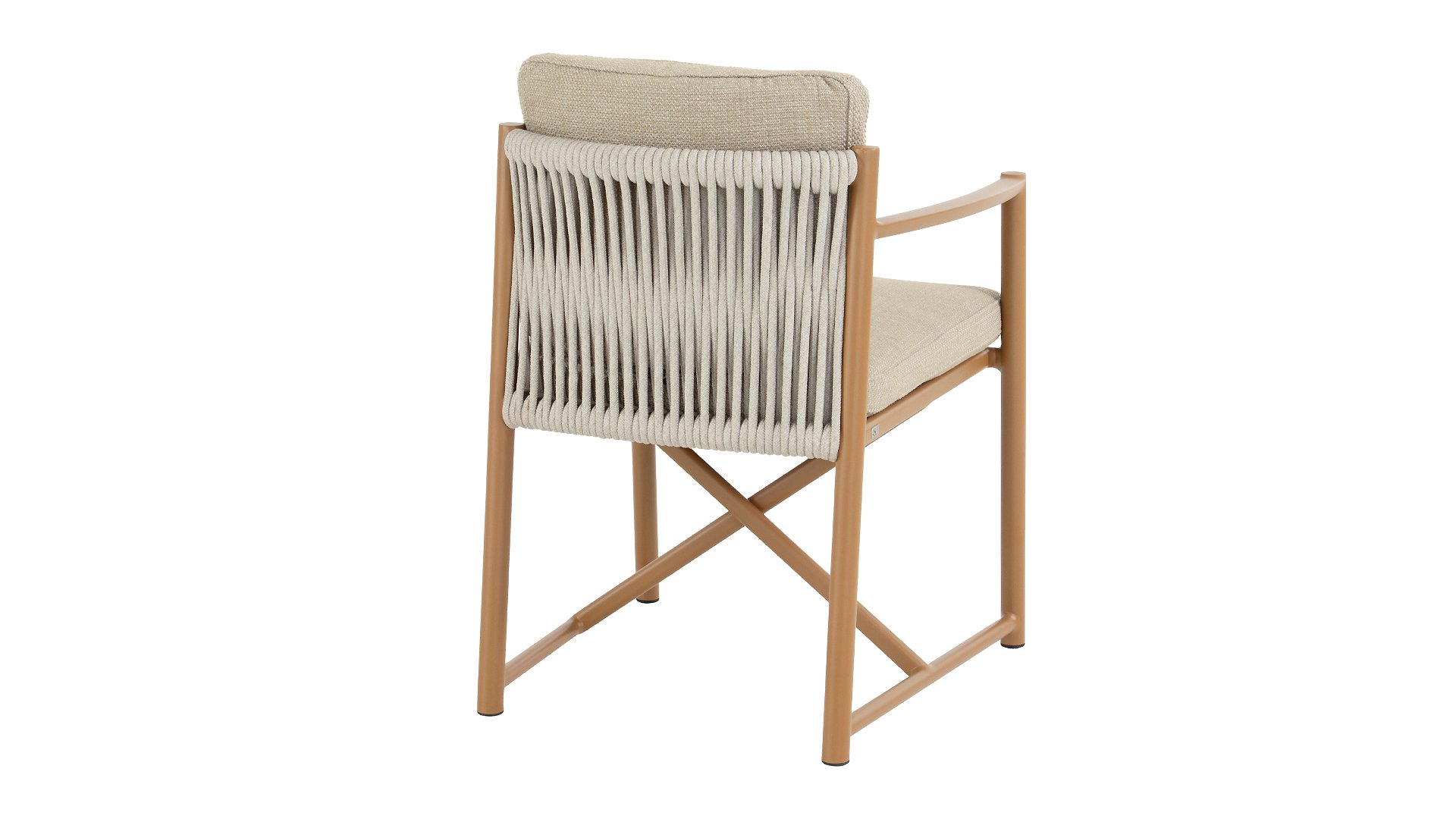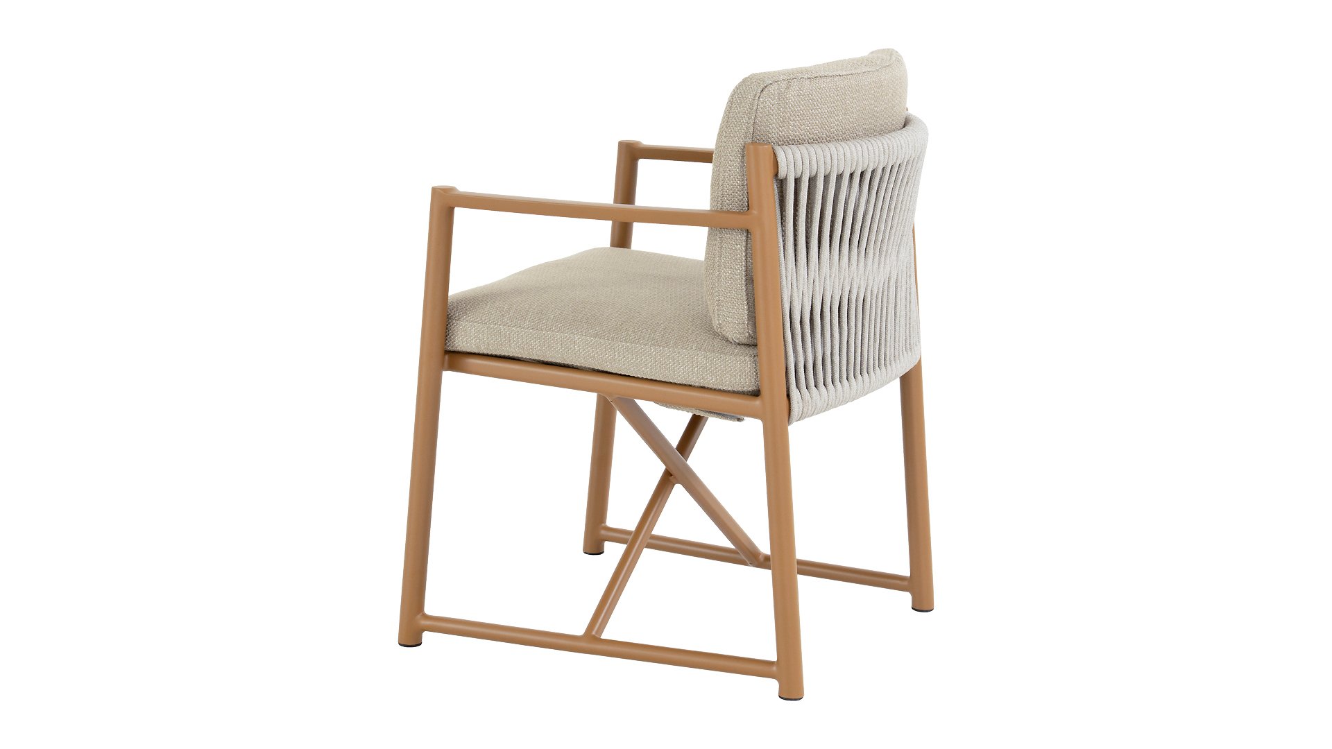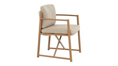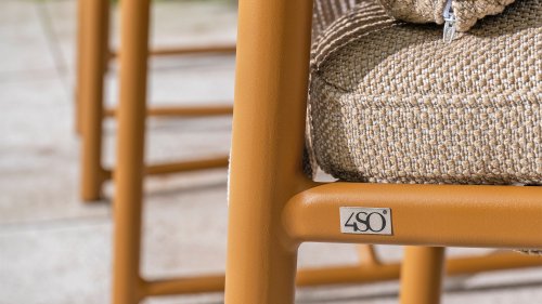 The 4 Seasons Outdoor Marina Amber Dining Chair is for those who appreciate sleek, contoured furniture. The frame is crafted from powder-coated aluminum in a warm earth tone, combined with airy sides and a rope weave on the back for a more luxurious look. The weather-resistant Olefin cushion covers are UV and mildew resistant – ideal for years of outdoor use.