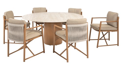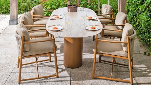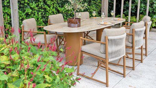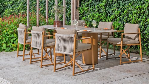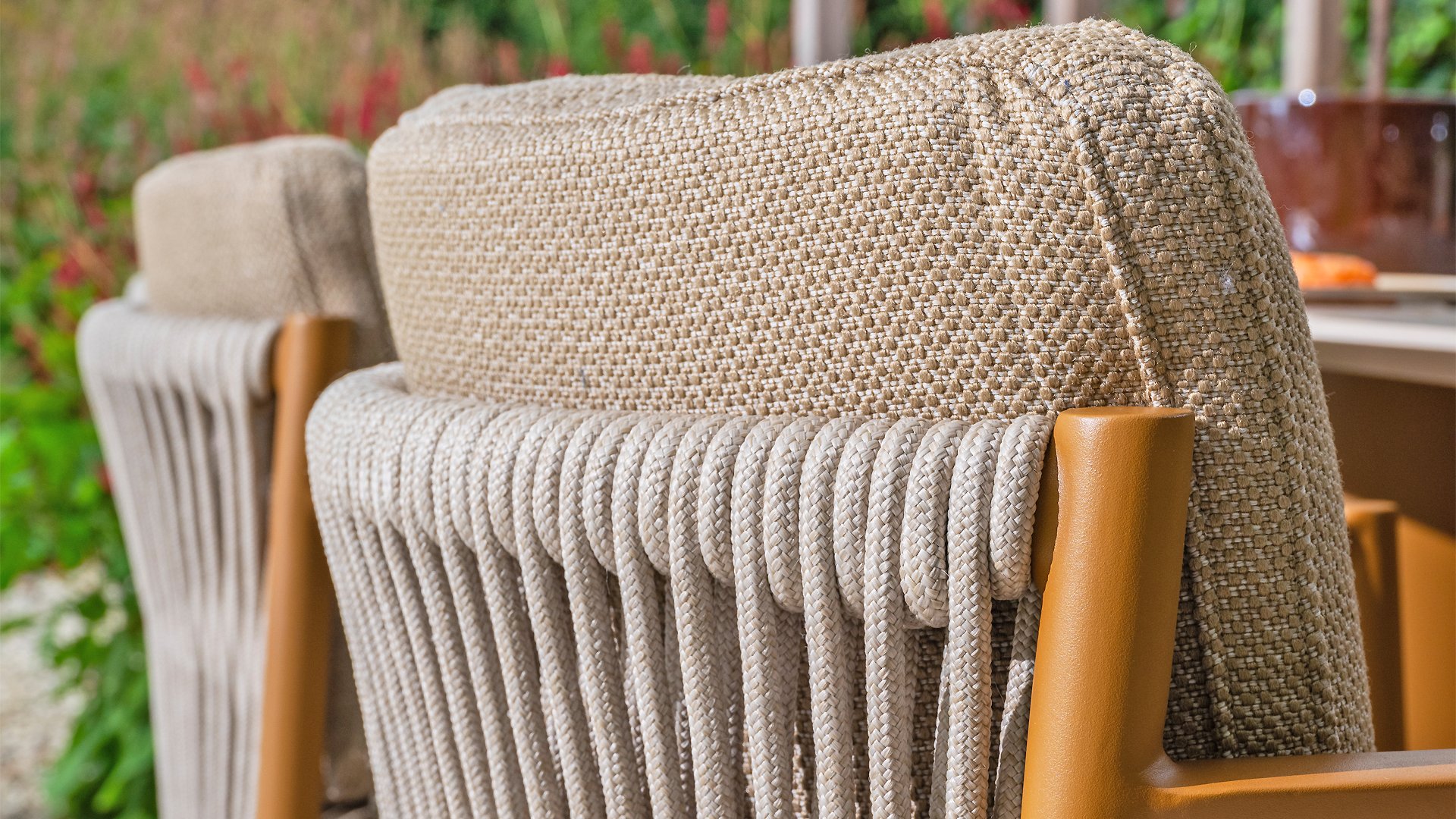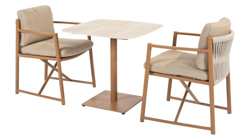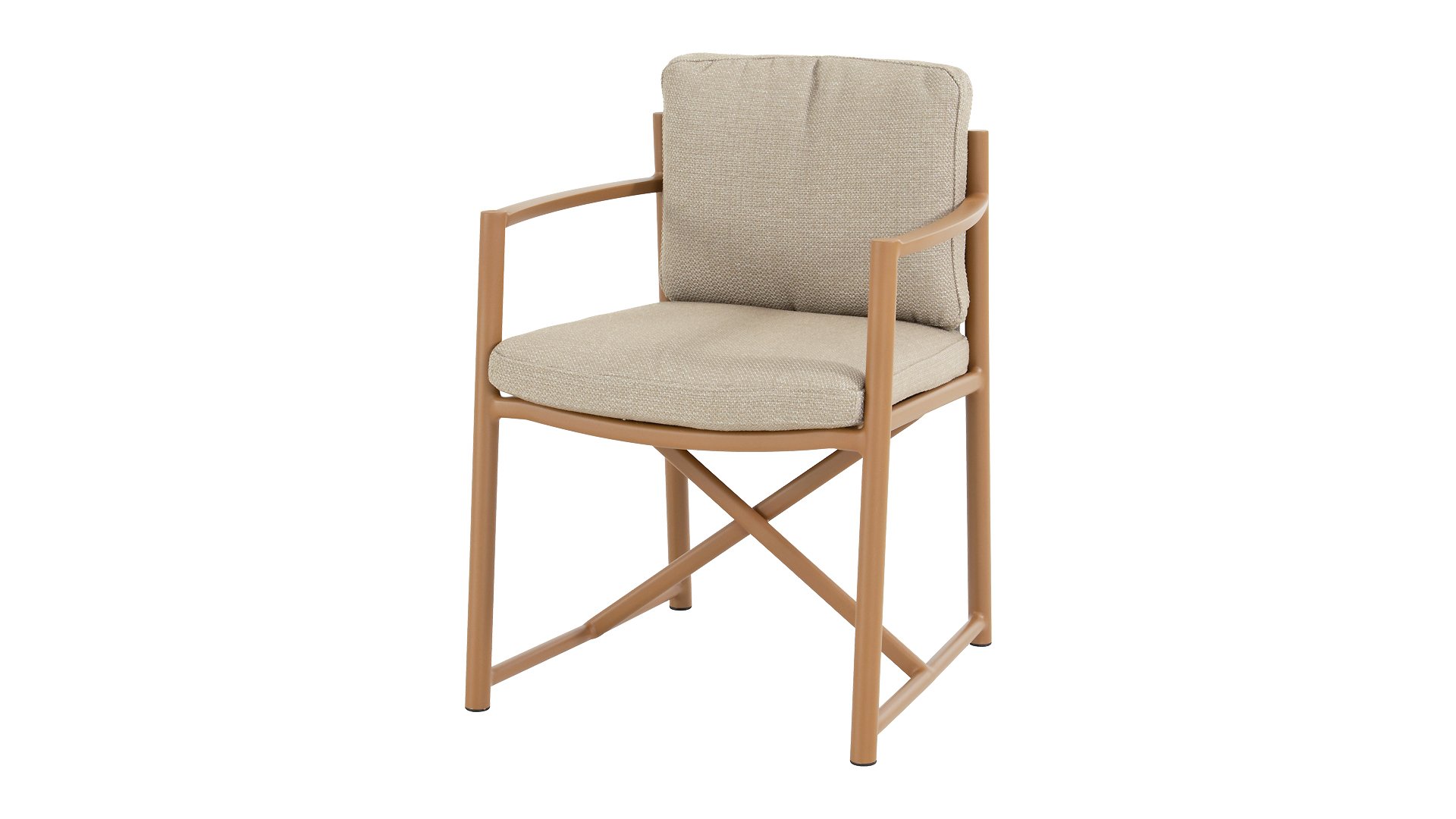 The 4 Seasons Outdoor Marina Amber Dining Chair is for those who appreciate sleek, contoured furniture. The frame is crafted from powder-coated aluminum in a warm earth tone, combined with airy sides and a rope weave on the back for a more luxurious look. The weather-resistant Olefin cushion covers are UV and mildew resistant – ideal for years of outdoor use.
