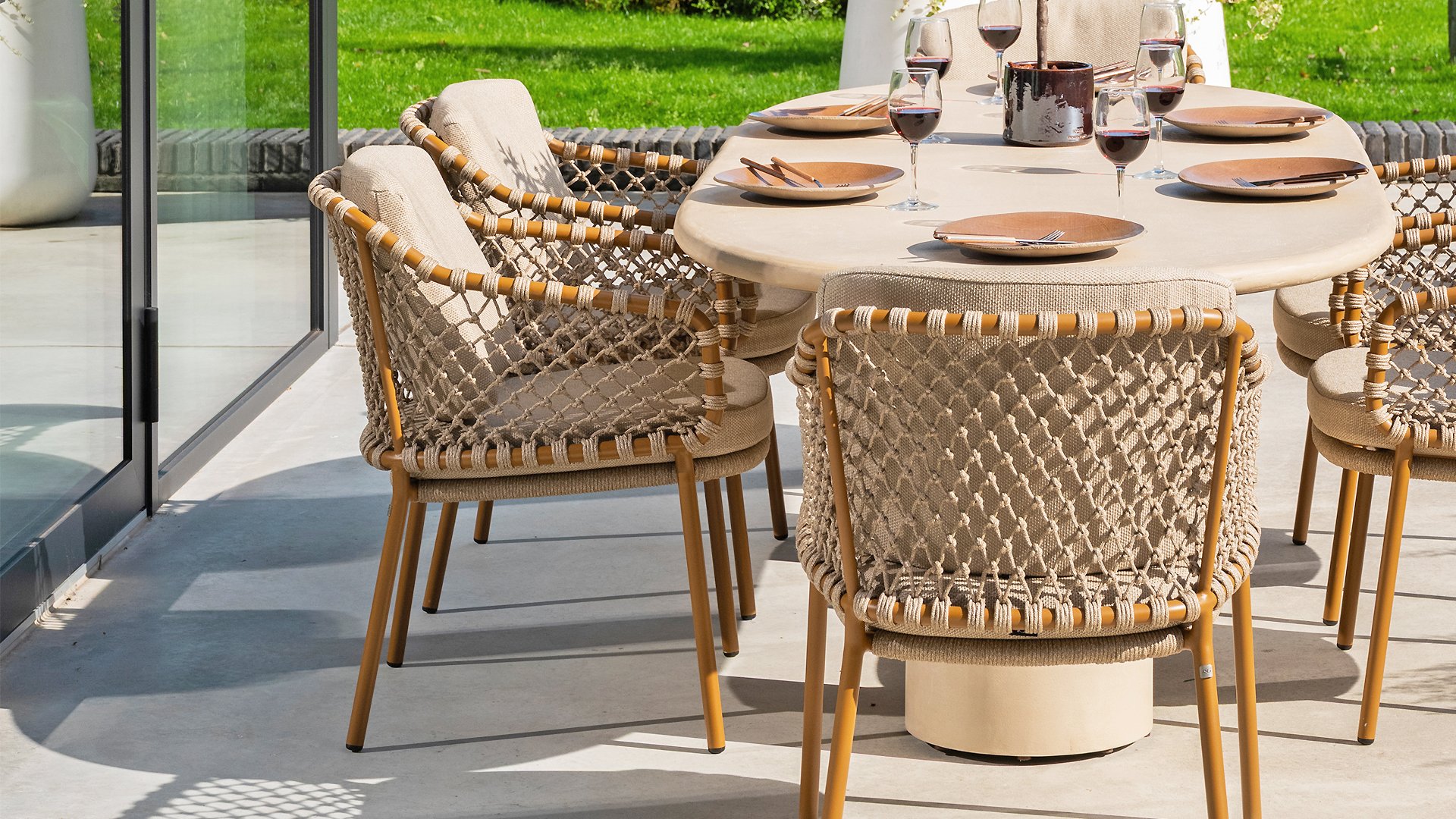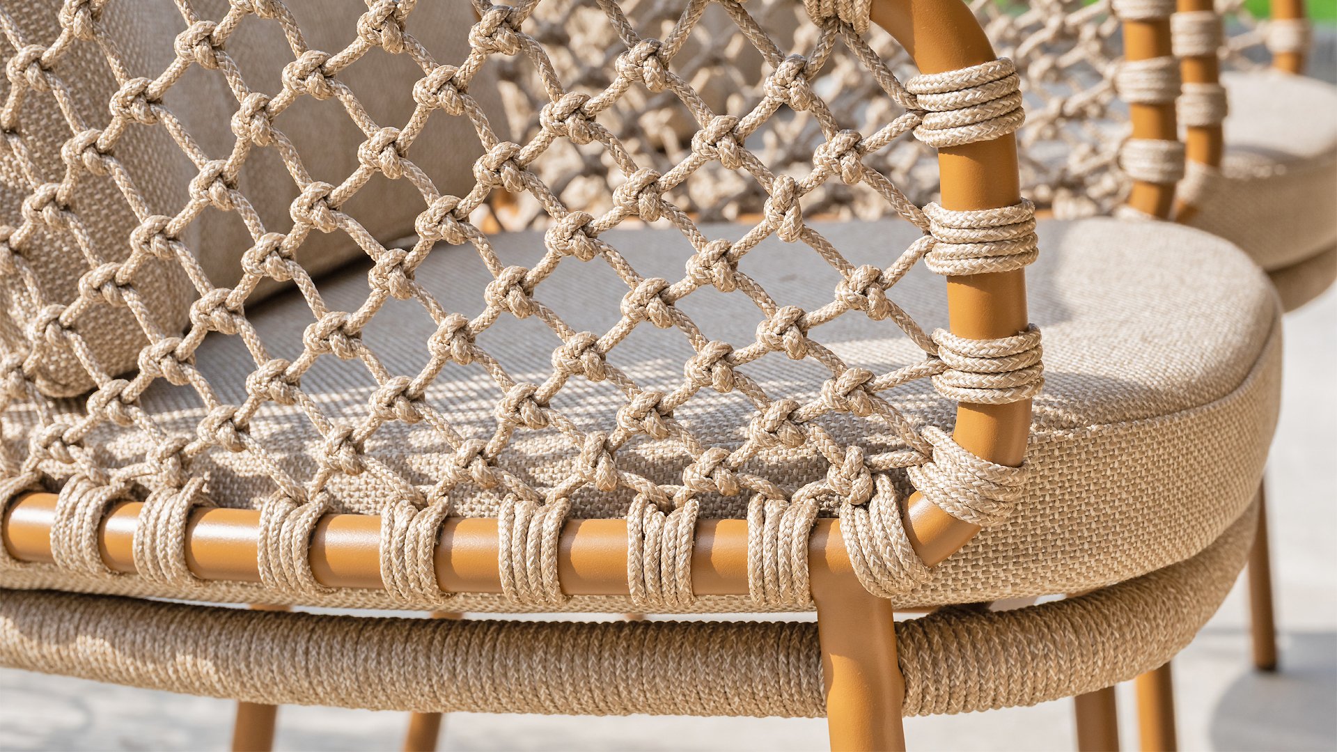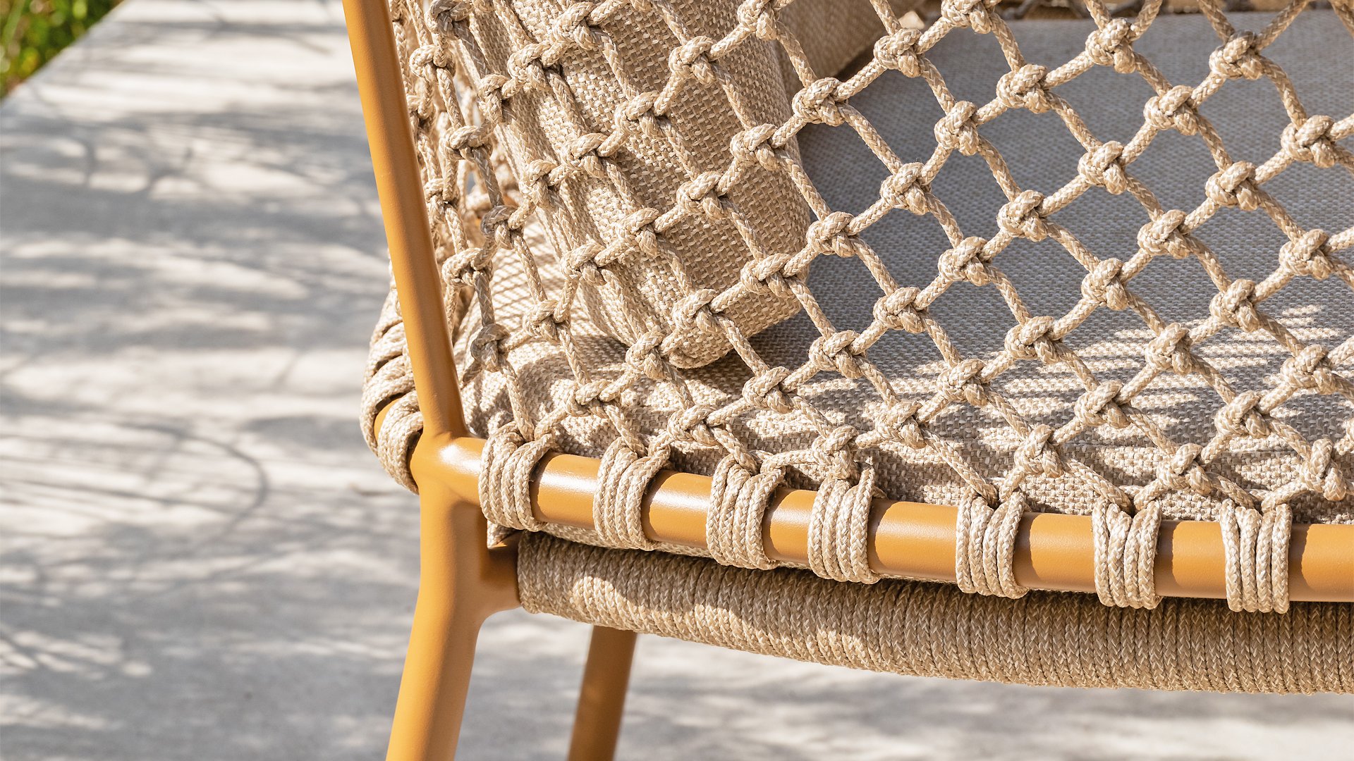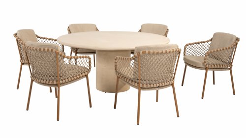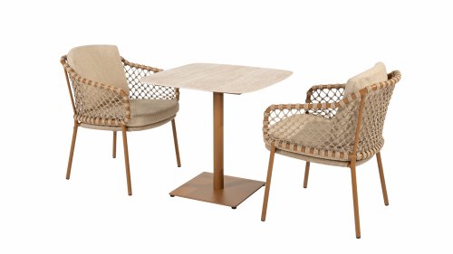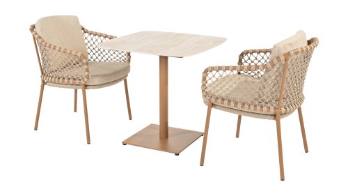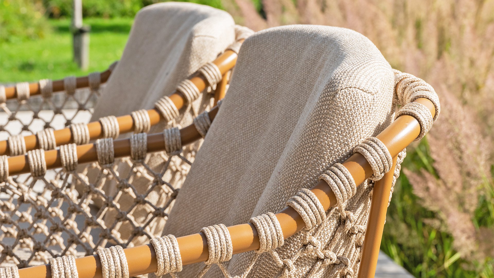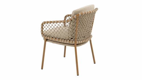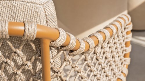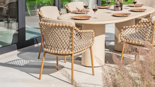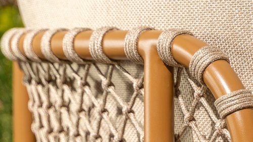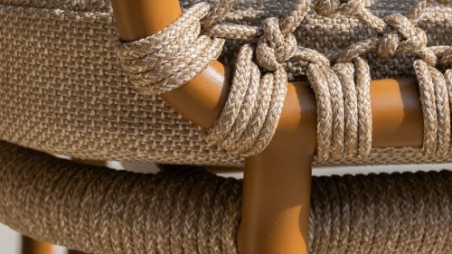 With an elegant and airy braided rope structure in a warm amber color, combined with a subtly curved backrest. The combination of the open rope weave and the natural tones creates a modern, inviting atmosphere. The soft sand-colored cushions provide comfortable seating, ideal for long summer evenings at the table.