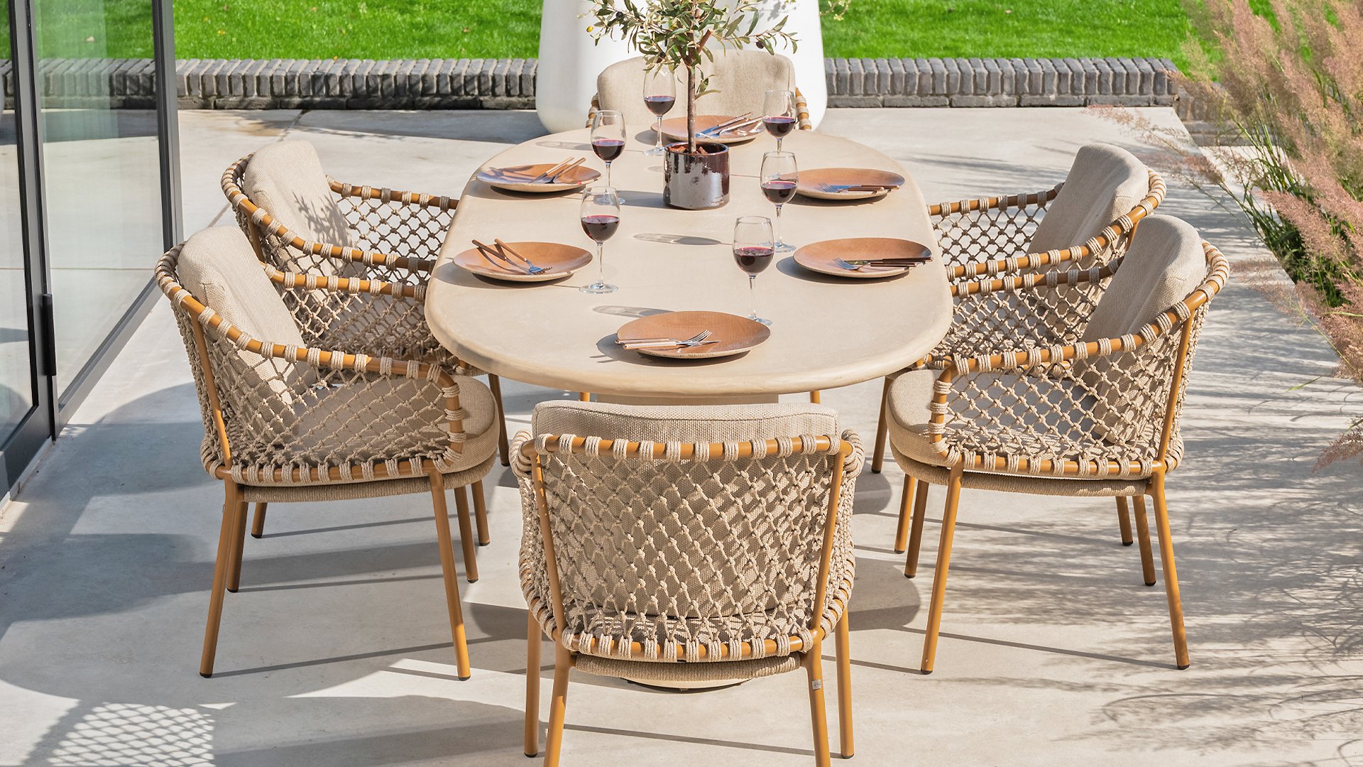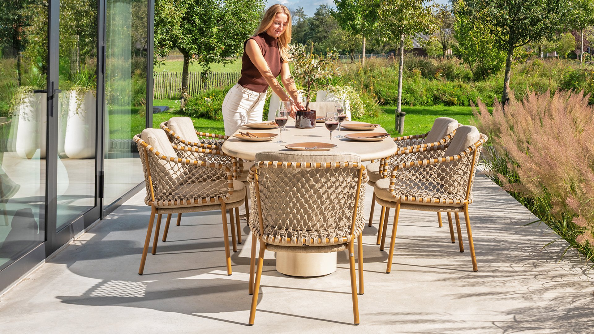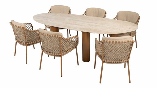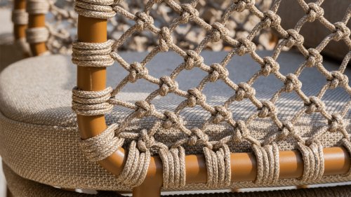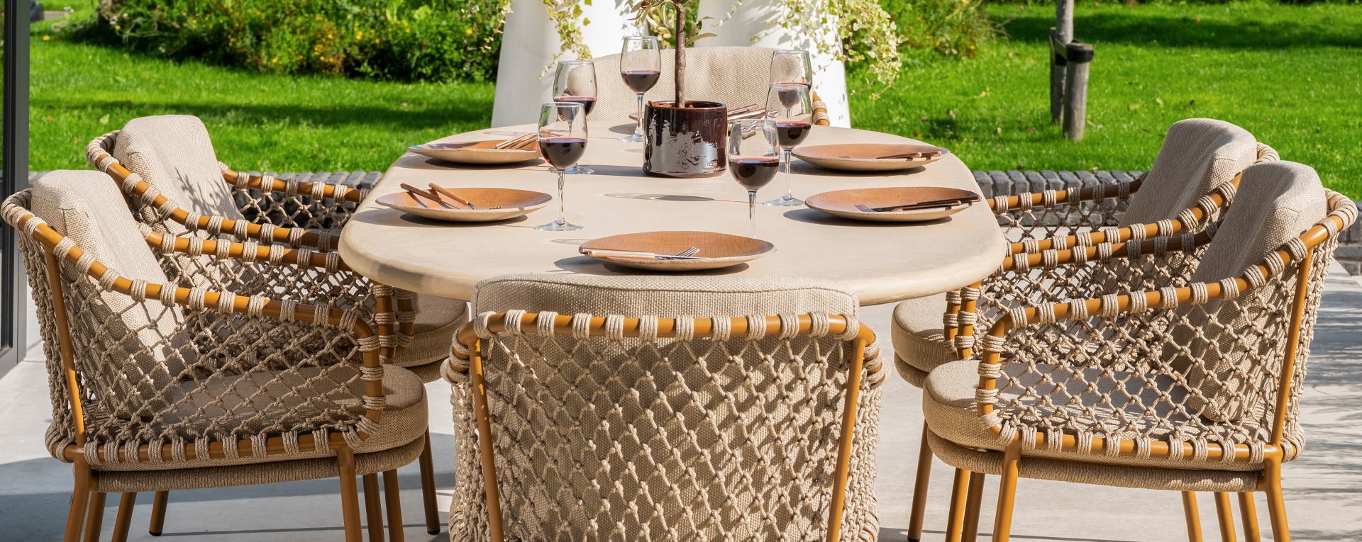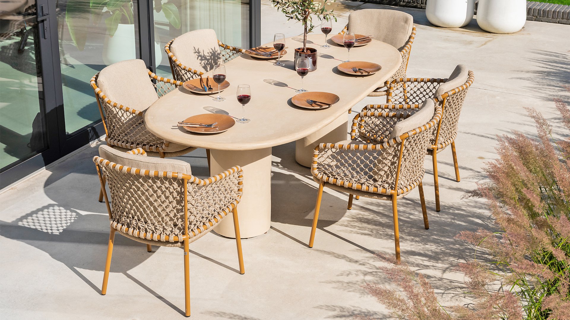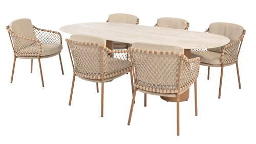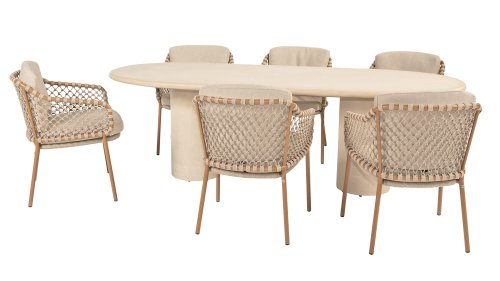 With an elegant and airy braided rope structure in a warm amber color, combined with a subtly curved backrest. The combination of the open rope weave and the natural tones creates a modern, inviting atmosphere. The soft sand-colored cushions provide comfortable seating, ideal for long summer evenings at the table.