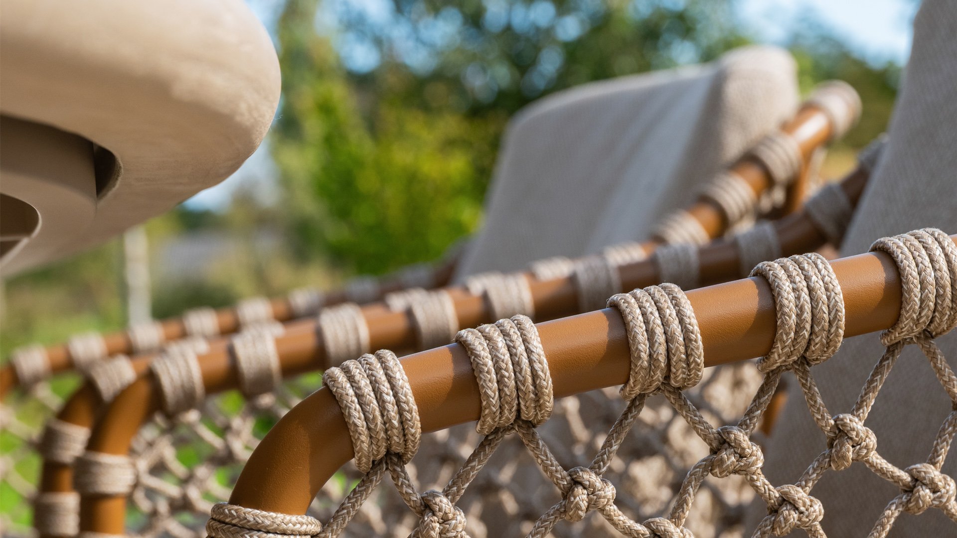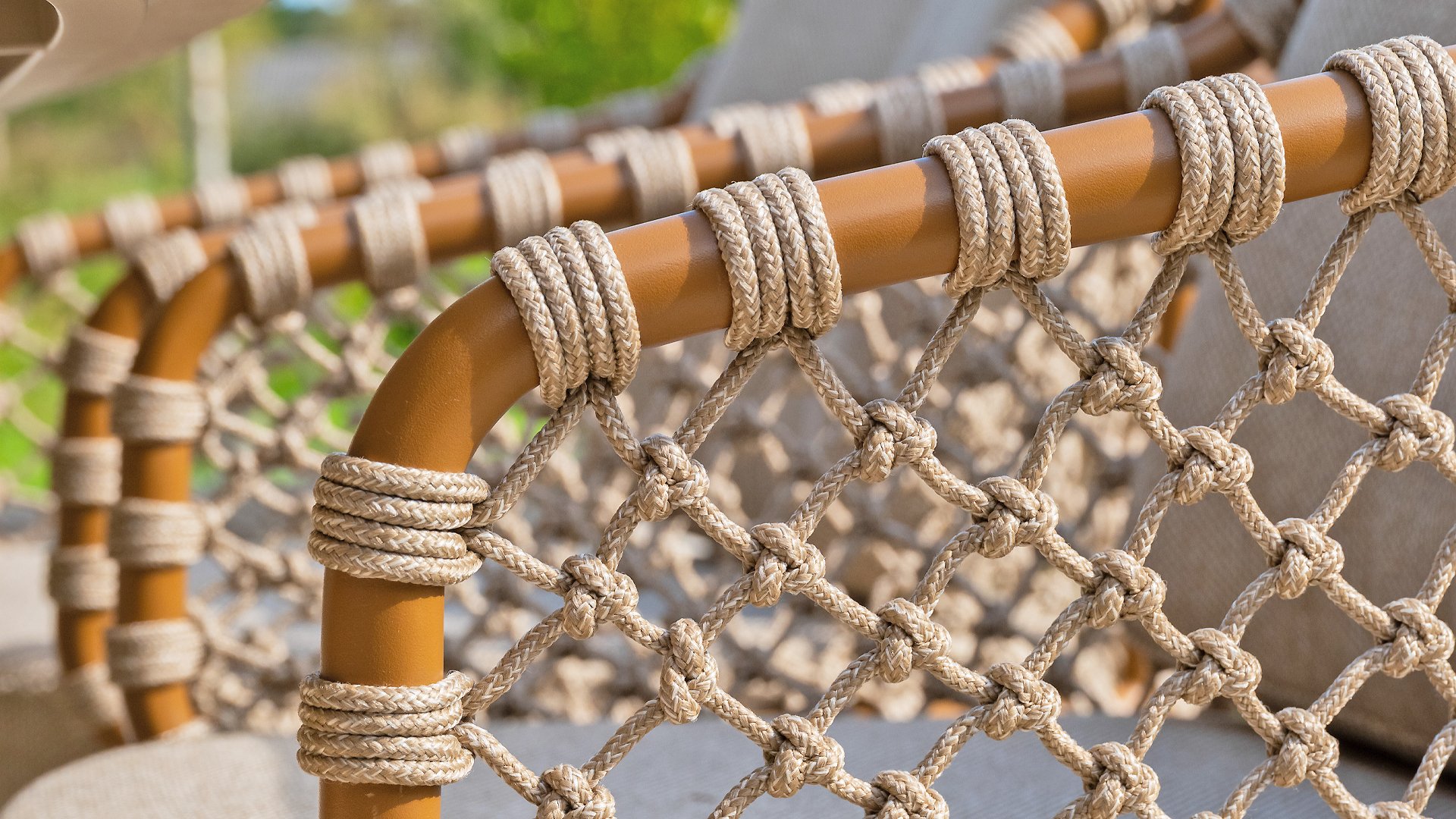 - Natural look: The warm, sand-colored cushions and amber details give the chair a soothing, Mediterranean feel.