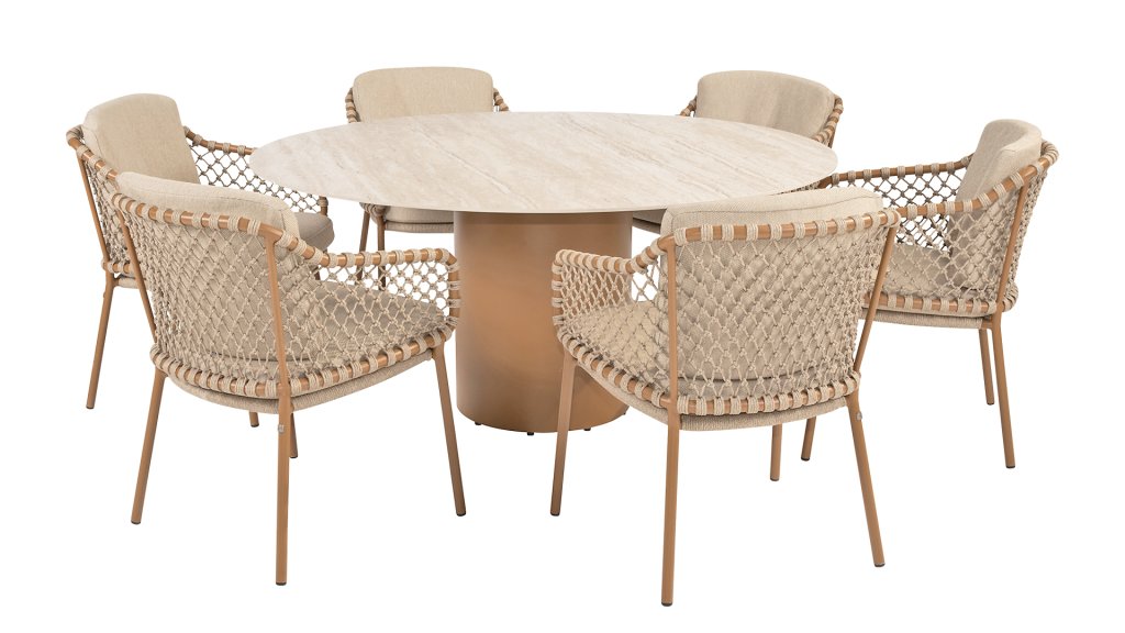 With an elegant and airy braided rope structure in a warm amber color, combined with a subtly curved backrest. The combination of the open rope weave and the natural tones creates a modern, inviting atmosphere. The soft sand-colored cushions provide comfortable seating, ideal for long summer evenings at the table. The sleek frame is made of powder-coated aluminum in a warm amber hue. Thanks to the use of durable, weather-resistant materials, the Martinique Dining chair is not only a feast for the eyes but also resistant to the elements. The 4Seasons Martinique also has a lounge variant.
