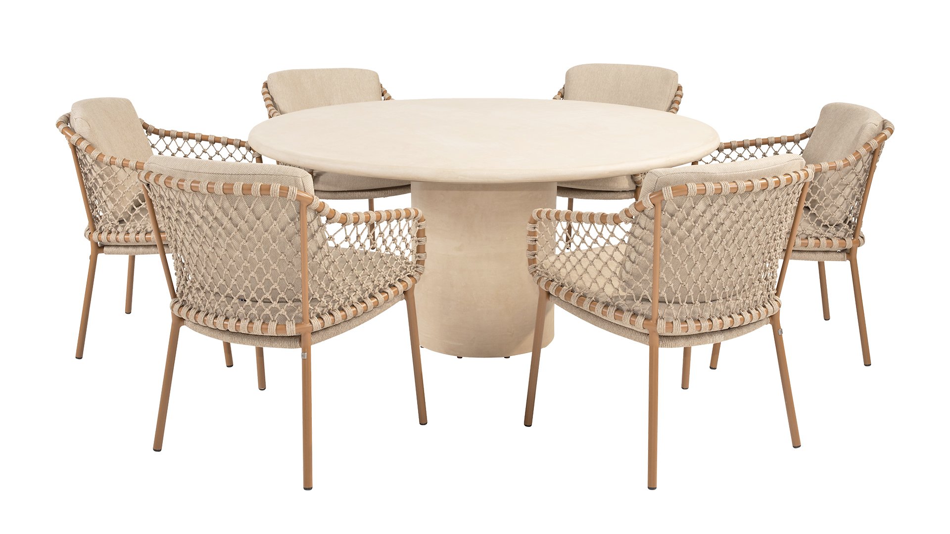 With an elegant and airy braided rope structure in a warm amber color, combined with a subtly curved backrest. The combination of the open rope weave and the natural tones creates a modern, inviting atmosphere. The soft sand-colored cushions provide comfortable seating, ideal for long summer evenings at the table. The sleek frame is made of powder-coated aluminum in a warm amber hue. Thanks to the use of durable, weather-resistant materials, the Martinique Dining chair is not only a feast for the eyes but also resistant to the elements. The 4Seasons Martinique also has a lounge variant.