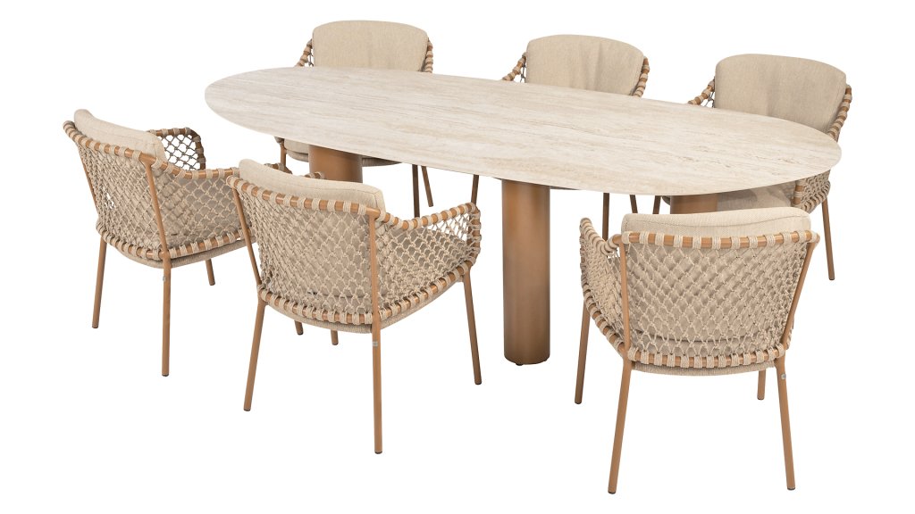 With an elegant and airy braided rope structure in a warm amber color, combined with a subtly curved backrest. The combination of the open rope weave and the natural tones creates a modern, inviting atmosphere. The soft sand-colored cushions provide comfortable seating, ideal for long summer evenings at the table. The sleek frame is made of powder-coated aluminum in a warm amber hue. Thanks to the use of durable, weather-resistant materials, the Martinique Dining chair is not only a feast for the eyes but also resistant to the elements. The 4Seasons Martinique also has a lounge variant.