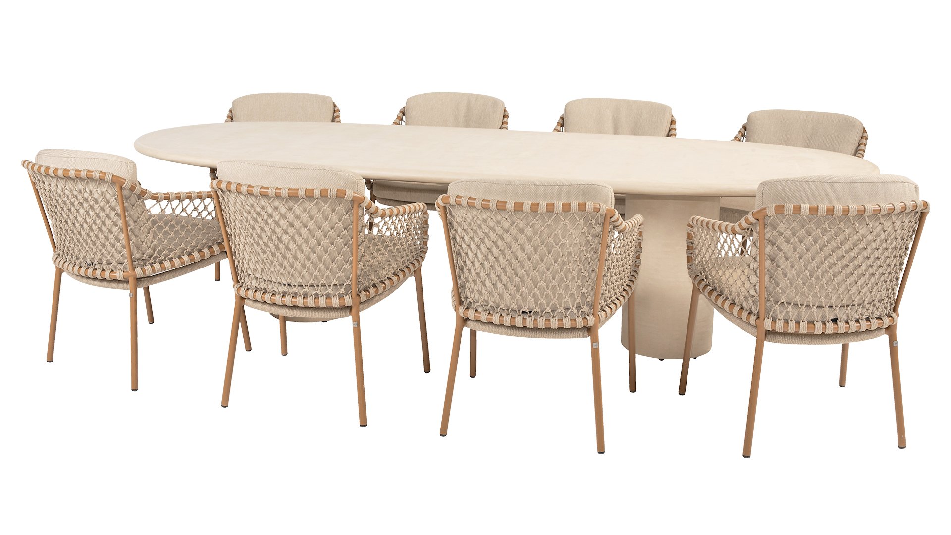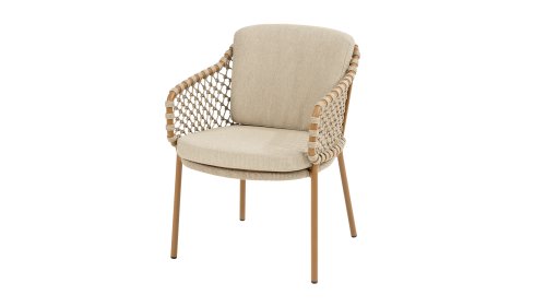 With an elegant and airy braided rope structure in a warm amber color, combined with a subtly curved backrest. The combination of the open rope weave and the natural tones creates a modern, inviting atmosphere. The soft sand-colored cushions provide comfortable seating, ideal for long summer evenings at the table. The sleek frame is made of powder-coated aluminum in a warm amber hue. Thanks to the use of durable, weather-resistant materials, the Martinique Dining chair is not only a feast for the eyes but also resistant to the elements. The 4Seasons Martinique also has a lounge variant.