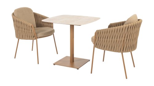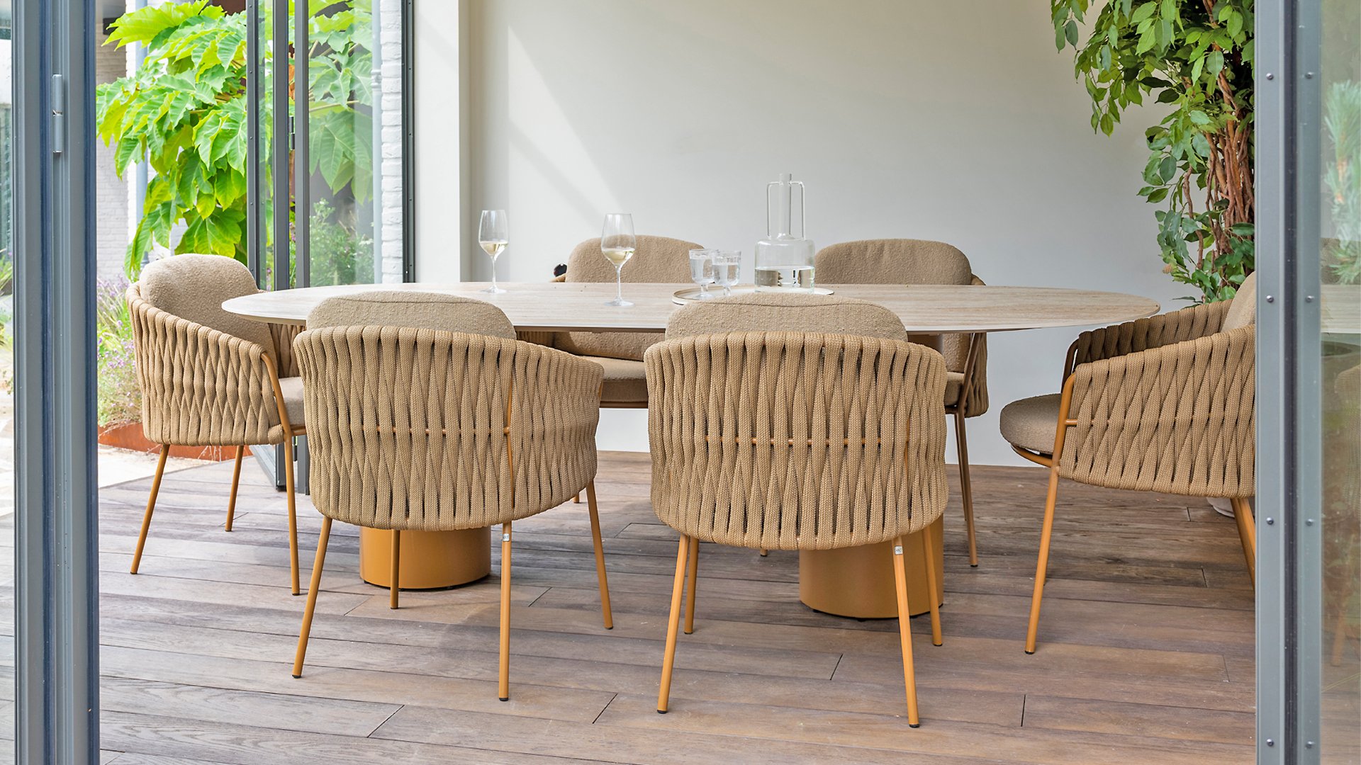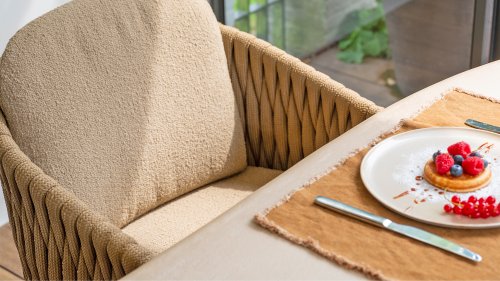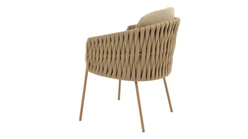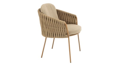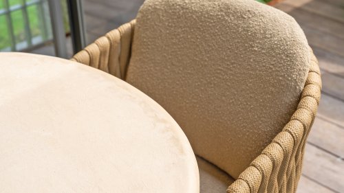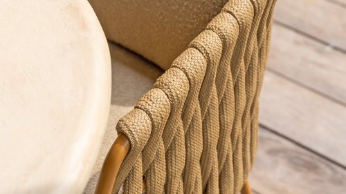 The frame is crafted from powder-coated stainless steel in a warm, earthy amber tone, combined with striking, thick rope wickerwork. This artisanal finish gives the Amber series a robust yet refined appearance. The weather-resistant Olefin cushion covers are UV- and mildew-resistant – ideal for years of outdoor use. The chair's shell provides comfortable back and arm support.