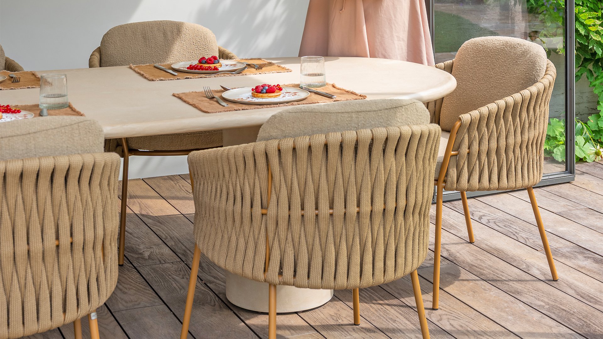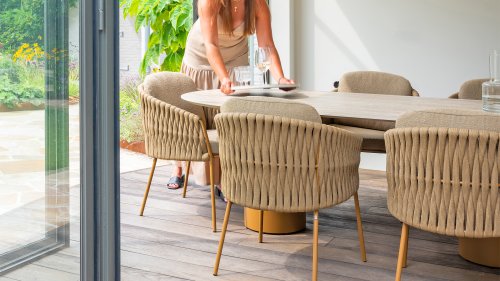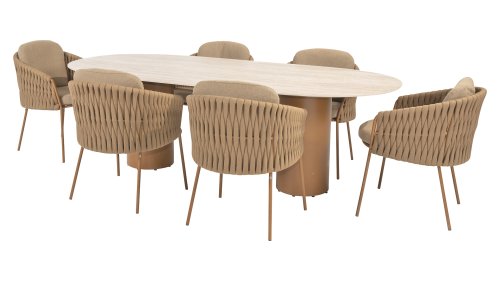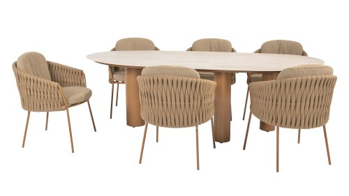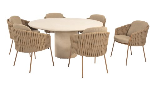 The 4 Seasons Outdoor Molina Amber Dining Set is a perfect choice for any outdoor space. With its thickly braided brown rope and generously filled cushions in a soft, amber bouclé fabric, this set invites ultimate relaxation in your garden or on your patio.