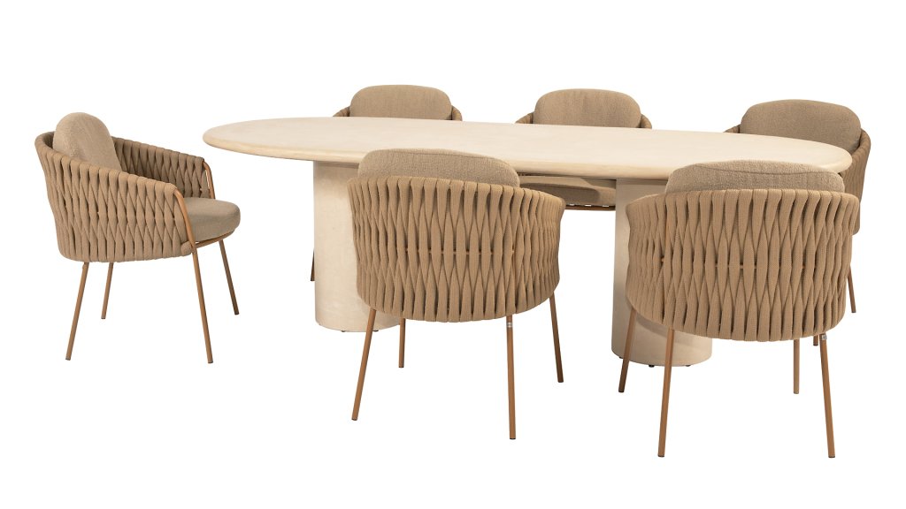 The 4 Seasons Outdoor Molina Amber Dining set is a perfect choice for any outdoor space. With its thickly braided brown rope and richly filled cushions in a soft, amber bouclé fabric, this set invites ultimate relaxation in your garden or on your patio.