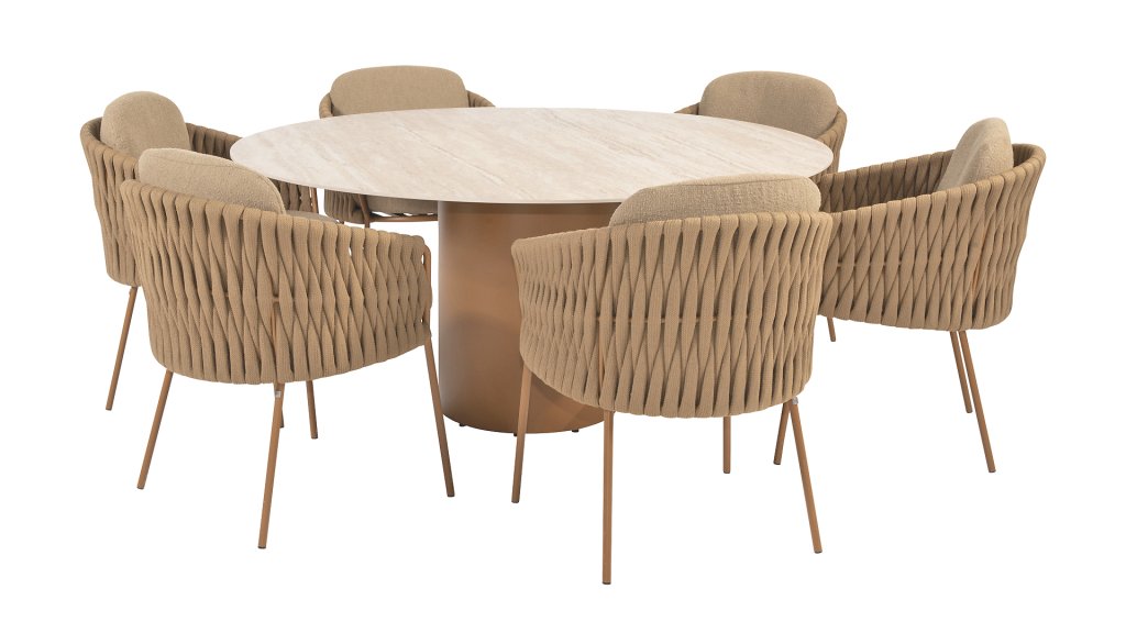 The 4 Seasons Outdoor Molina Amber Dining set is a perfect choice for any outdoor space. With its thickly braided brown rope and richly filled cushions in a soft, amber bouclé fabric, this set invites ultimate relaxation in your garden or on your patio.