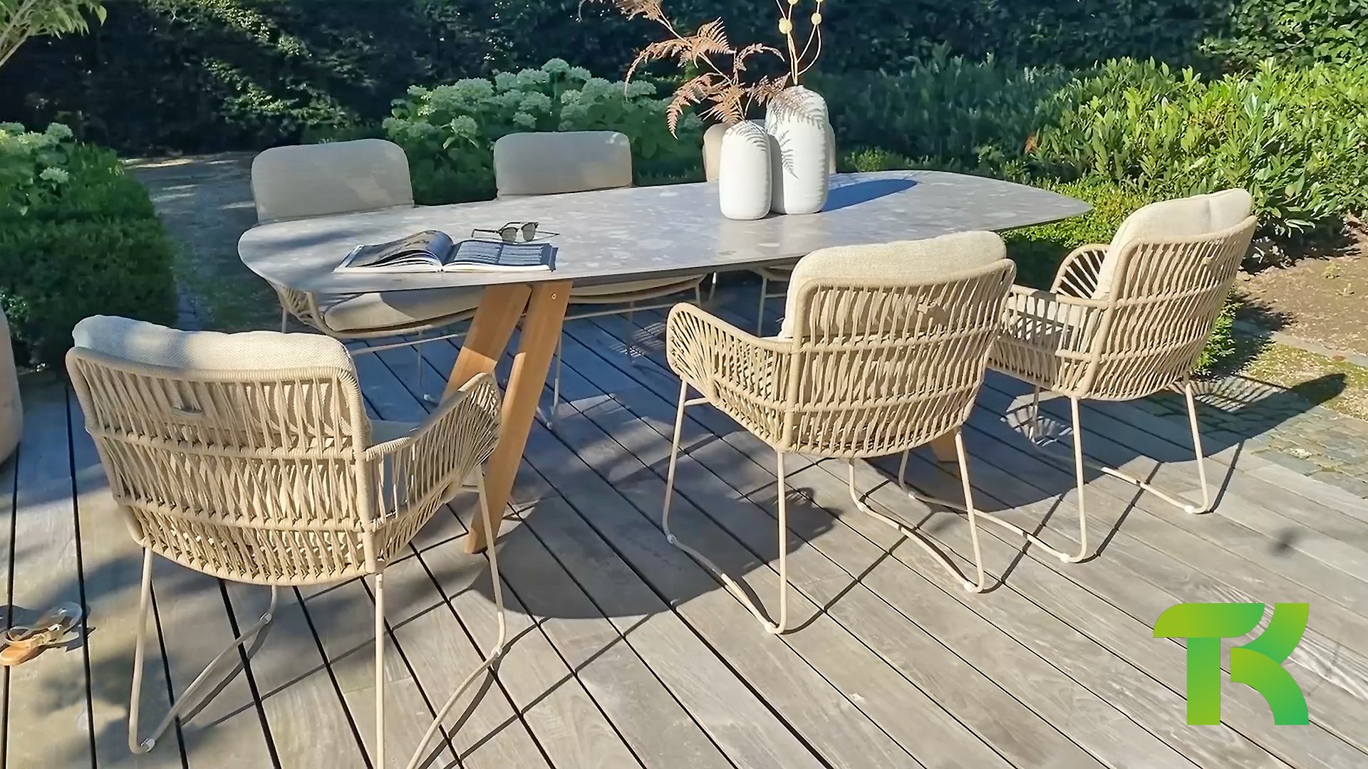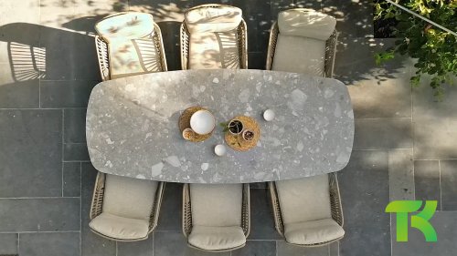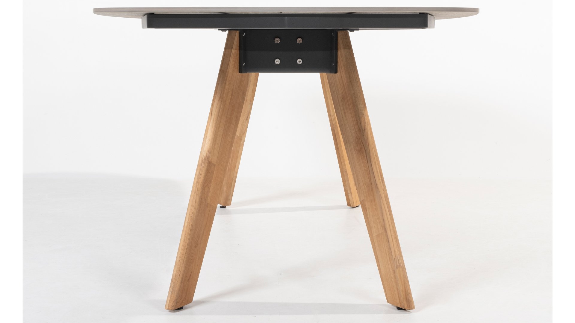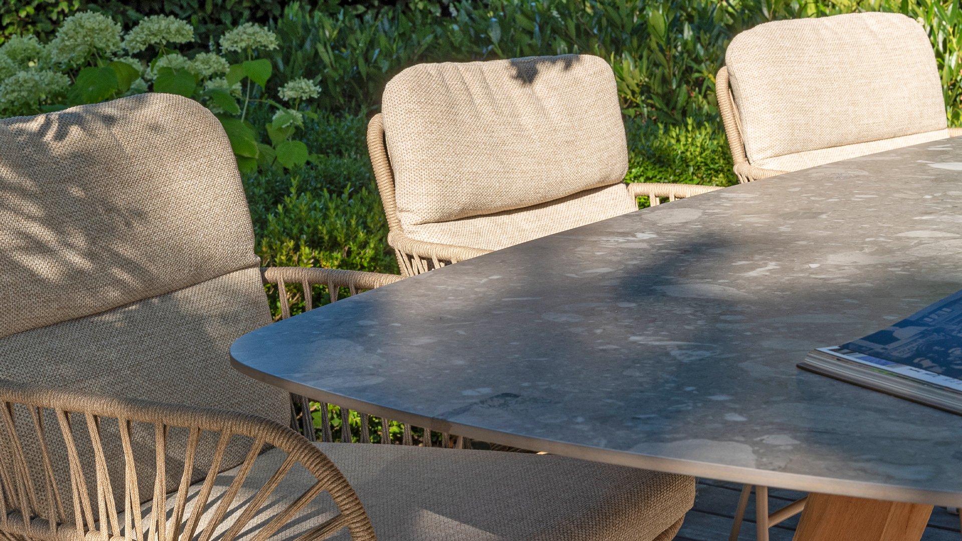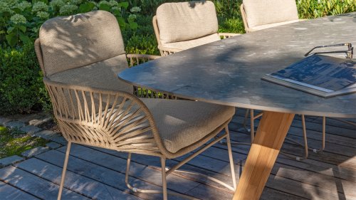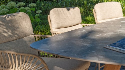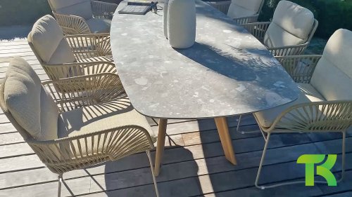 The 4Seasons Outdoor Montana is a beautiful table that immediately stands out. It not only looks modern but is also incredibly practical due to the shape of the tabletop. The table is distinguished by its Danish oval tabletop, which creates plenty of space on all sides of the table. In the Montana series, there are different options; the 240 cm terrazzo ceramic top can be combined with a stainless steel or teak wooden base. Within the Montana series, there is also a 280 cm table with HPL top.