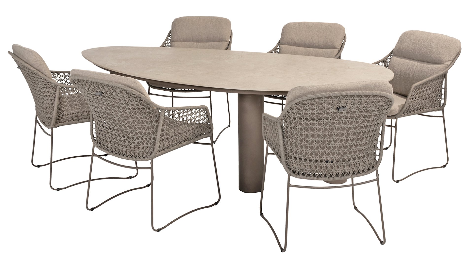 This beautiful material is perfect for outdoor use, because 4SO Rope is not just an shoelace. Our round wires have a synthetic core. This polypropylene base ensures minimal stretching of the rope and also does not absorb moisture. The covering is made of an acrylic fabric, similar to the weather-resistant fabric of our garden cushions. This covering feels soft but is highly water-repellent, UV-resistant, and colorfast. The flat rope variants have the same mix of weather-resistant materials, but the polypropylene material is interwoven with the acrylic fabric. This technique gives the flat rope the same properties but a completely different look. The stretch is minimal, and 4 Seasons Outdoor garden furniture with Rope is suitable for people weighing up to 110 kg. It's therefore an exceptionally strong material, but it's important to be careful with sharp objects. Our  Rope is weather-resistant, but a sharp object can seriously damage your garden furniture. We offer exclusive designs using hand-woven Rope patterns and techniques.