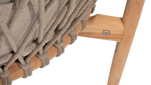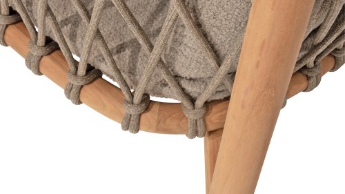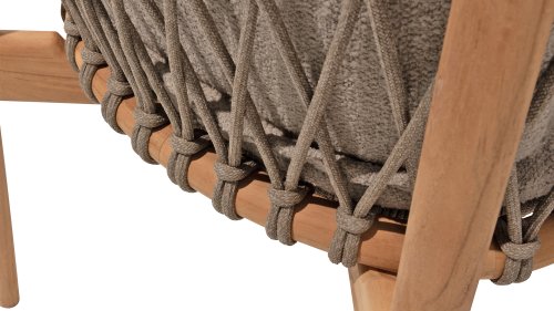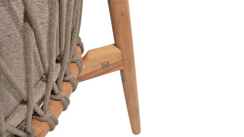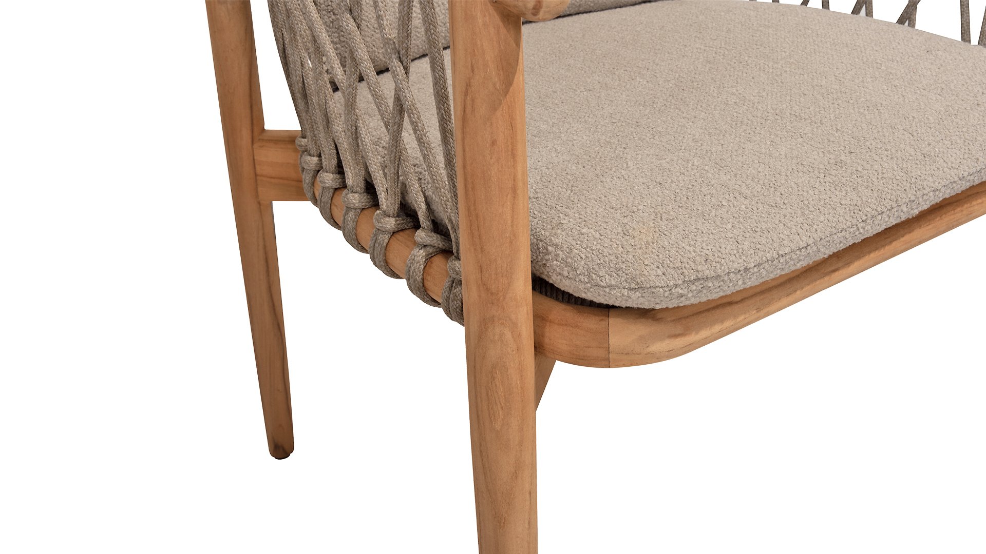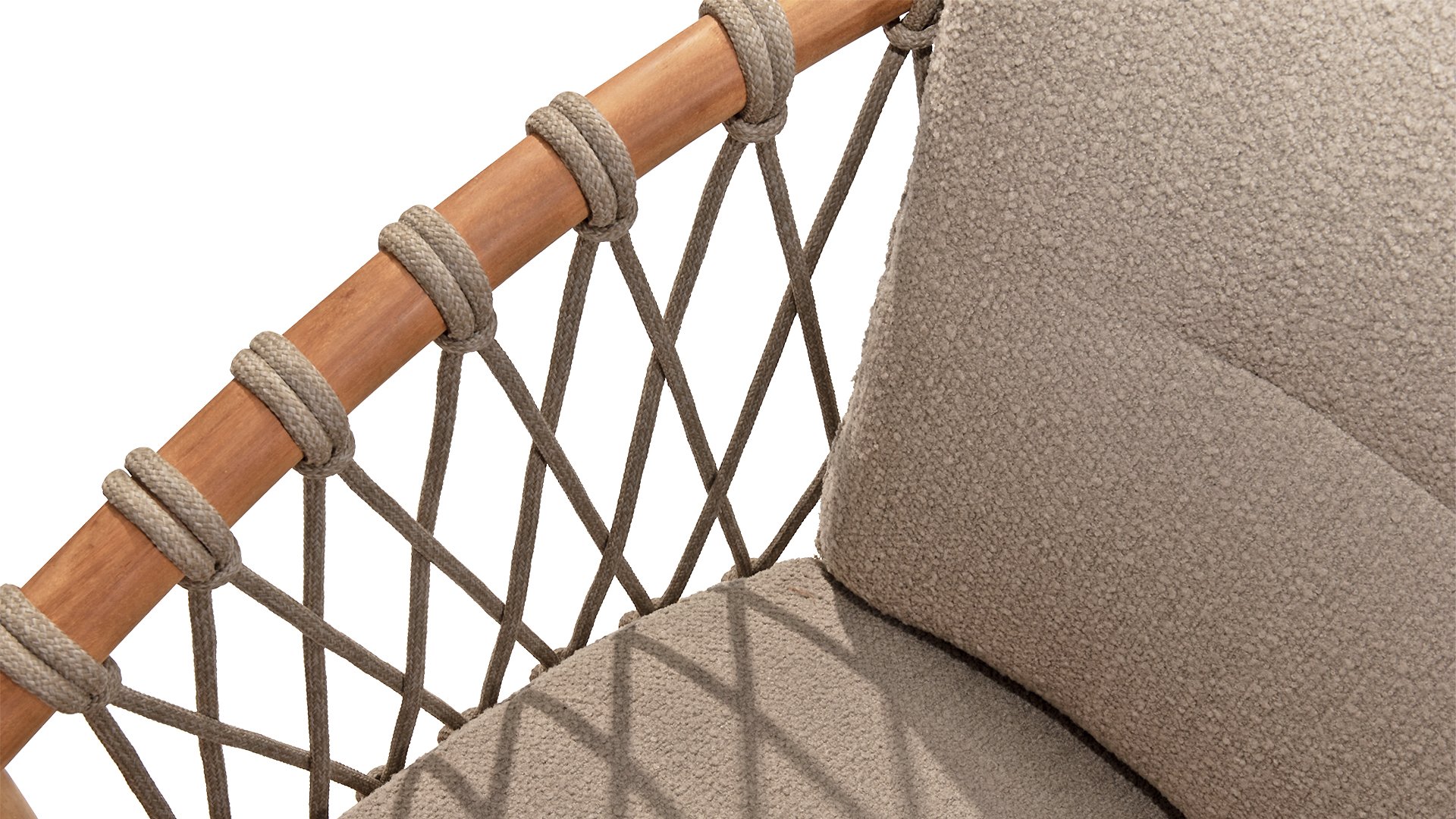 The 4 Seasons Outdoor Nora is a stylish and comfortable addition to your outdoor space. Made from durable teak wood and featuring elegant rope detailing, this chair not only offers a beautiful appearance but also a sturdy construction. The cushions are covered with Olefin and finished with trendy Bouclé upholstery, providing a luxurious feel and comfort.