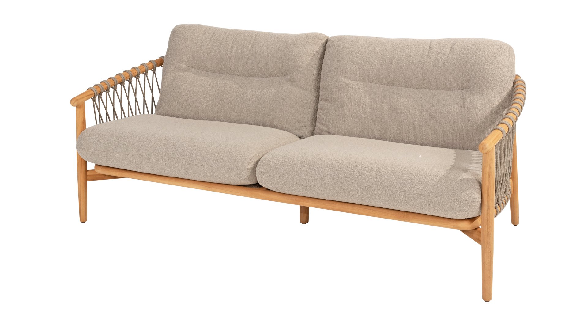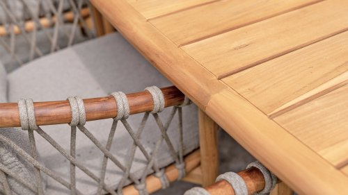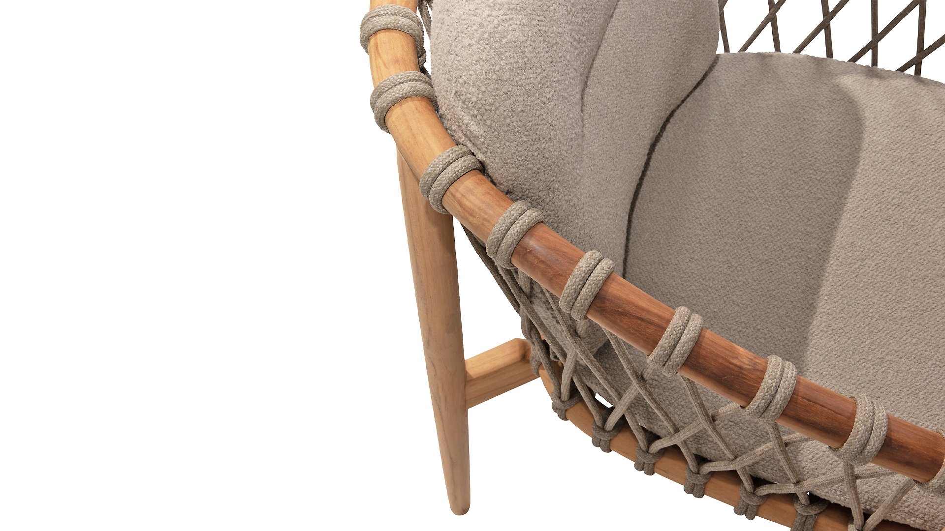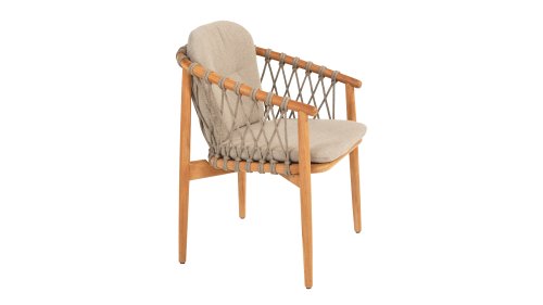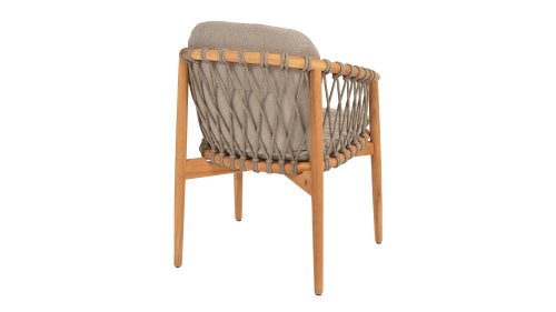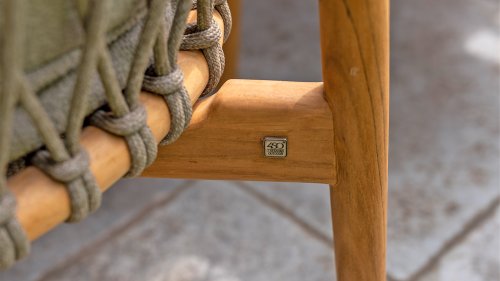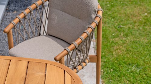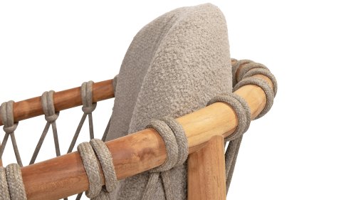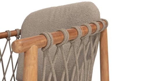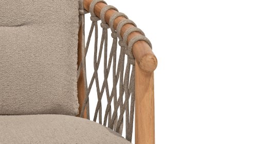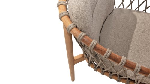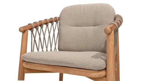 The 4 Seasons Outdoor Nora is a stylish and comfortable addition to your outdoor space. Made of durable teak wood and with an elegant rope design, this chair not only offers a beautiful look but also a sturdy construction. The cushions are upholstered with Olefin and finished with trendy Bouclé upholstery, providing a luxurious feel and comfort.