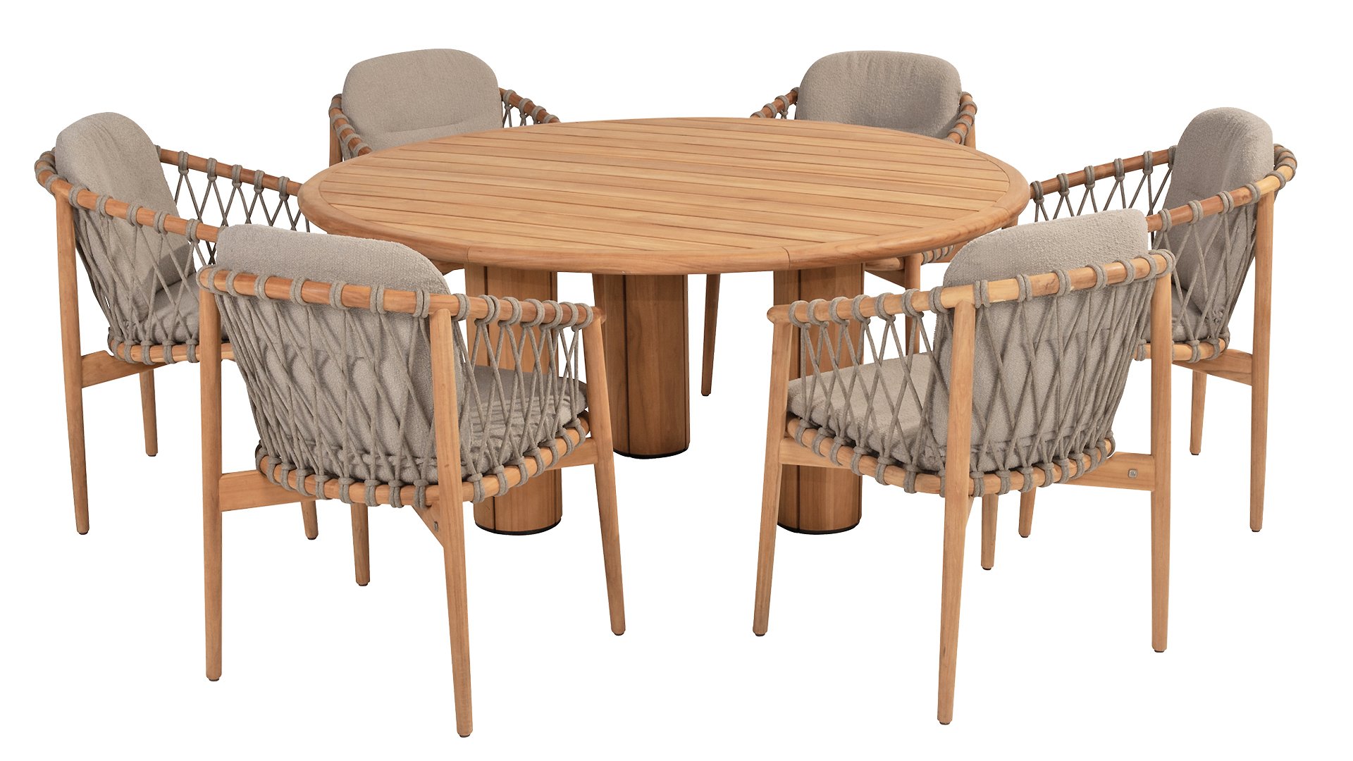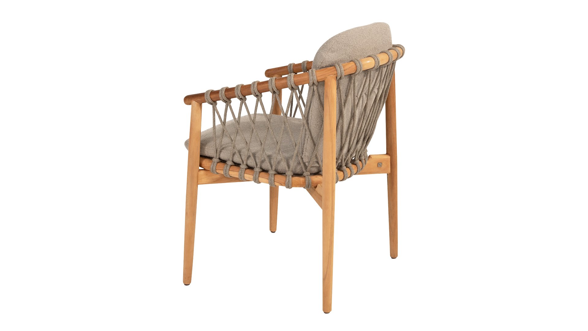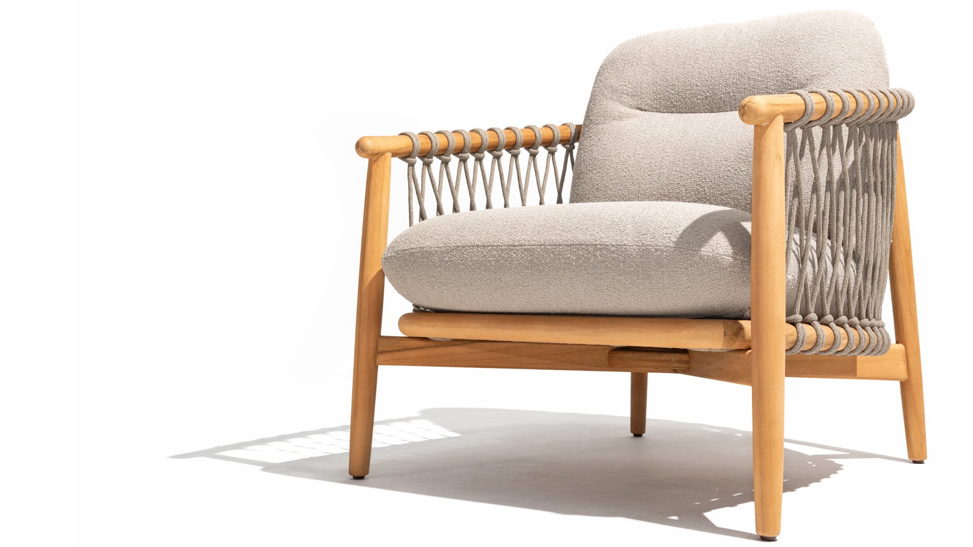 The 4 Seasons Outdoor Nora is a stylish and comfortable addition to your outdoor space. Made of durable teak wood and with an elegant rope design, this chair not only offers a beautiful look but also a sturdy construction. The cushions are upholstered with Olefin and finished with trendy Bouclé upholstery, providing a luxurious feel and comfort.