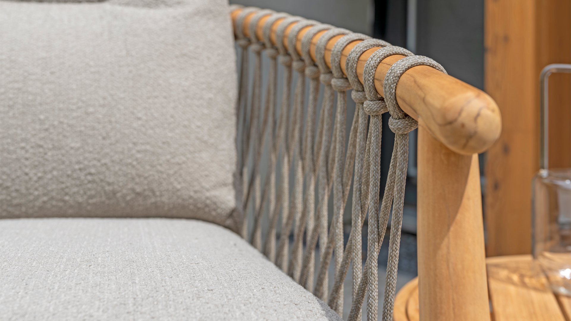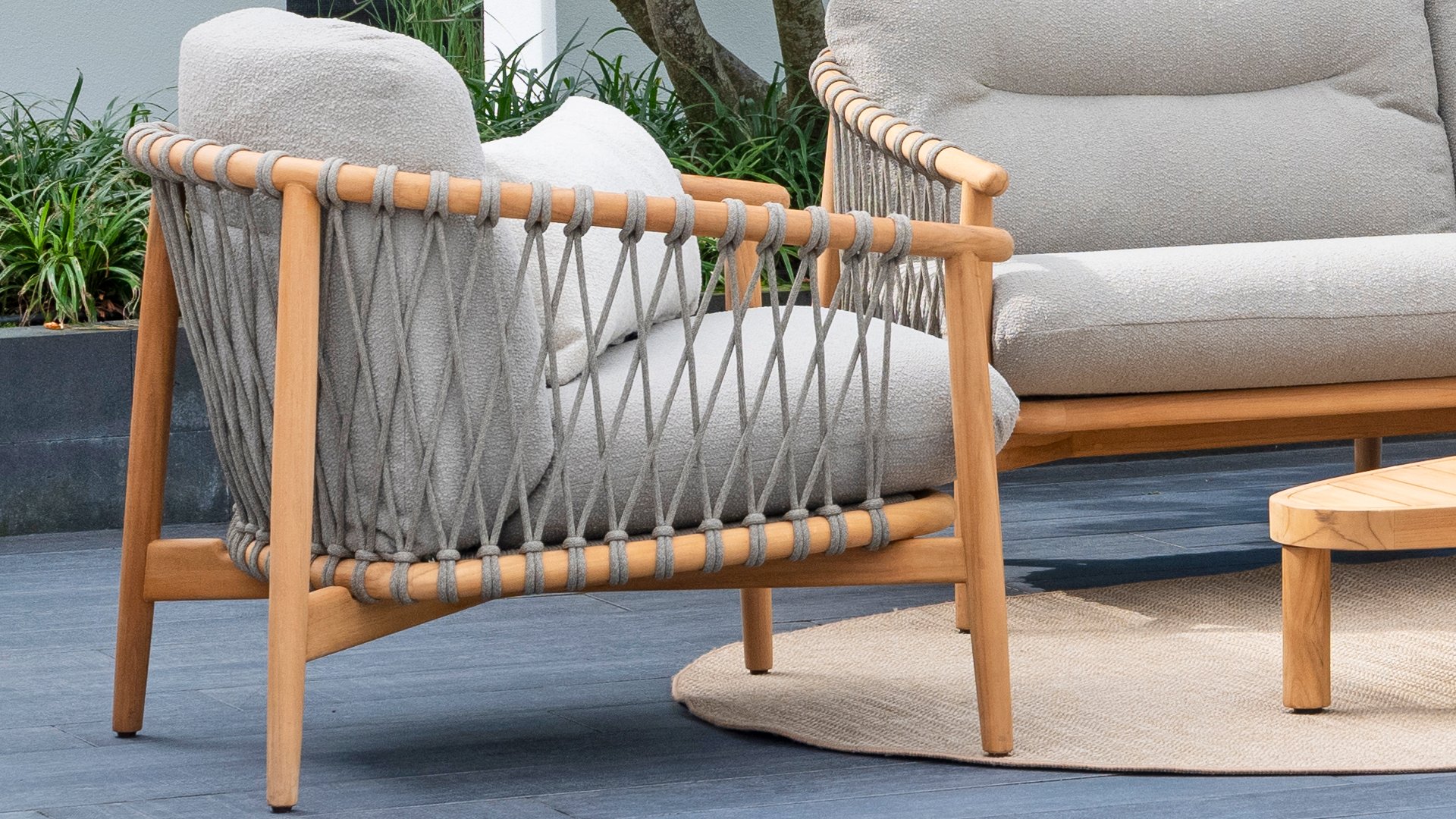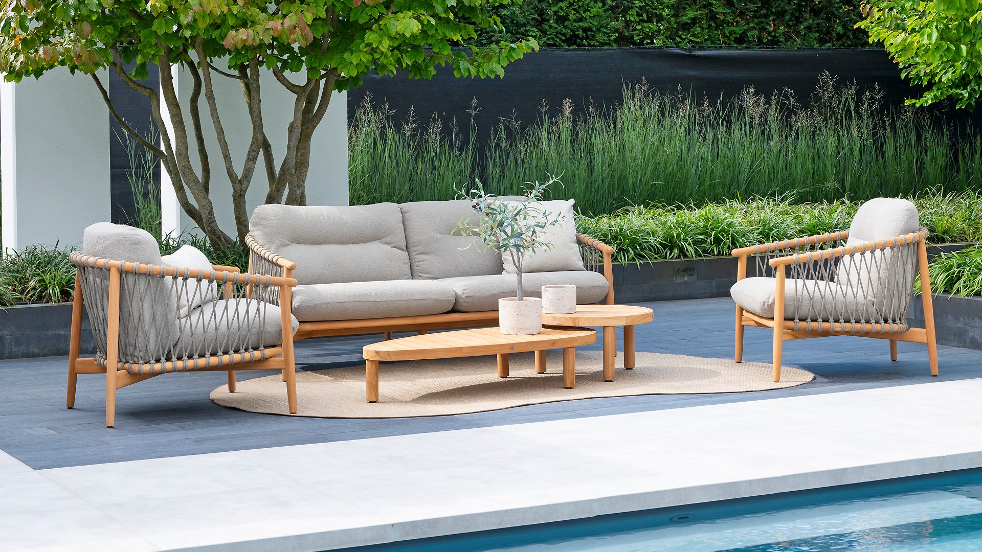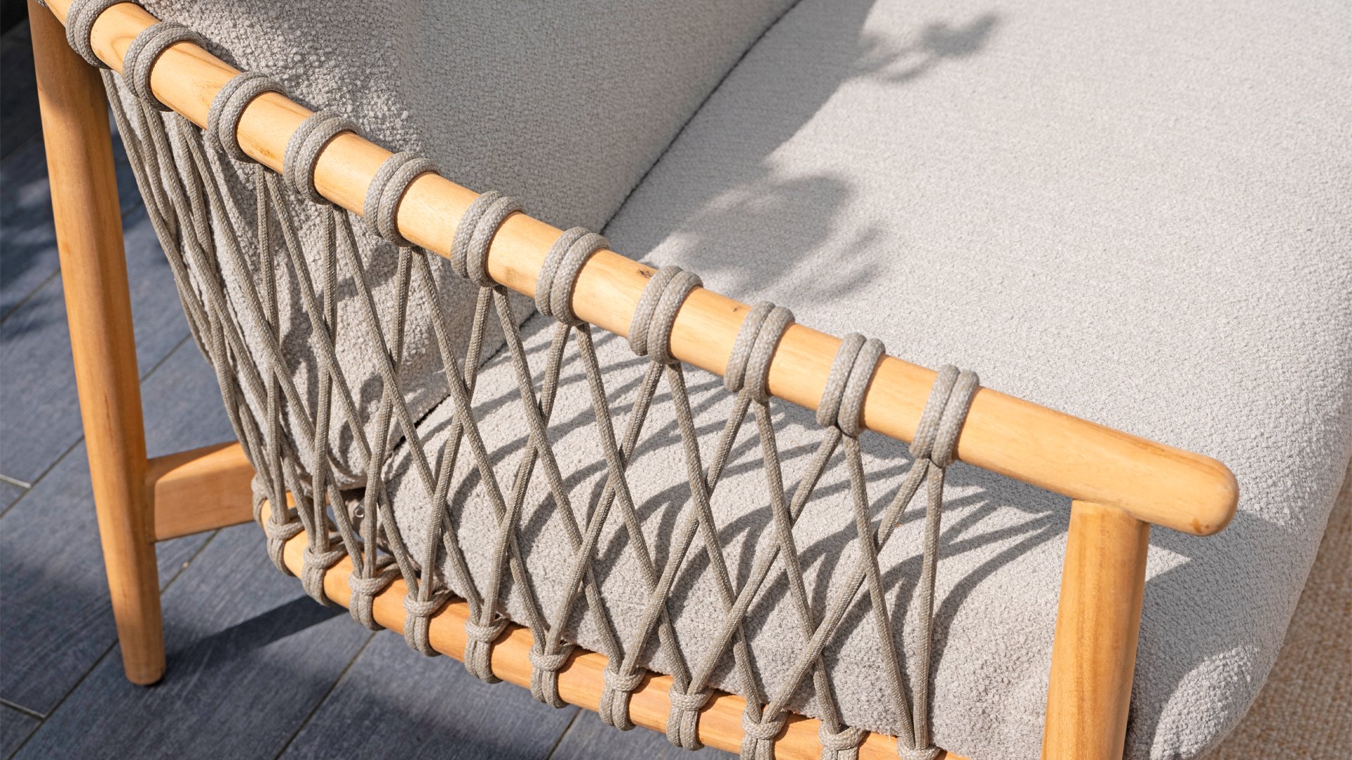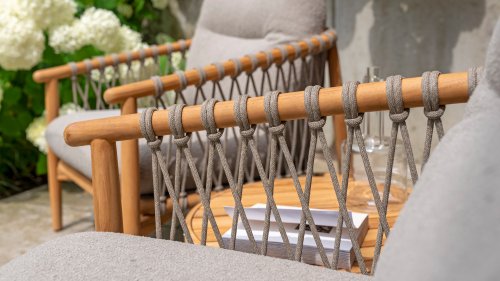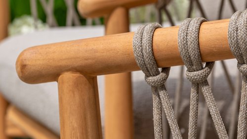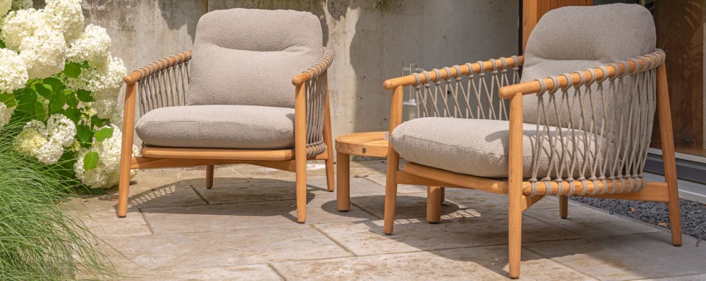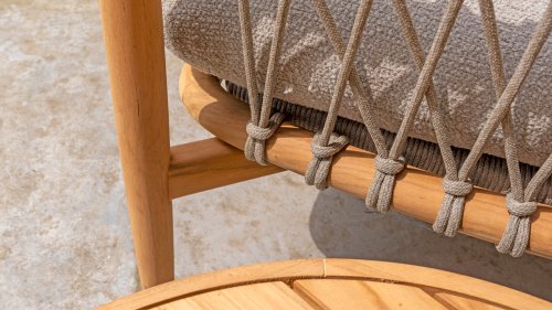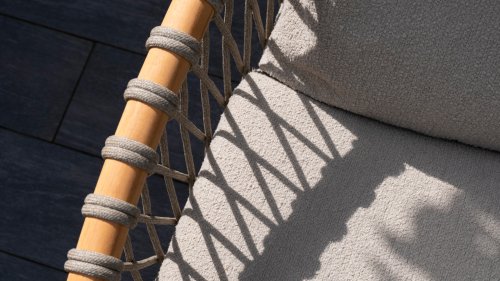 Natural, timeless design. The Nora series from 4 Seasons Outdoor is in many ways of unprecedented class. Beautiful curves in the teak frames of dining chair & loungeset feature an open rope pattern. We have incorporated thick, soft cushions with bouclé fabric that provide fantastic comfort.
