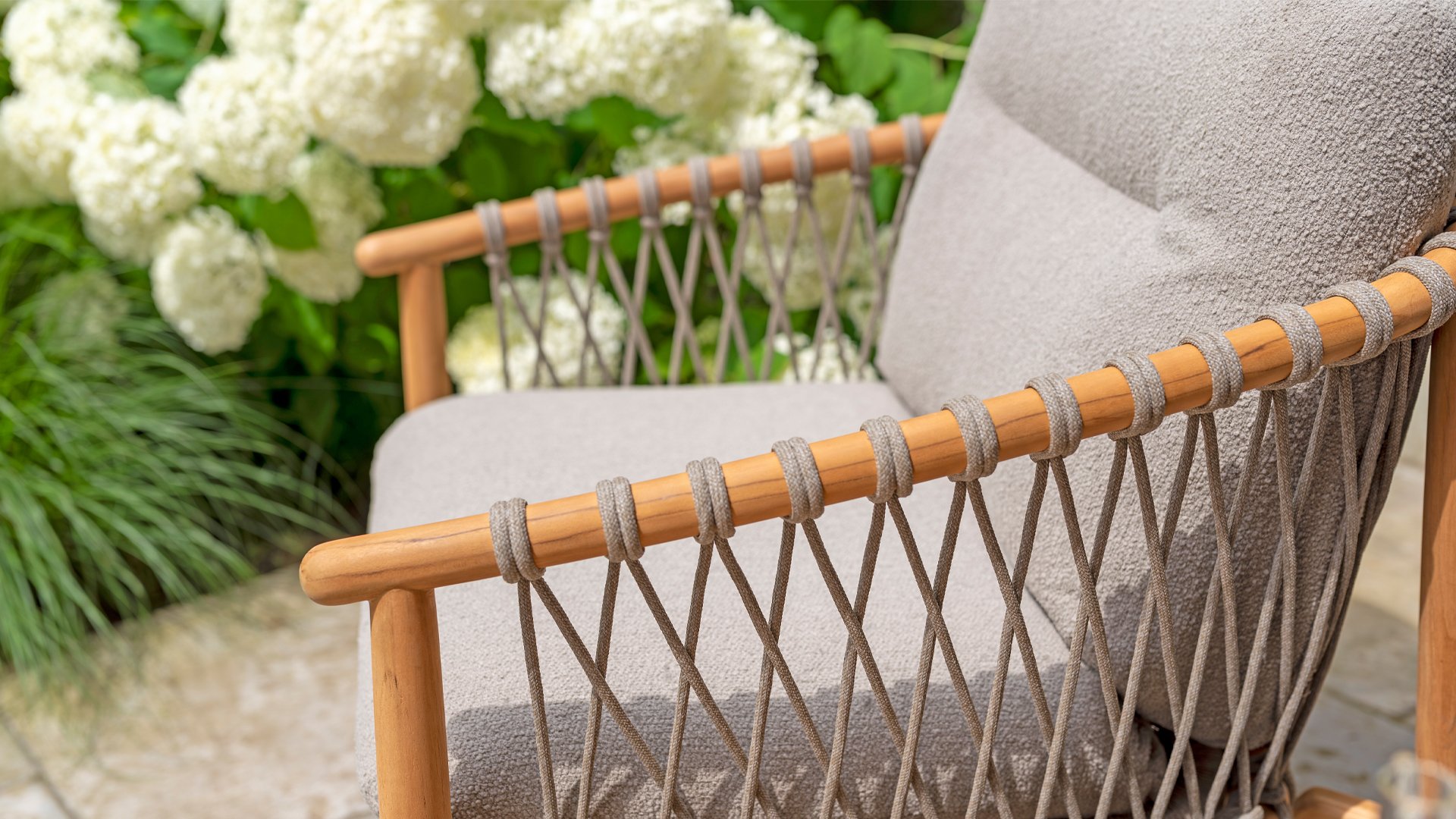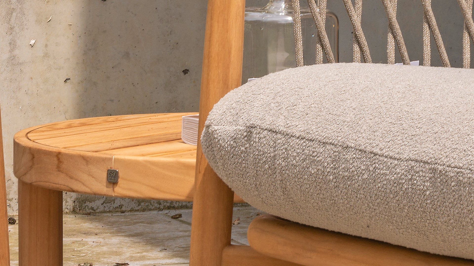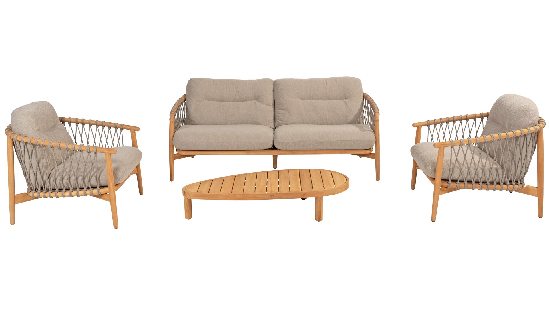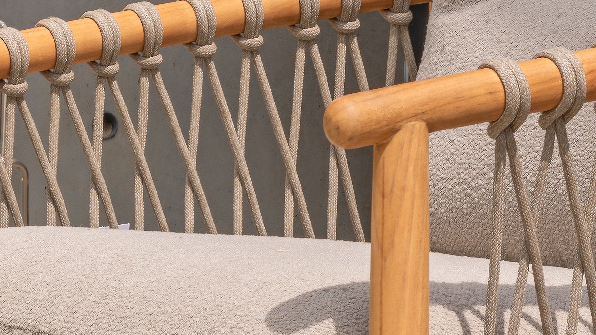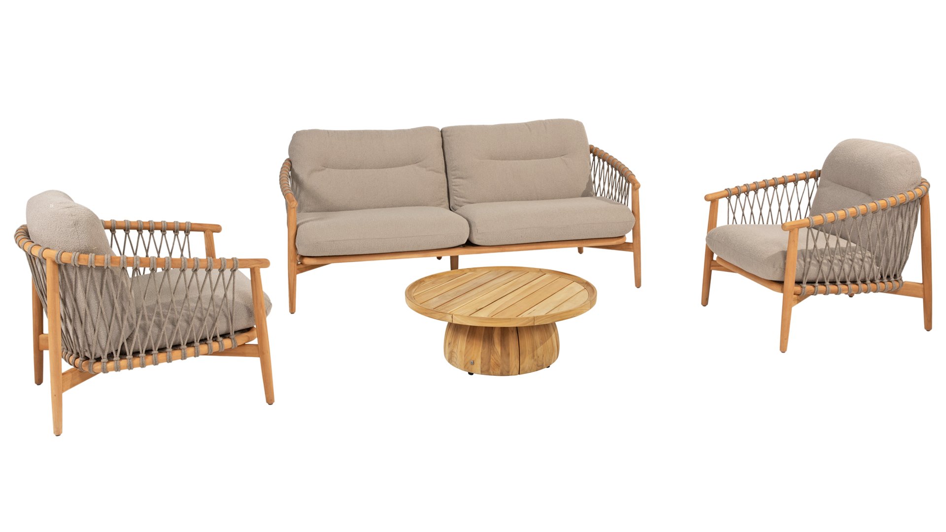 Natural, timeless design. The Nora series from 4 Seasons Outdoor is in many ways of unprecedented class. Beautiful curves in the teak frames of dining chair & loungeset feature an open rope pattern. We have incorporated thick, soft cushions with bouclé fabric that provide fantastic comfort.