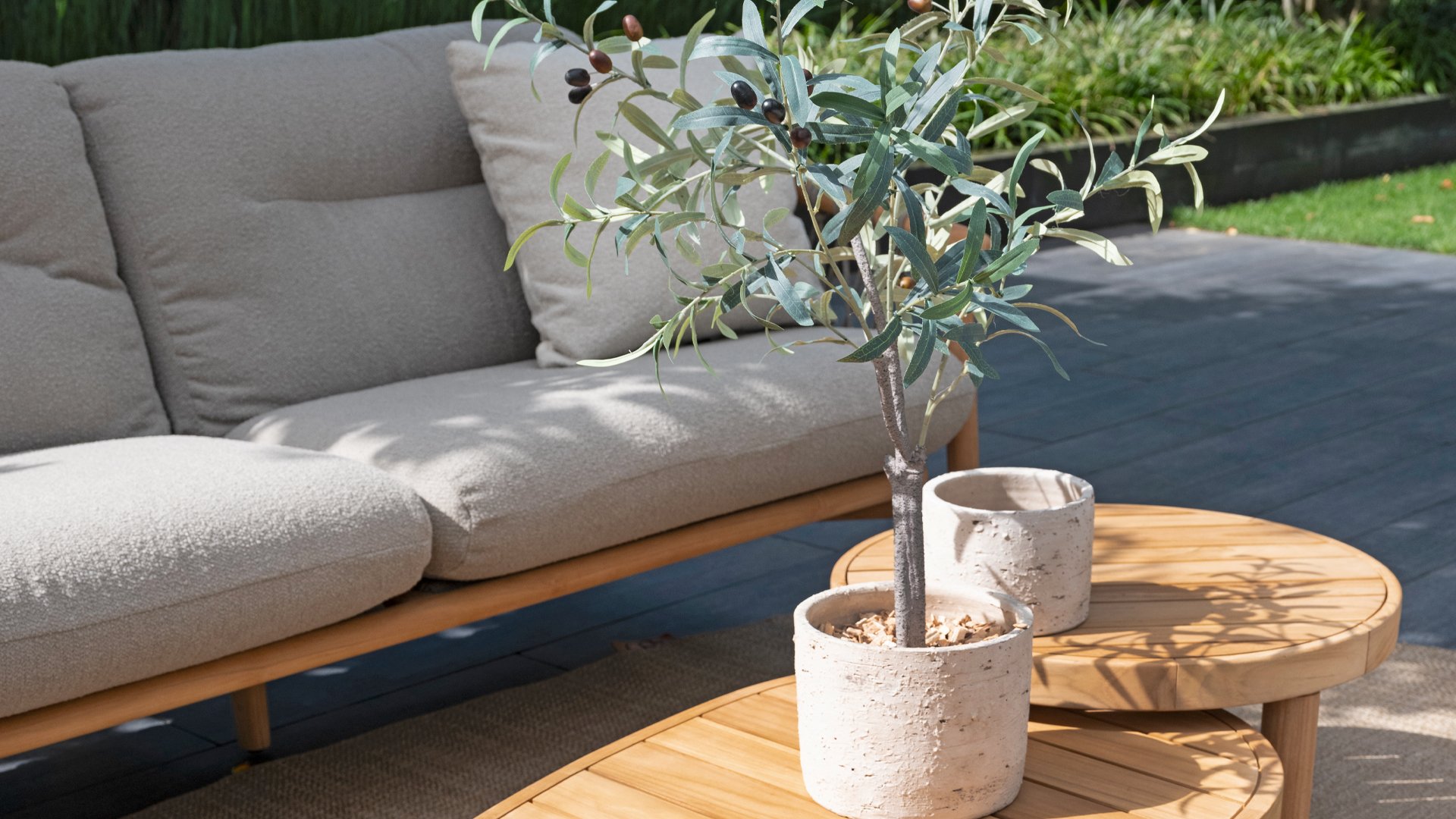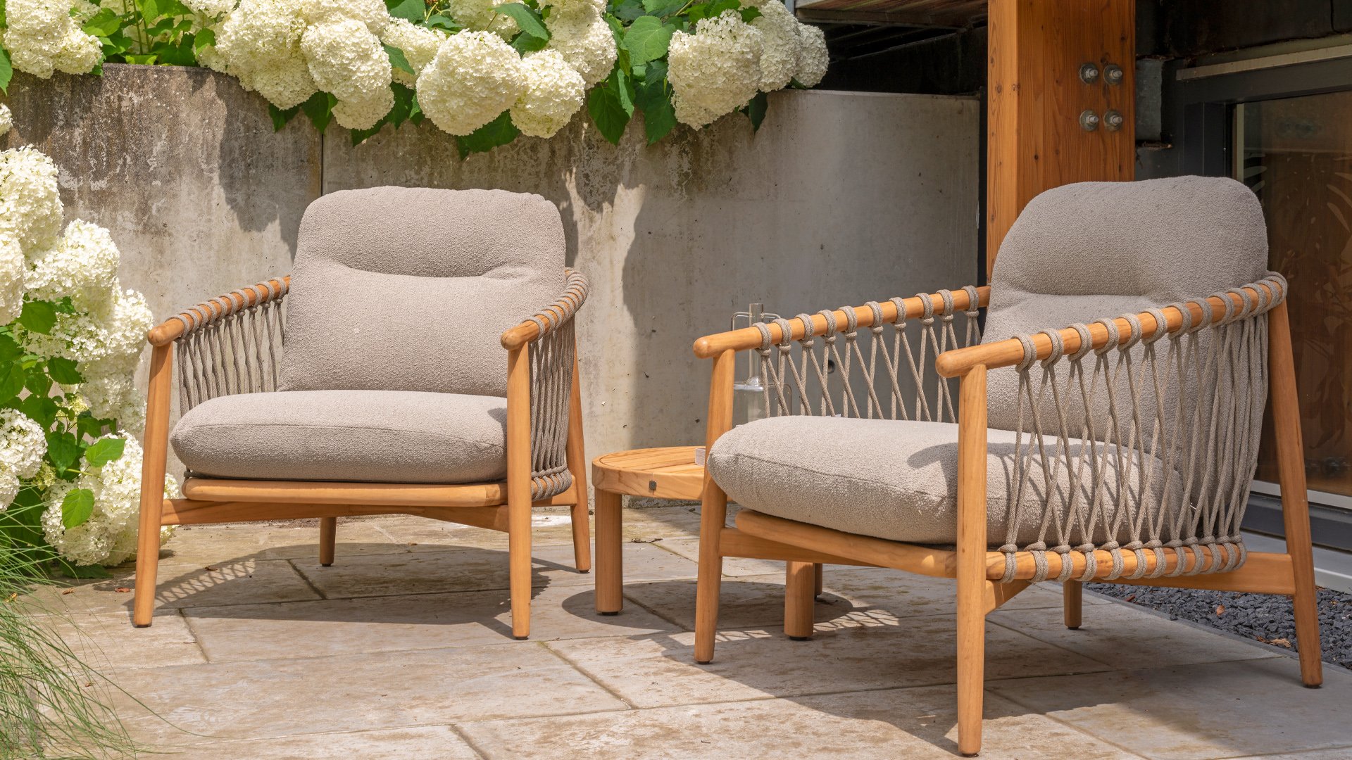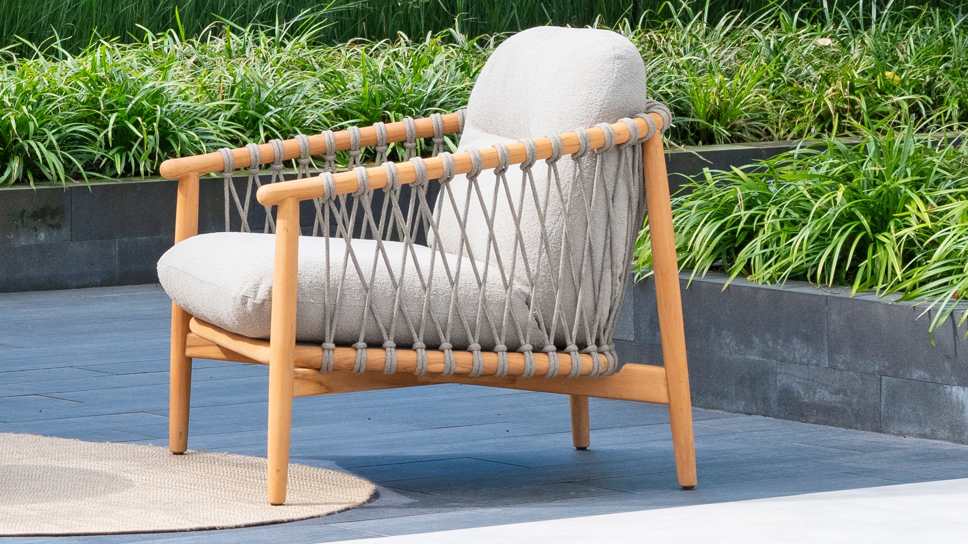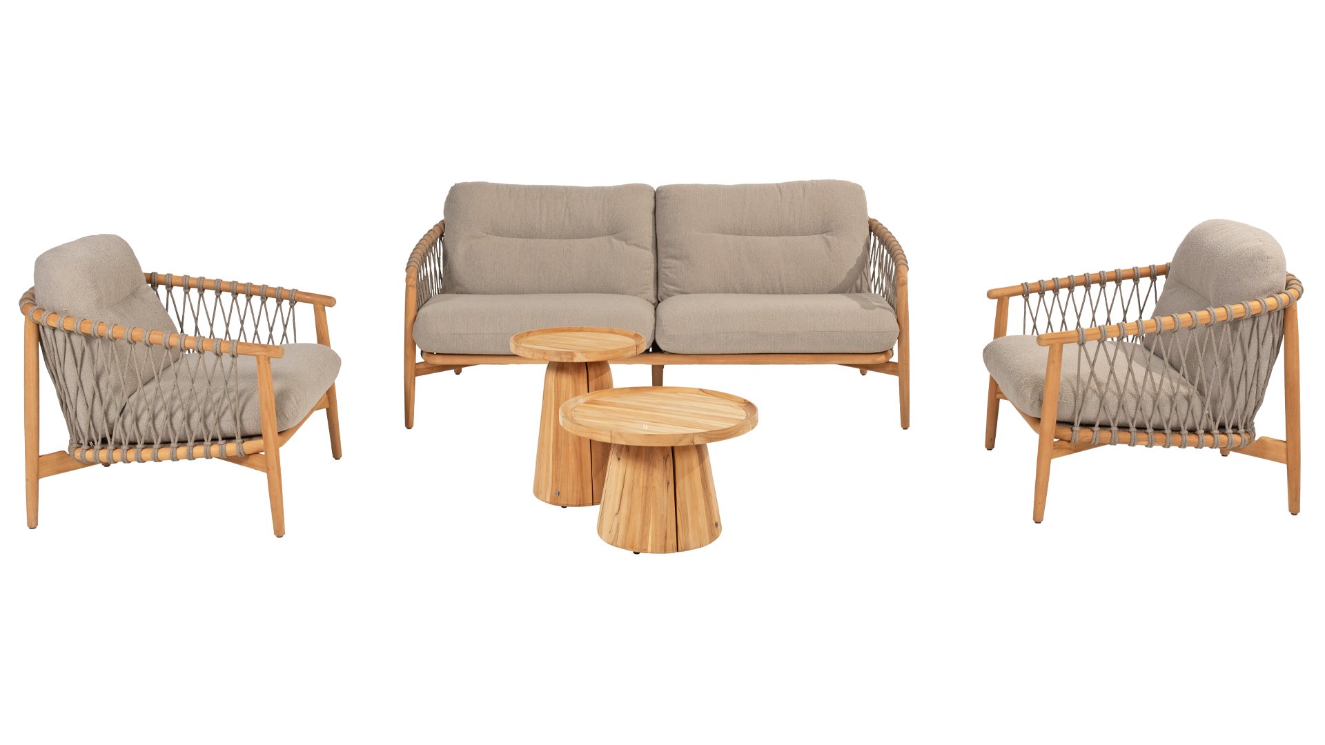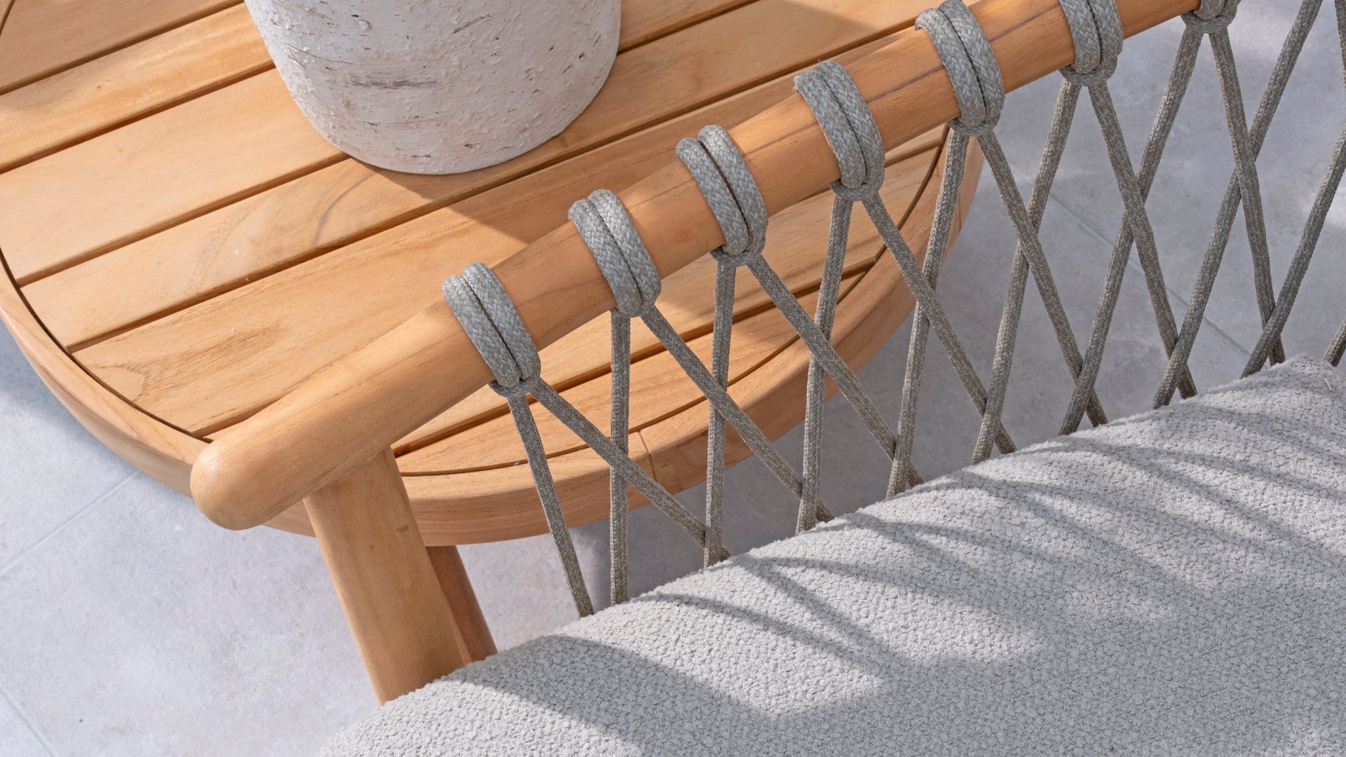 Natural, timeless design. The Nora series from 4 Seasons Outdoor is in many ways of unprecedented class. Beautiful curves in the teak frames of dining chair & loungeset feature an open rope pattern. We have incorporated thick, soft cushions with bouclé fabric that provide fantastic comfort.