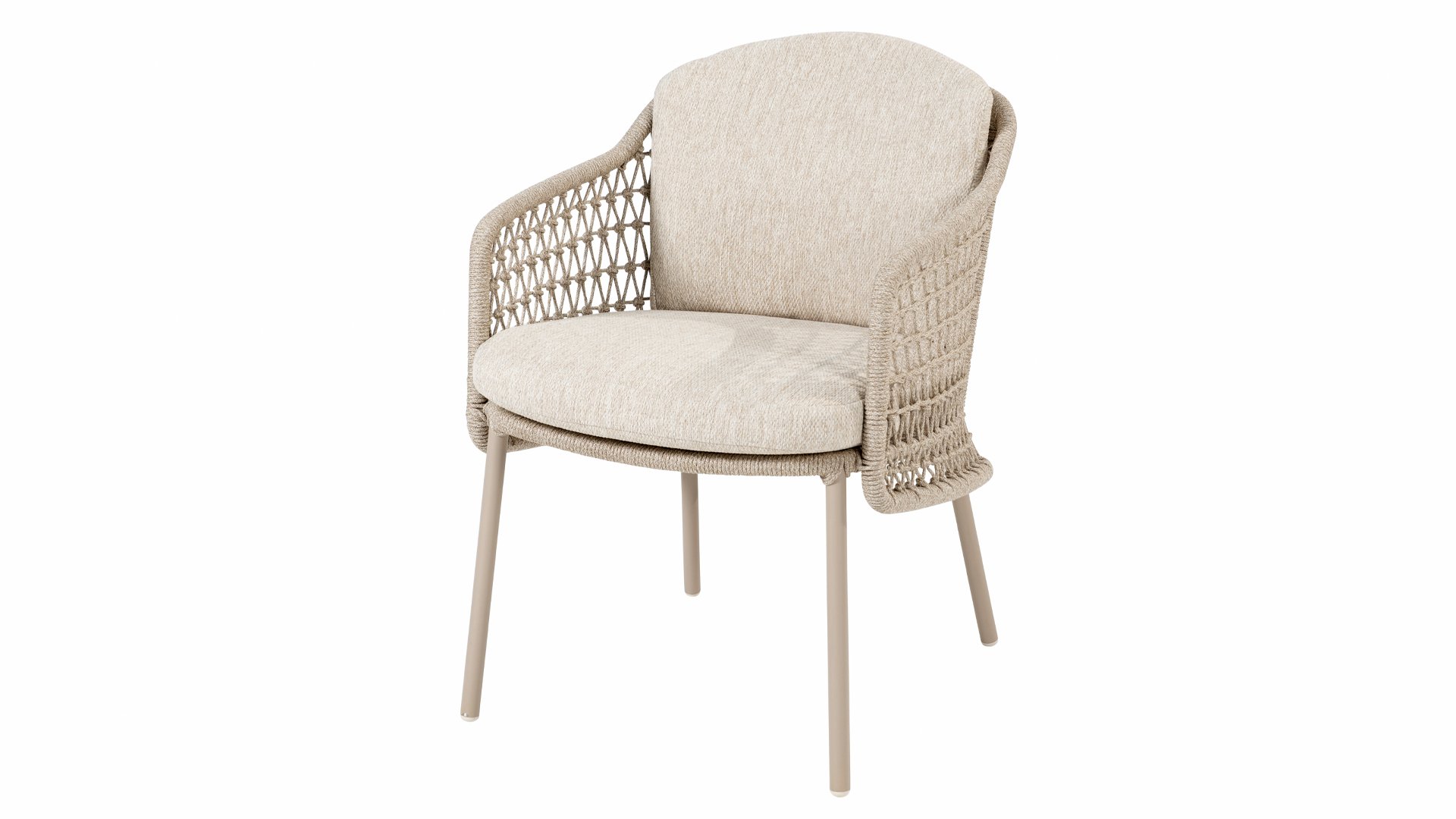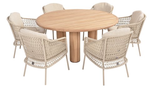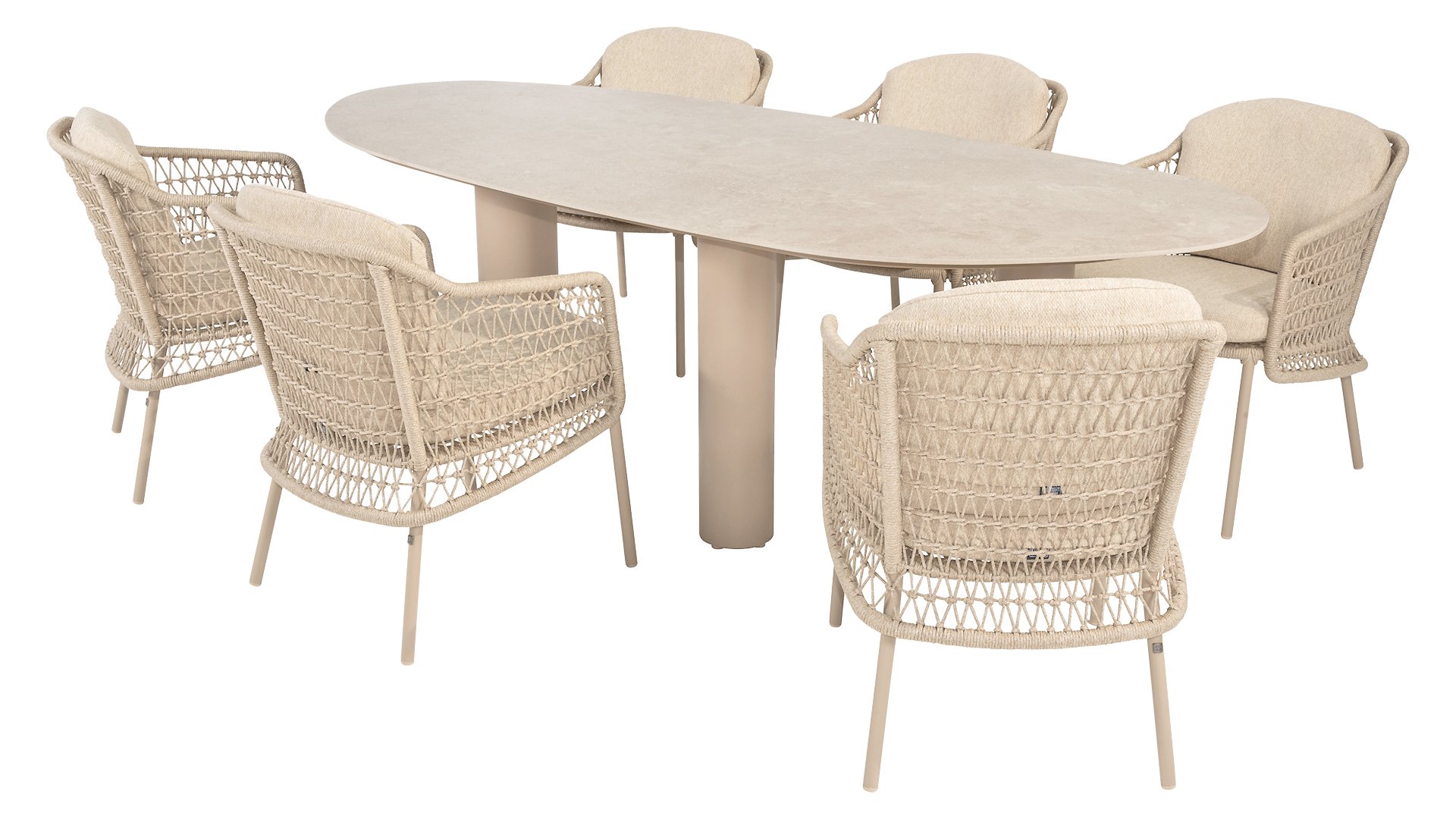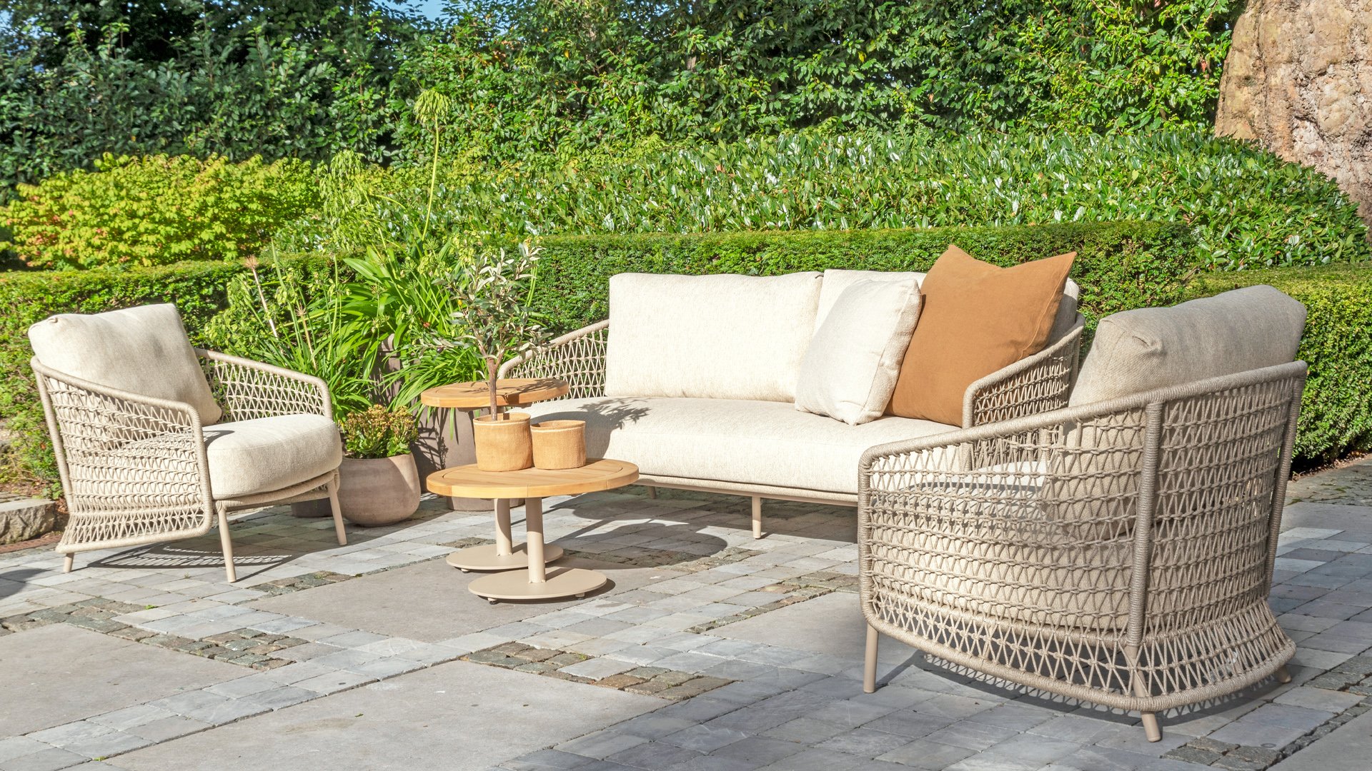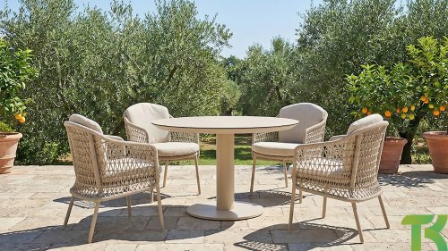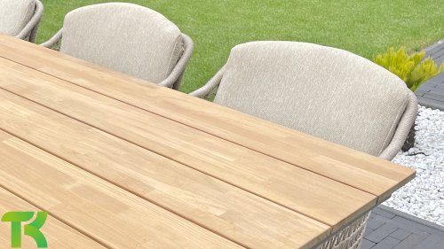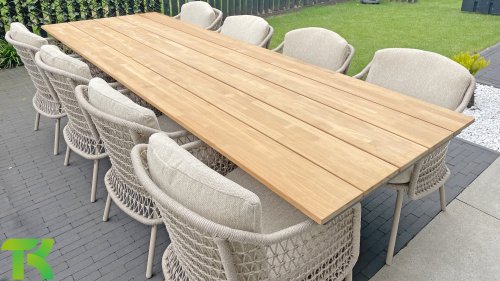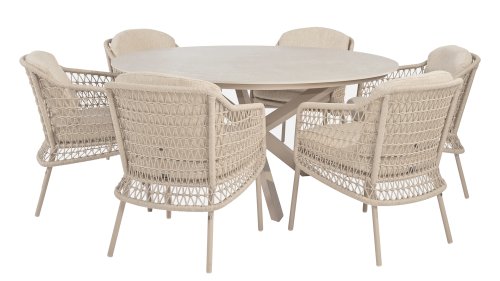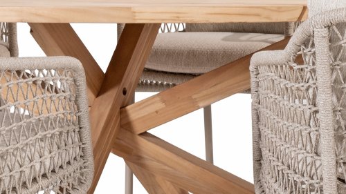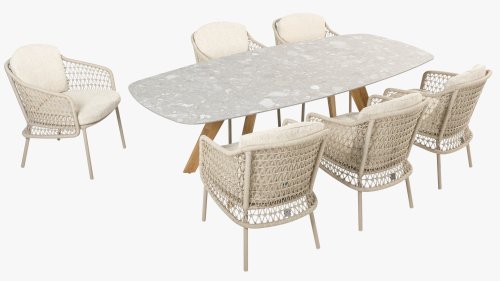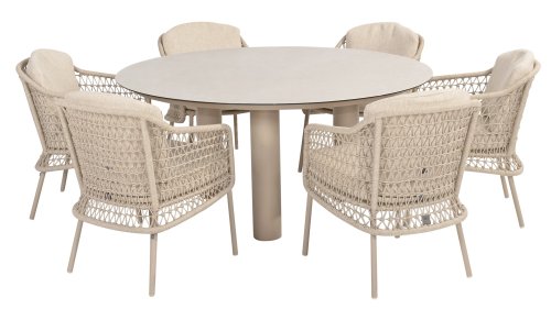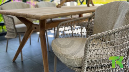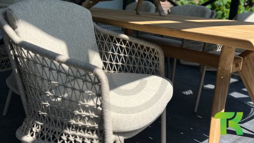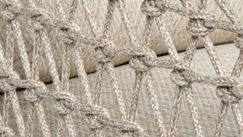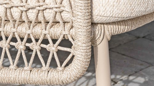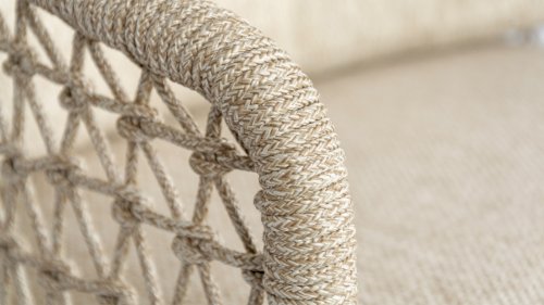 The Puccini series has a stainless steel base, combined with rope threads. Rope has a plastic core. This polypropylene base ensures that the rope barely stretches and does not absorb any moisture. The cover is made of an acrylic fabric, similar to the weather-resistant fabric of our garden cushions. This cover feels soft but is very water-repellent, UV-resistant, and colorfast.