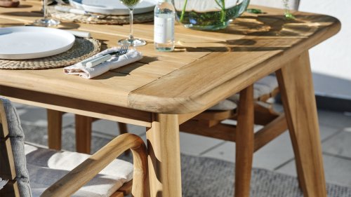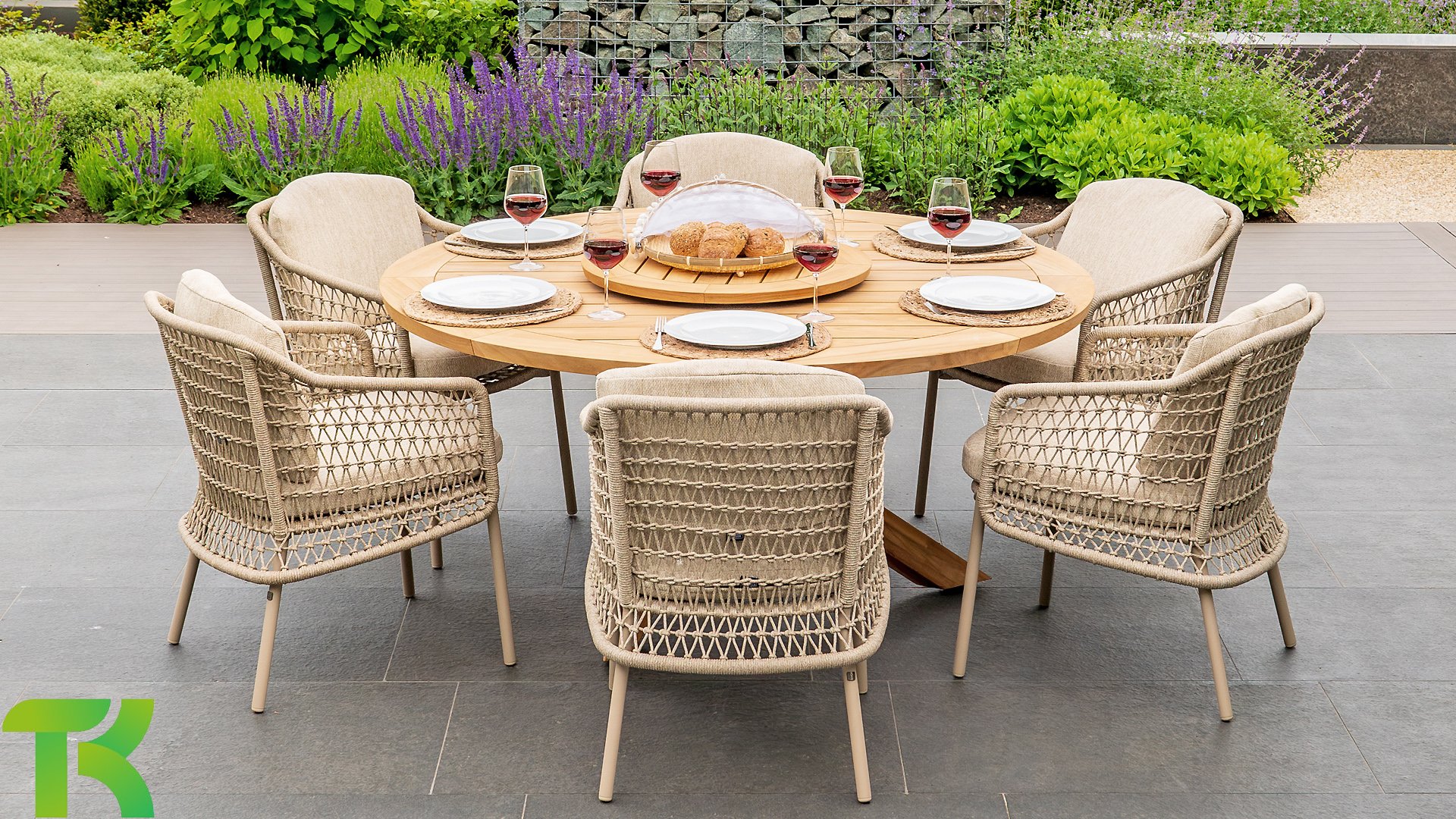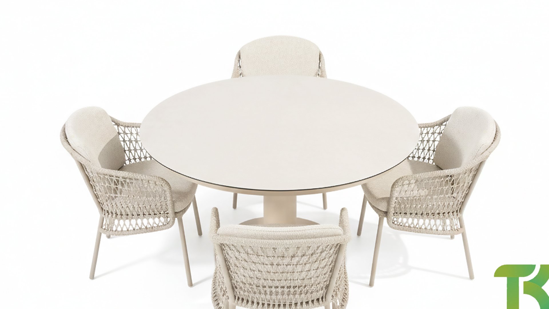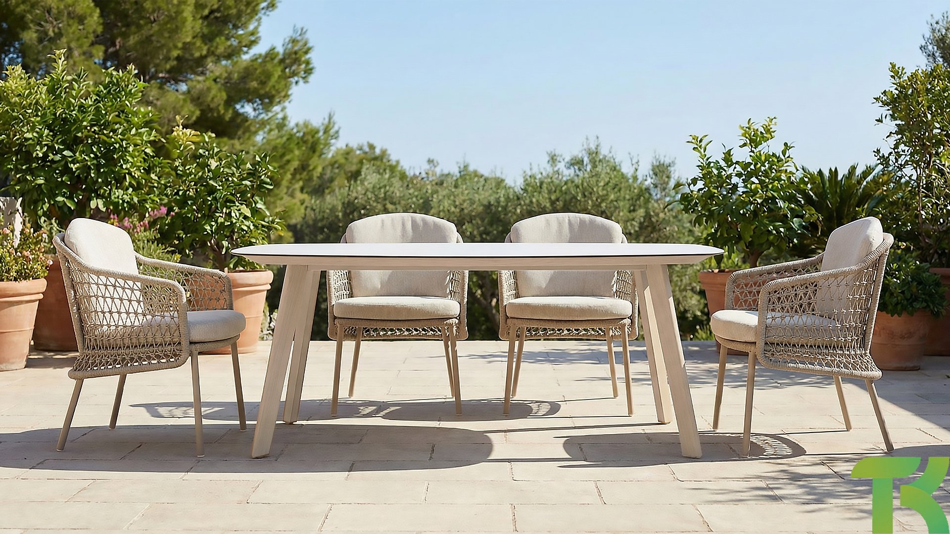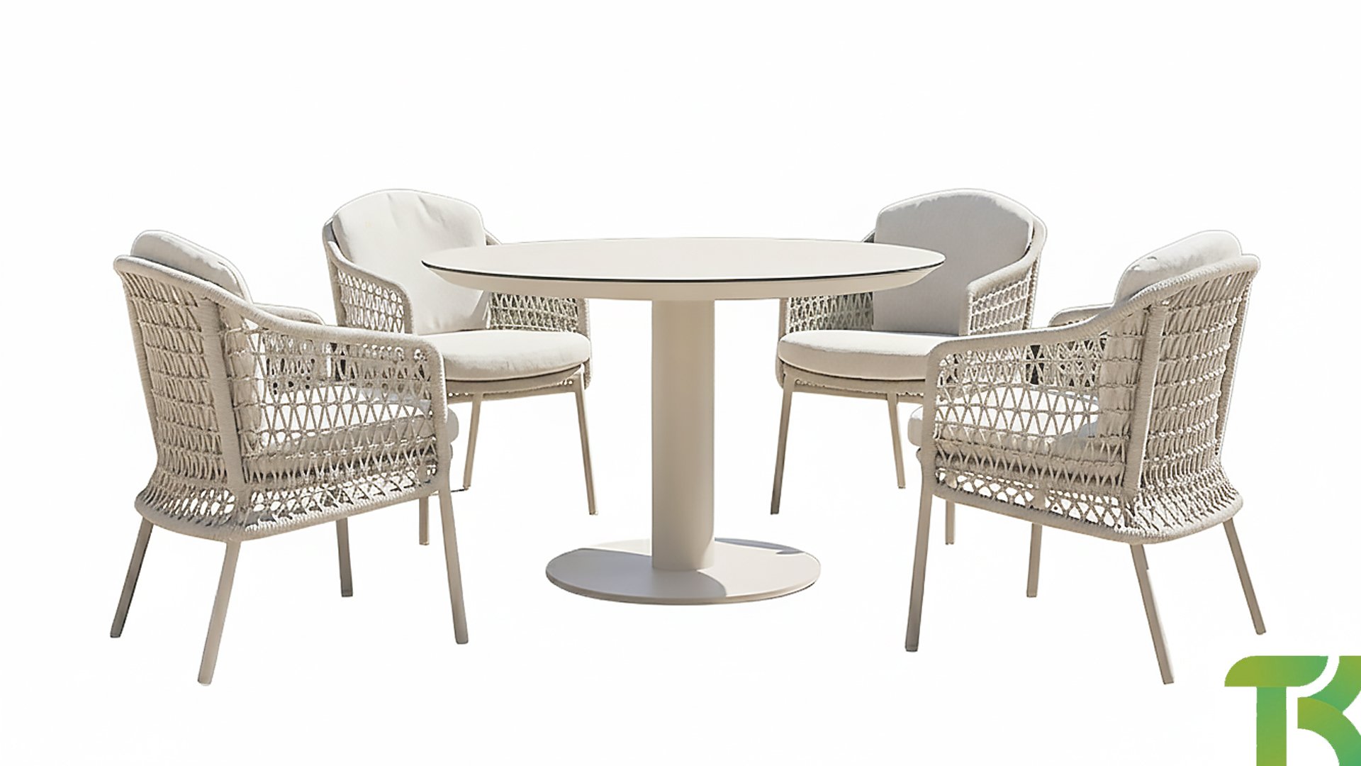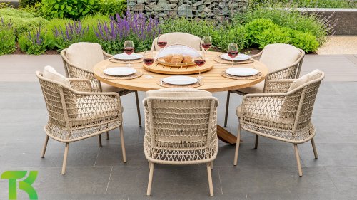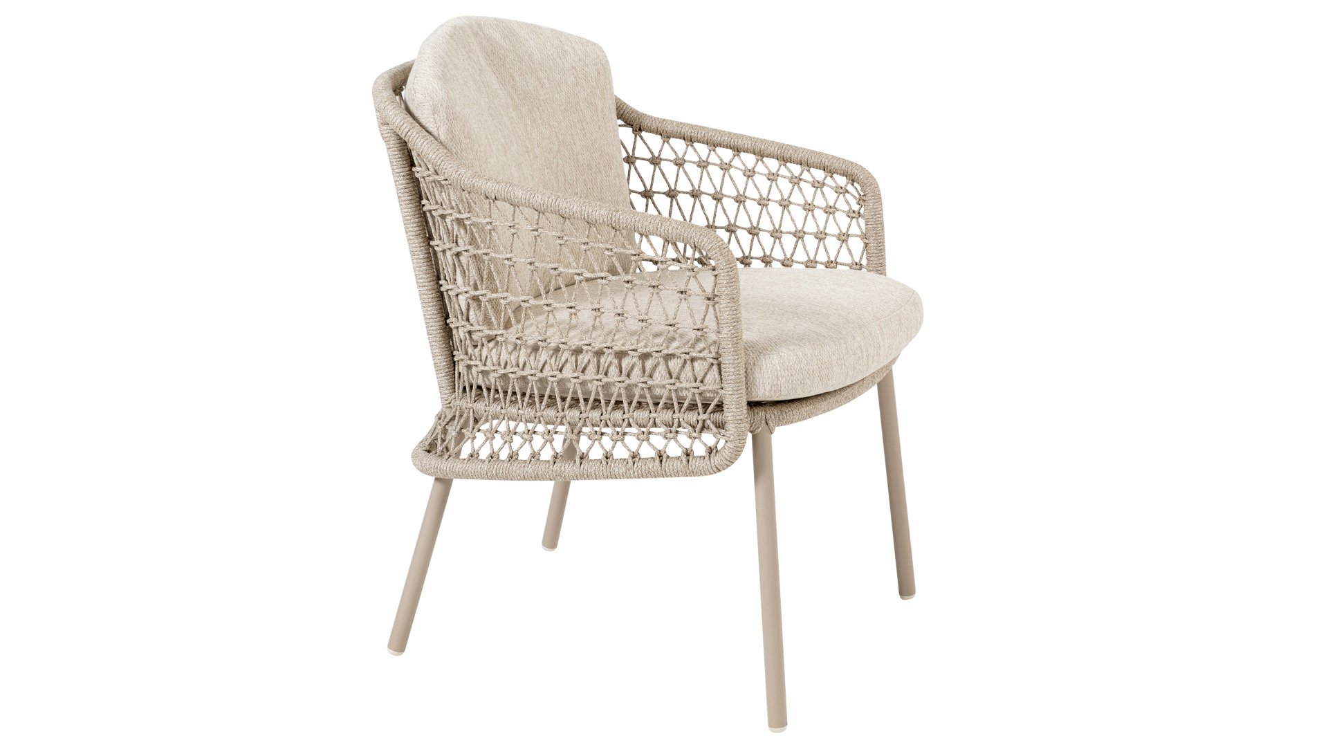 The Puccini series has a stainless steel base, combined with rope threads. Rope has a plastic core. This polypropylene base ensures that the rope barely stretches and does not absorb any moisture. The cover is made of an acrylic fabric, similar to the weather-resistant fabric of our garden cushions. This cover feels soft but is very water-repellent, UV-resistant, and colorfast.