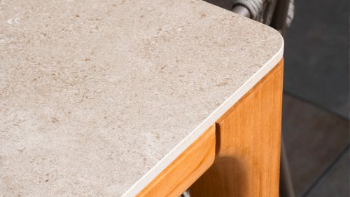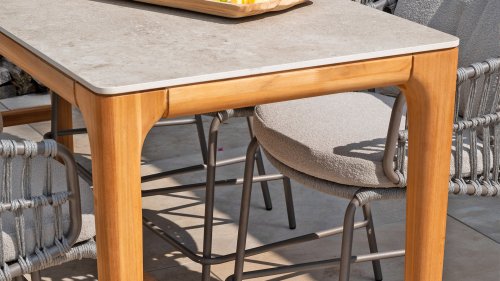 The Liam 240cm Ceramic is a beautiful addition to any dining space, with a generous size of 240x100x75 cm. The teak frame provides a warm, natural look and ensures stability and durability. Teak wood is perfect for long-term use and can withstand various weather conditions, making the table suitable for both indoor and outdoor applications. The ceramic top adds a contemporary touch and is easy to maintain. It is resistant to stains and scratches, making it ideal for daily meals and special occasions. The rectangular shape of the Liam table is characterized by round corners and finishes, creating a soft, inviting look. This design not only makes the table practical but also stylish, fitting perfectly into various interior styles, from modern to rustic. The Liam is available in full teak wood or ceramic-teak wood: