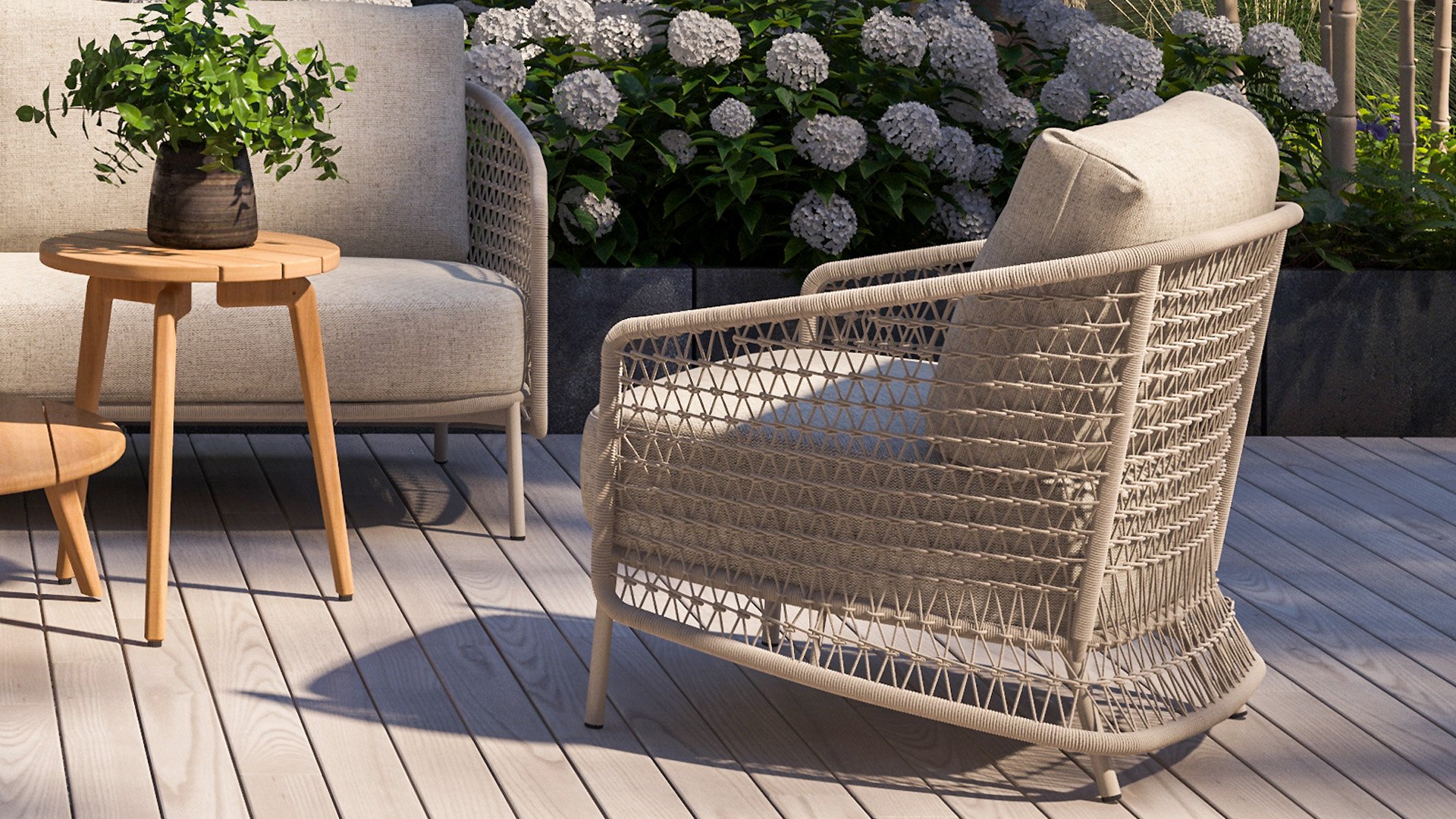 The Puccini series has a stainless steel base, combined with rope strings. Rope has a plastic core. This polypropylene base ensures that the rope stretches minimally and does not absorb any moisture. The casing is made of an acrylic fabric, similar to the weather-resistant fabric of our garden cushions. This casing feels soft but is very water-repellent, UV-resistant, and colorfast. The experienced 4SO weavers are able to weave exceptional knots and patterns with these materials. This is how we make garden furniture by 4 Seasons Outdoor extra special, and of very high quality!