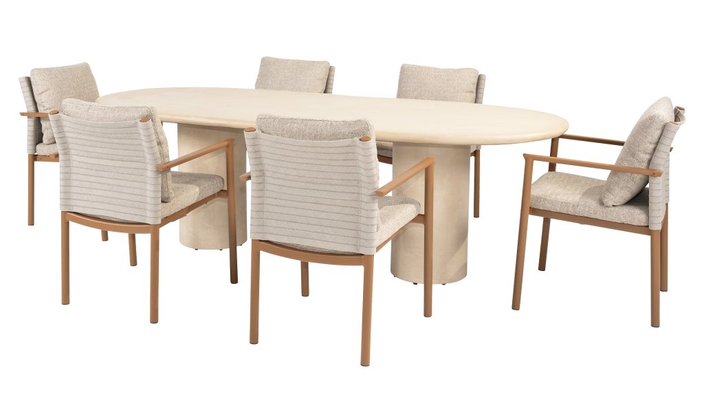 Meet Hampton: the perfect balance between refined elegance and robust simplicity. This beautiful garden table in a stylish beige/white hue exudes tranquility and luxury, and forms the heart of any outdoor space – from intimate dinners to long summer evenings with friends and family. The Hampton is crafted from high-quality Mortex, a durable and waterproof material known for its natural look and exceptional weather resistance. Each tabletop is hand-finished, creating a unique, warm look that effortlessly complements both modern and Mediterranean gardens. The table is available in various sizes, so there's always a Hampton to suit your outdoor living space. Choose the round Ø160cm version for a cozy setting with a single, elegant central leg, or opt for the generous oval 240cm or 300cm versions, both featuring two sleek, vertical legs that provide stability and a bold, linear design. For those who prefer a more relaxed dining experience, there's also a low-dining version Ø160cm, ideal for relaxing moments in lounge style.