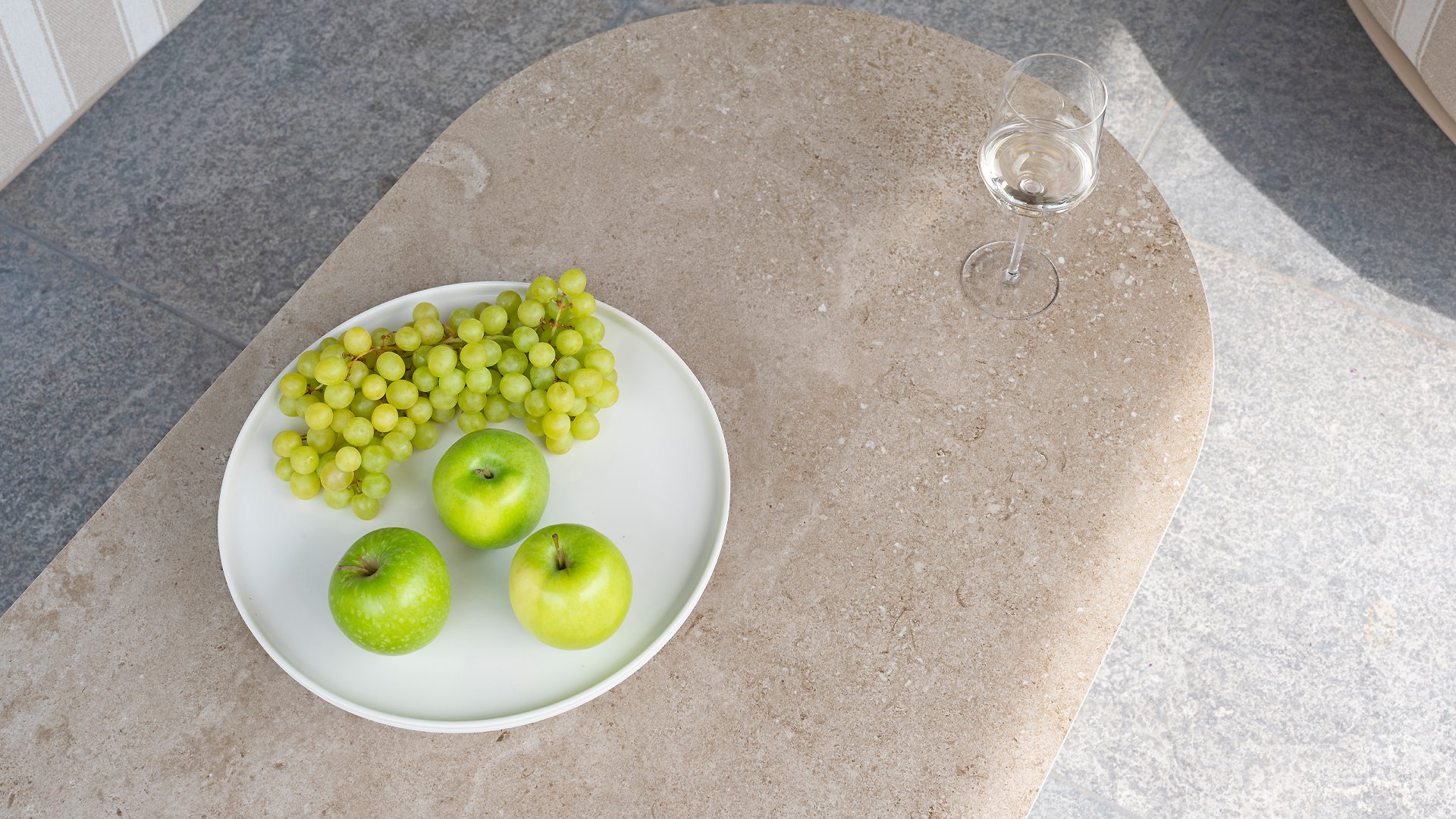 Mortex is made from a mixture of lime, cement, and fine mineral powders. Pigments and resins are added to this mixture to make it flexible, waterproof, and adhere well. It is applied by hand in thin layers and then sanded and finished with a protective sealer or wax. This creates a seamless, strong, and stylish surface suitable for furniture, floors, and walls, among other things. A Mortex garden table is weatherproof. Rain, sunlight, and temperature fluctuations have little effect on the material, provided the table is properly finished with a protective layer. It is important to be careful with acidic substances such as lemon juice, vinegar, or wine. If these remain on the surface for too long, they can damage the protective layer and cause stains.