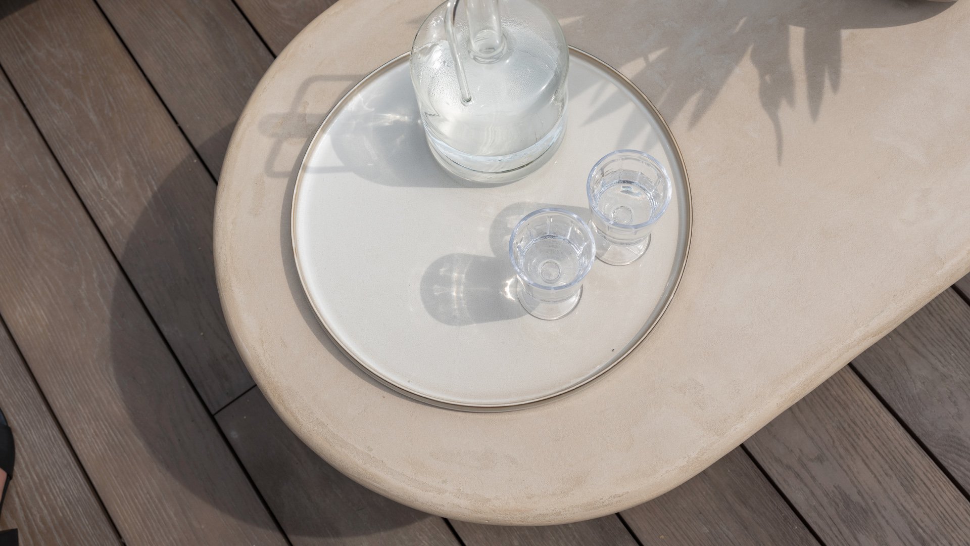 Mortex is made from a mixture of lime, cement, and fine mineral powders. Pigments and resins are added to this mixture to make it flexible, waterproof, and adhere well. It is applied by hand in thin layers and then sanded and finished with a protective sealer or wax. This creates a seamless, strong, and stylish surface suitable for furniture, floors, and walls, among other things. A Mortex garden table is weatherproof. Rain, sunlight, and temperature fluctuations have little effect on the material, provided the table is properly finished with a protective layer. It is important to be careful with acidic substances such as lemon juice, vinegar, or wine. If these remain on the surface for too long, they can damage the protective layer and cause stains.