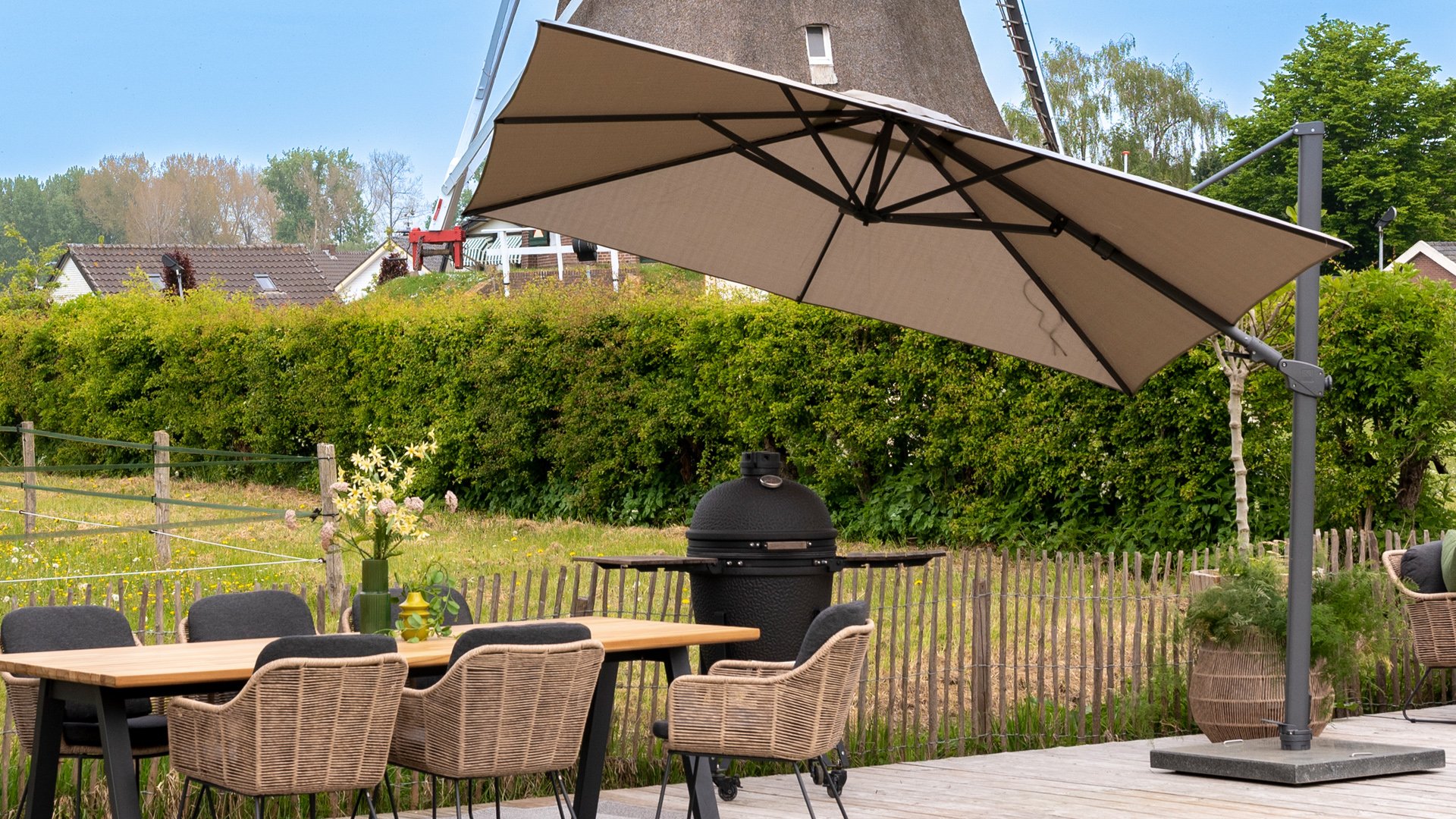 4Seasons Outdoor Siesta is a high-quality cantilever umbrella. Made from an aluminum frame, it stands for heavy quality. The fabric is made of Solefin. This material is characterized by its high colorfastness and durability. Standard 5-year warranty.