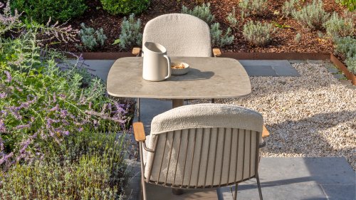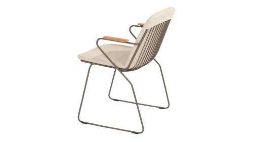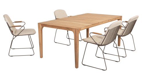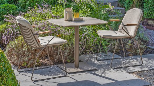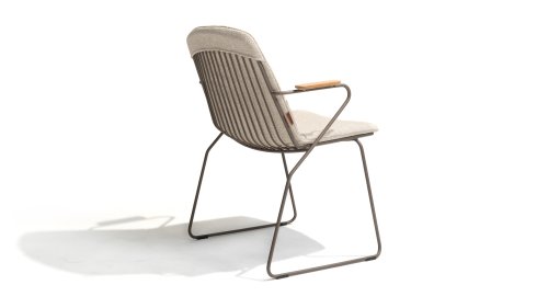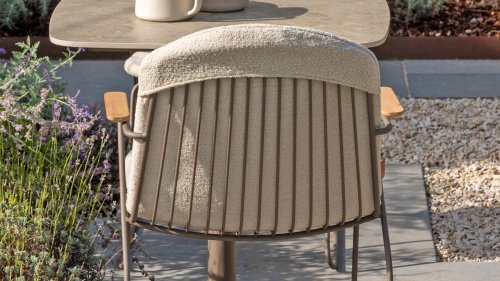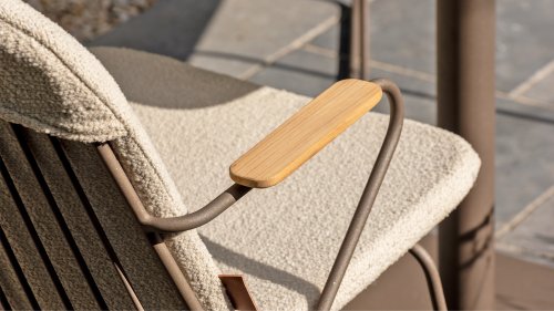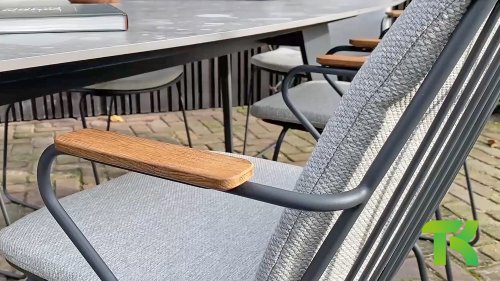 There is nothing like 4 Seasons Outdoor Veneto Unique in its kind, the minimalist Veneto dining chair made of thin stainless steel tubes available in the colors Antraciet, Terre & Olive. An ergonomic design, teak armrests and the cushion that you easily slide over the backrest. Veneto is also stackable, truly a one-of-a-kind dining chair.