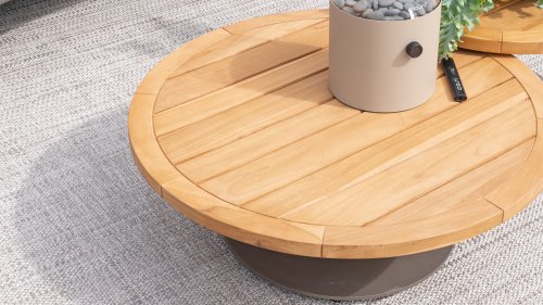 Discover the beauty and versatility of the 4 Seasons Outdoor Volta round coffee table with its stunning teak tabletop and stainless steel frame. This table adds a touch of natural elegance to your outdoor space and is designed with attention to detail.