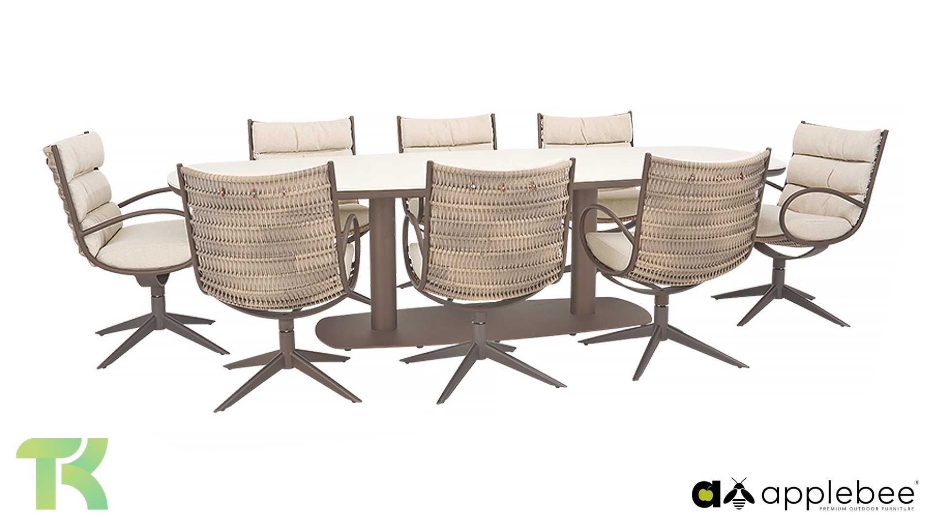 The Apple Bee Camp Bay Bronze: fresh, elegant, and comfortable. This dining set combines a bold, dark color palette with smart functionality, allowing you to enjoy unparalleled comfort on long summer evenings. The organic shapes and hues create a haven of tranquility in the garden, while the robust materials ensure years of enjoyment.
