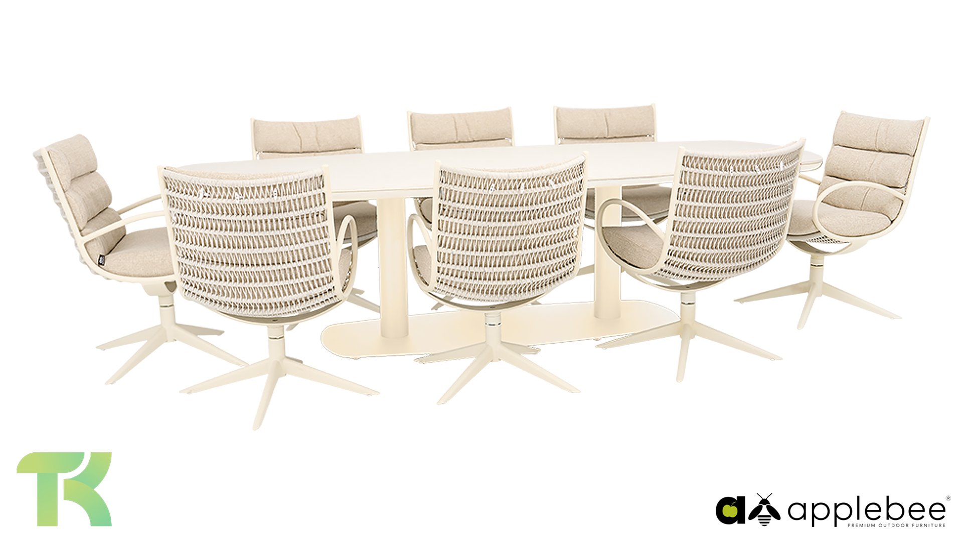 The Apple Bee Camp Bay Oyster: fresh, elegant, and comfortable. This dining set combines a refined, light color palette with smart functionality, allowing you to enjoy unparalleled comfort on long summer evenings. The organic shapes and soft hues create a haven of tranquility in the garden, while the robust materials ensure years of enjoyment.